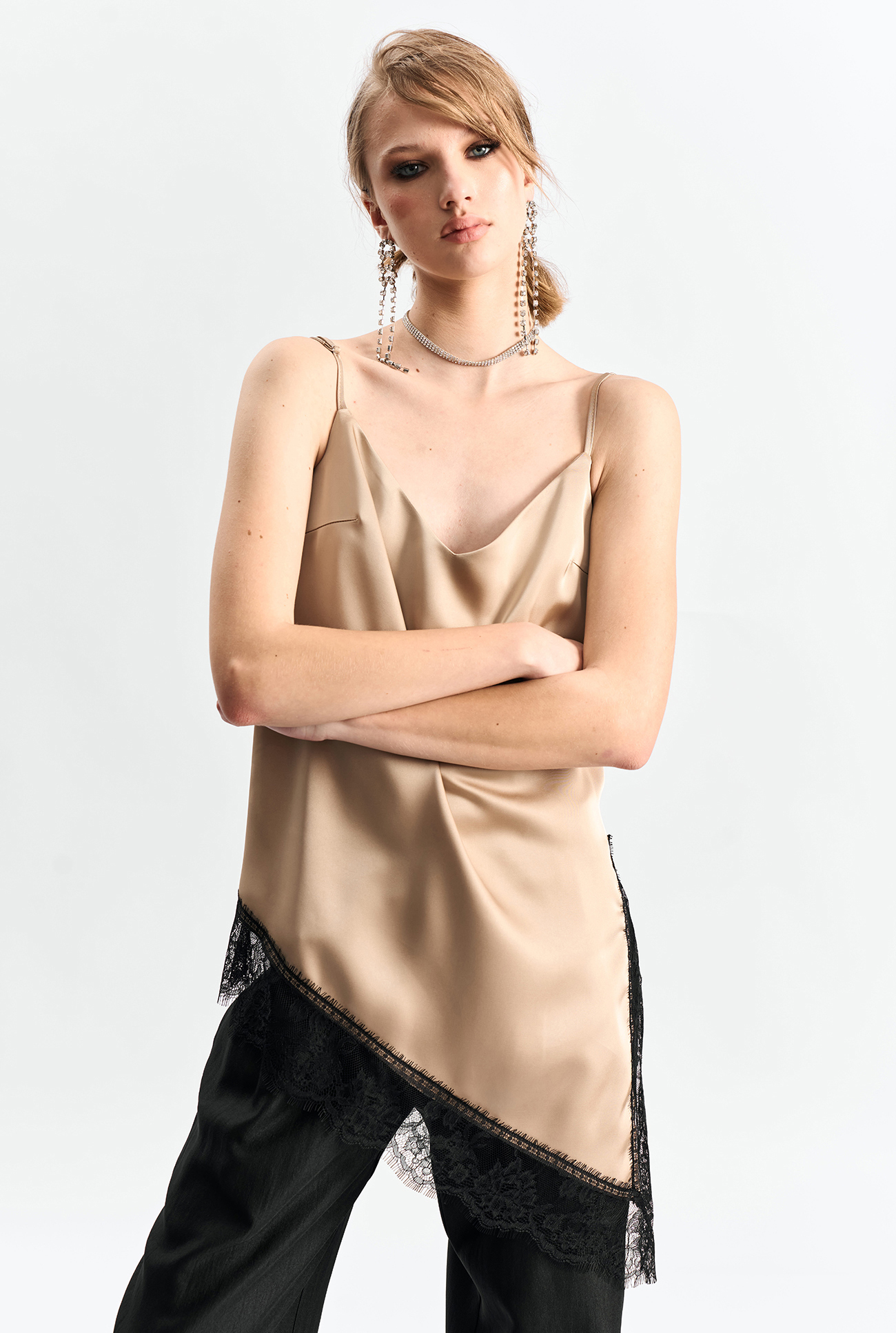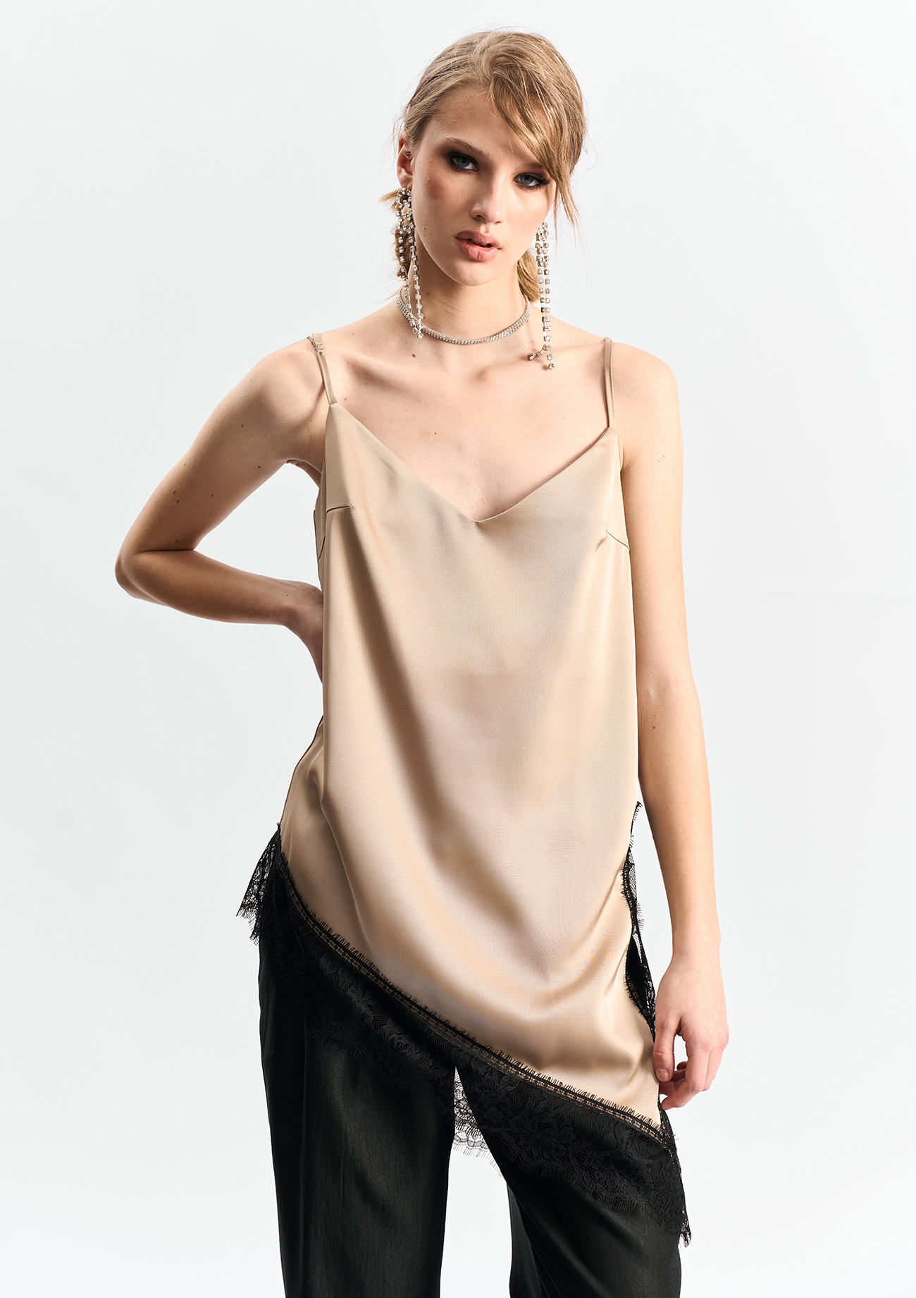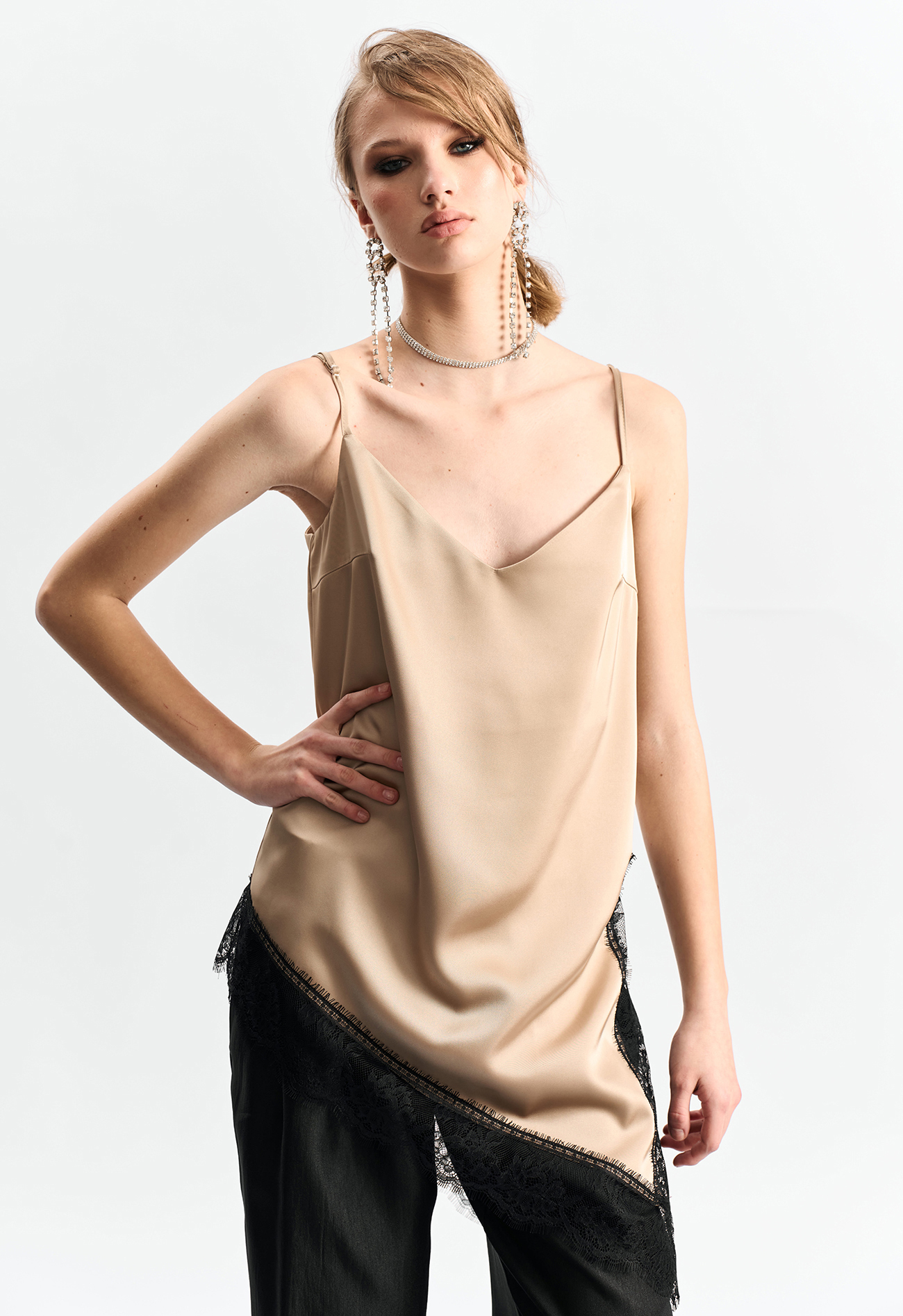 Удлиненная топ-комбинация из плотного двустороннего сатина золотого цвета. Асимметричный низ и разрез по боку. По низу - французское кружево.Состав: 100% полиэстер