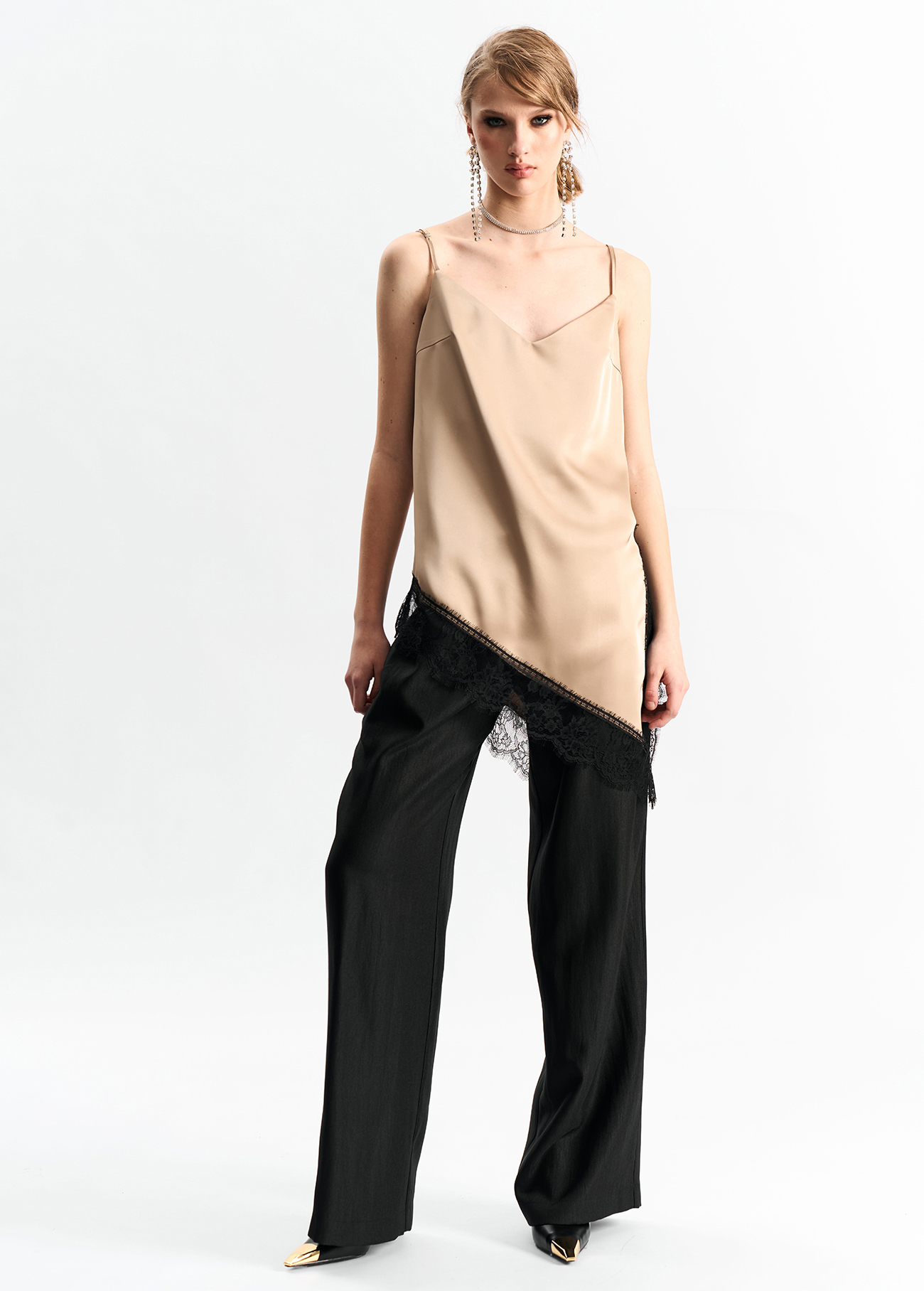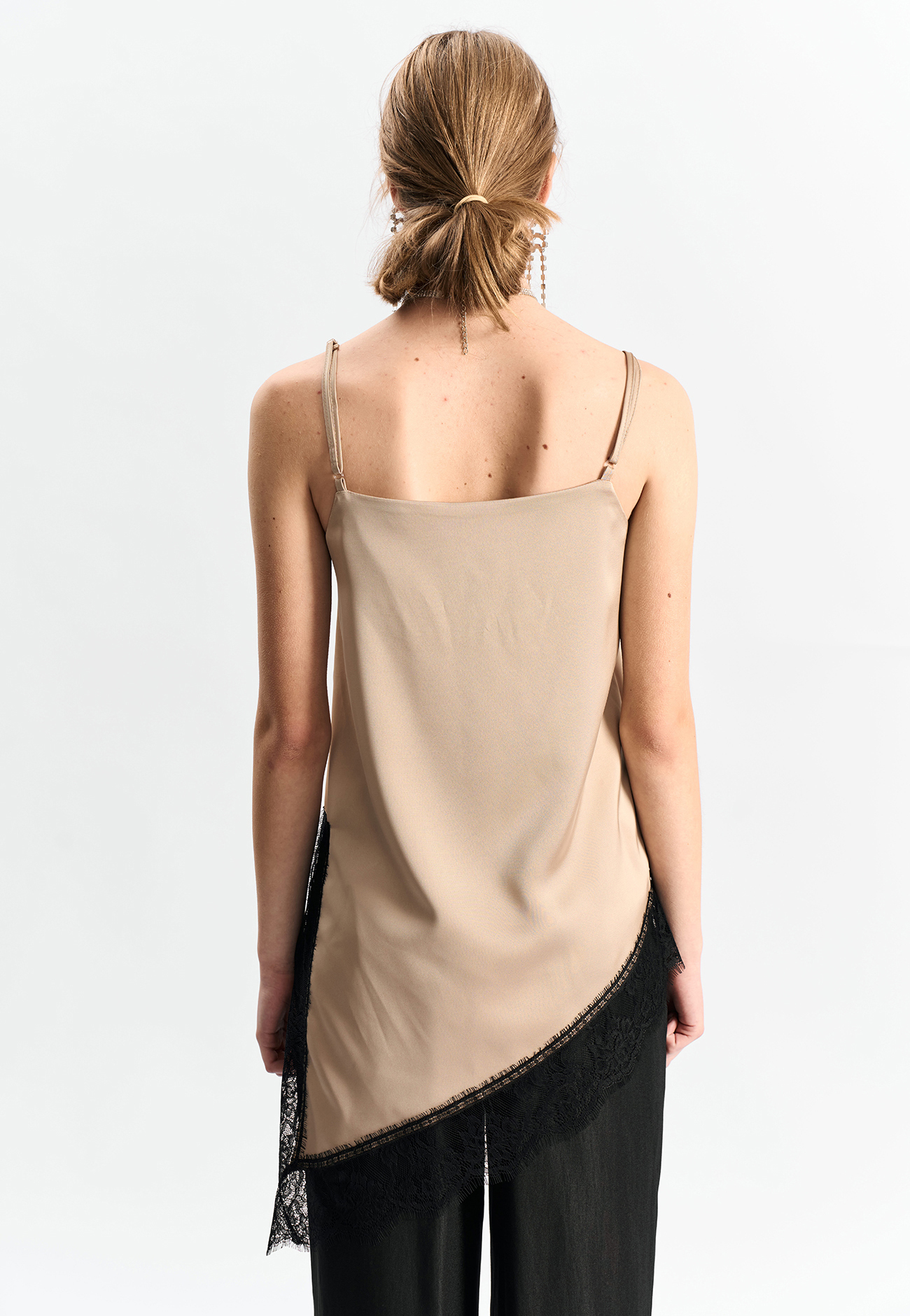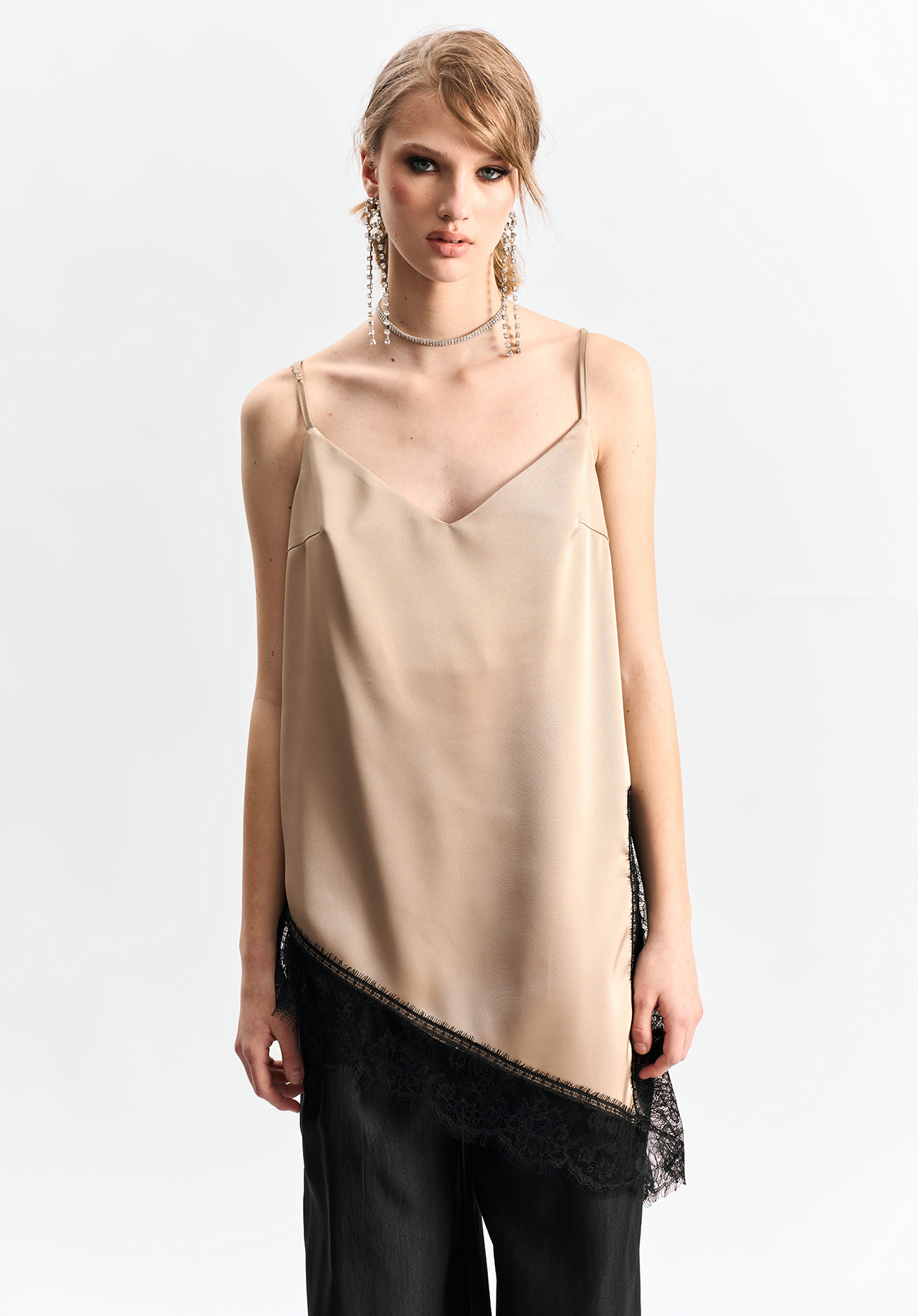 Удлиненная топ-комбинация из плотного двустороннего сатина золотого цвета. Асимметричный низ и разрез по боку. По низу - французское кружево.Состав: 100% полиэстер