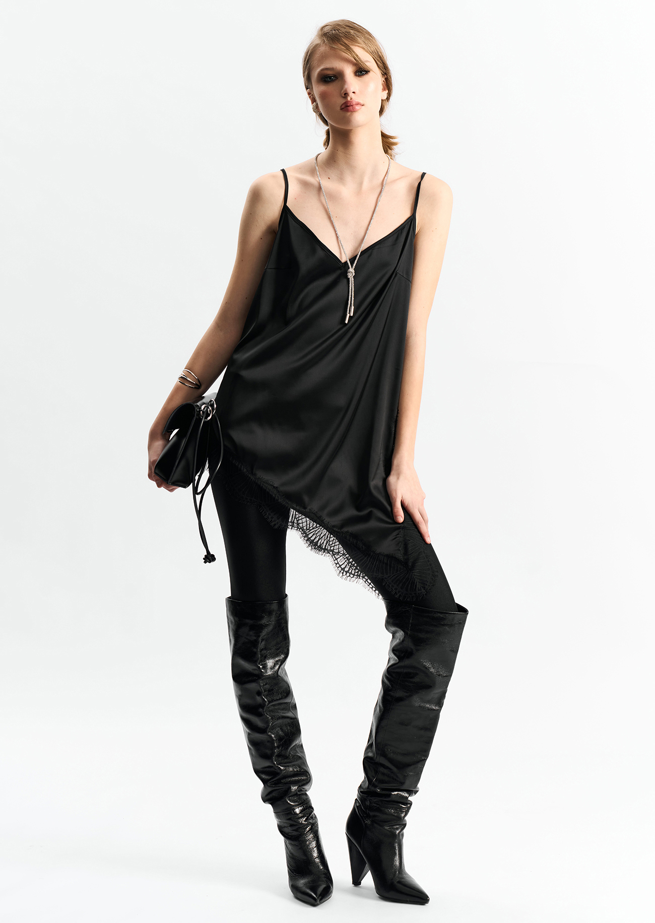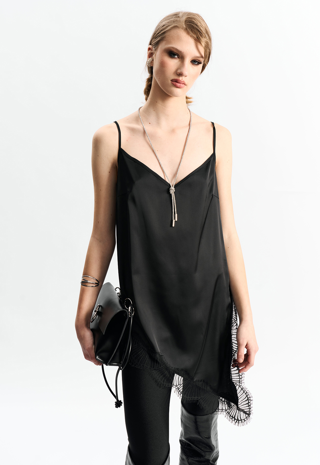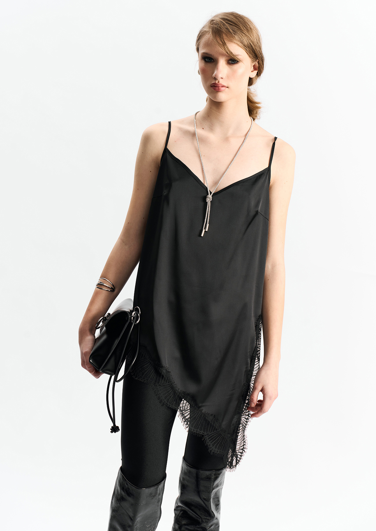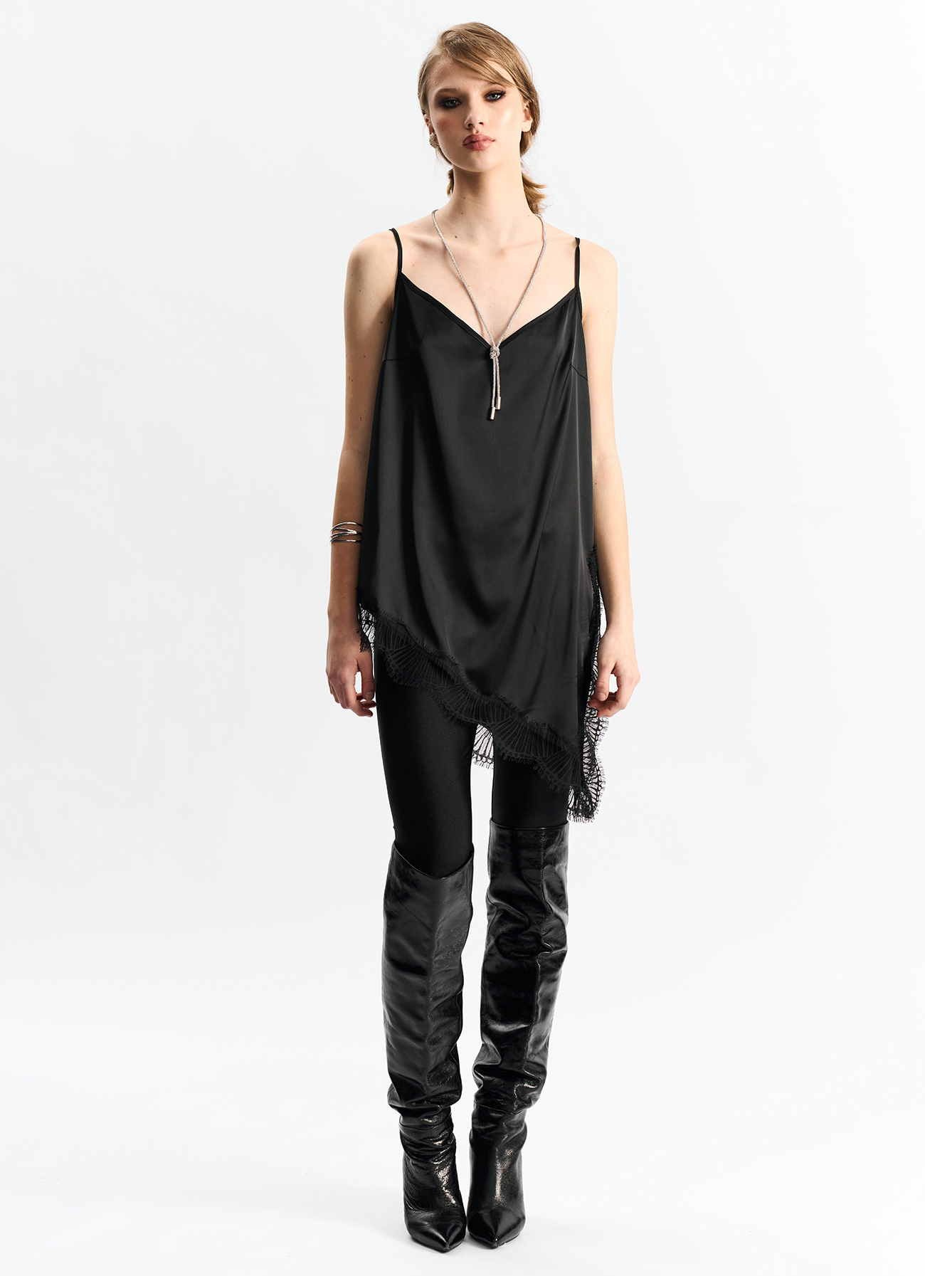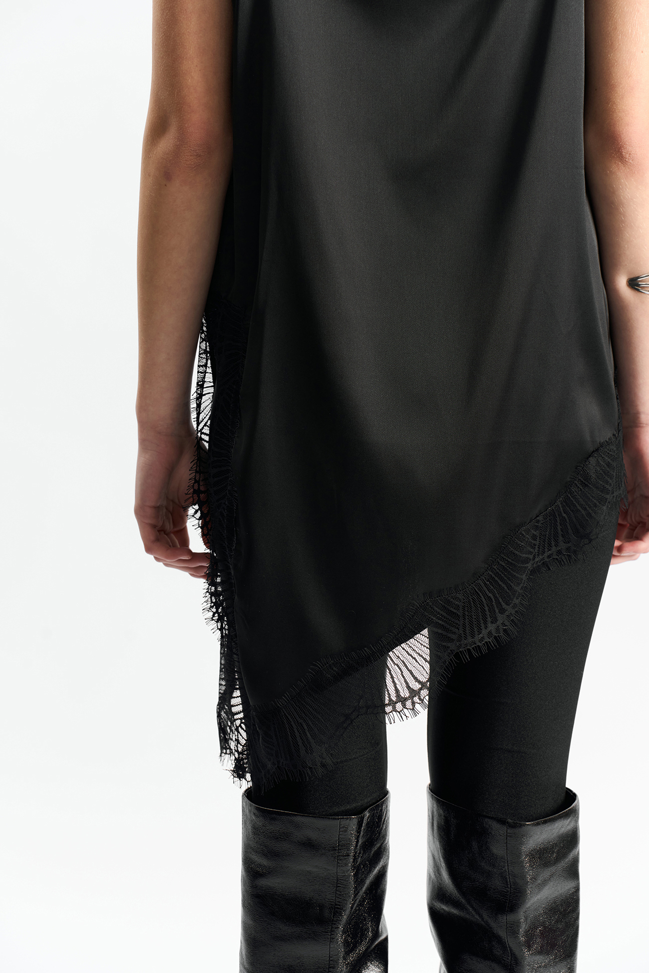 Удлиненная топ-комбинация из атласа черного цвета. Асимметричный низ и разрез по боку. По низу - французское кружево.Состав: 100% полиэстер