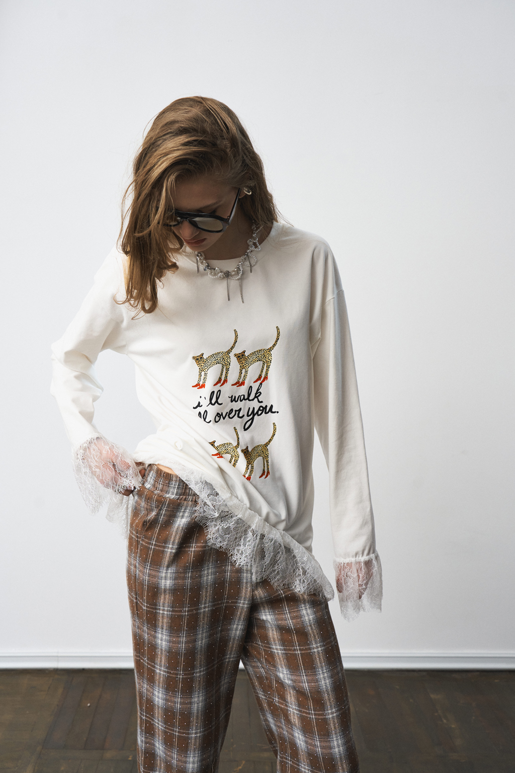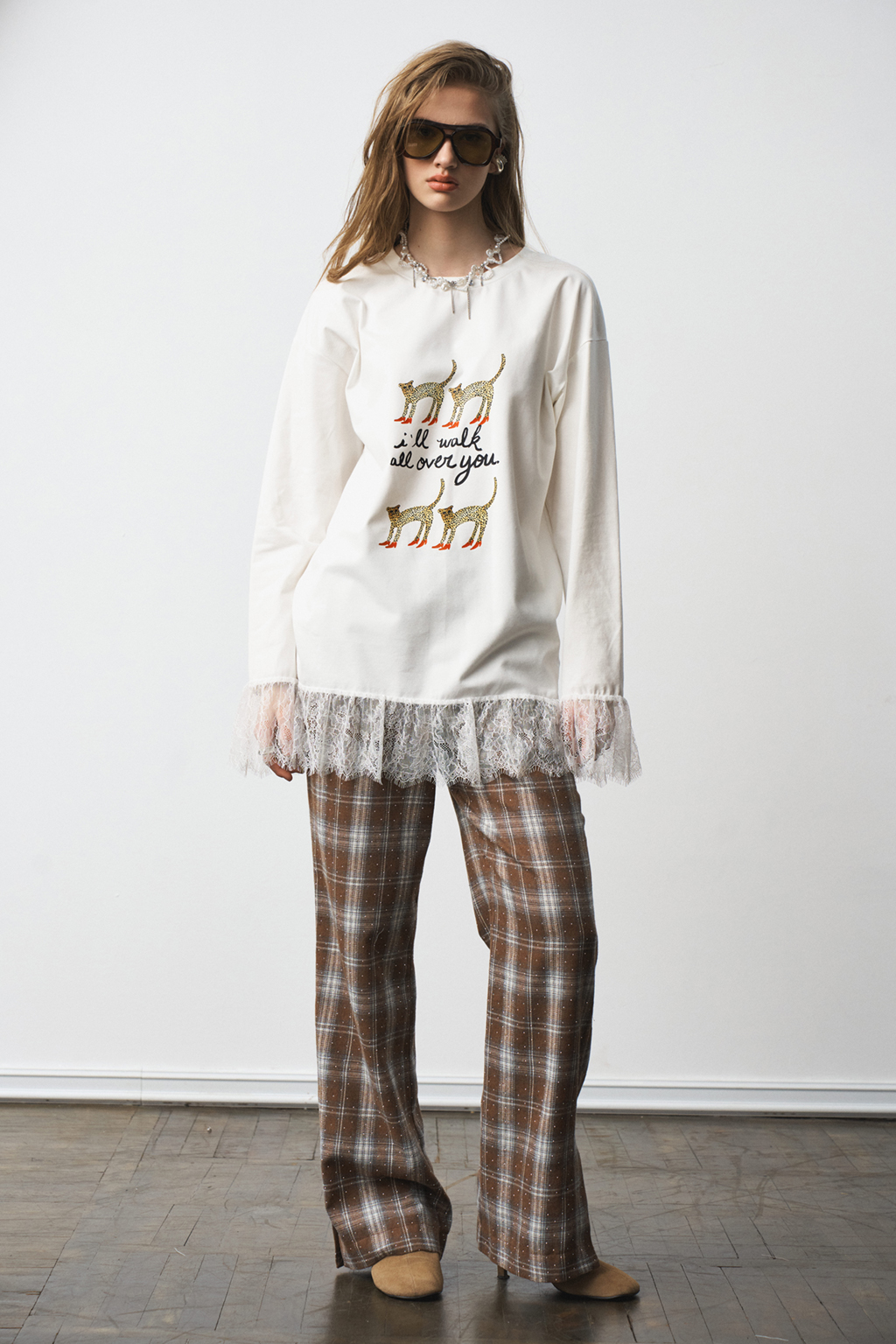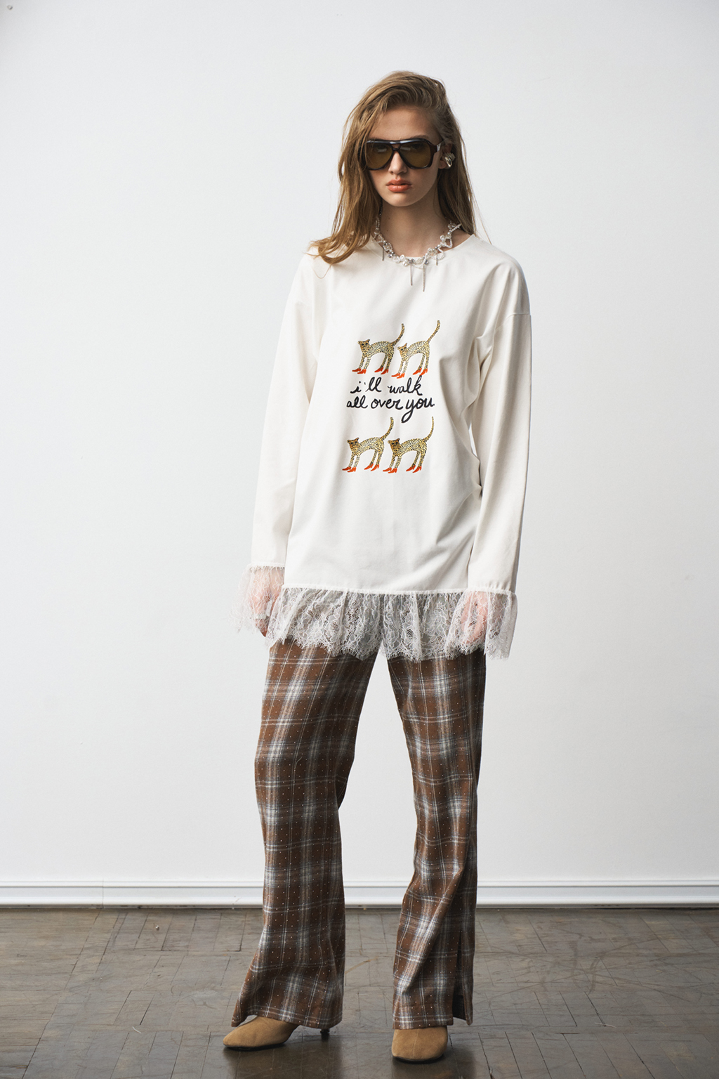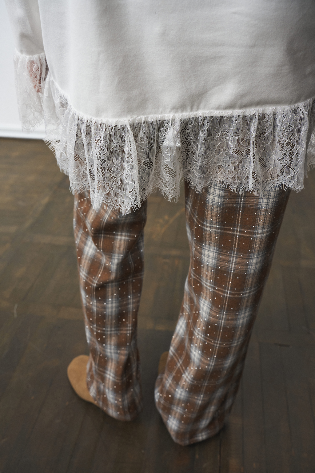Брюки-палаццо с резинкой на поясе и разрезами снизу. Карманы в боковых швах. Материал - фланель со стразами.