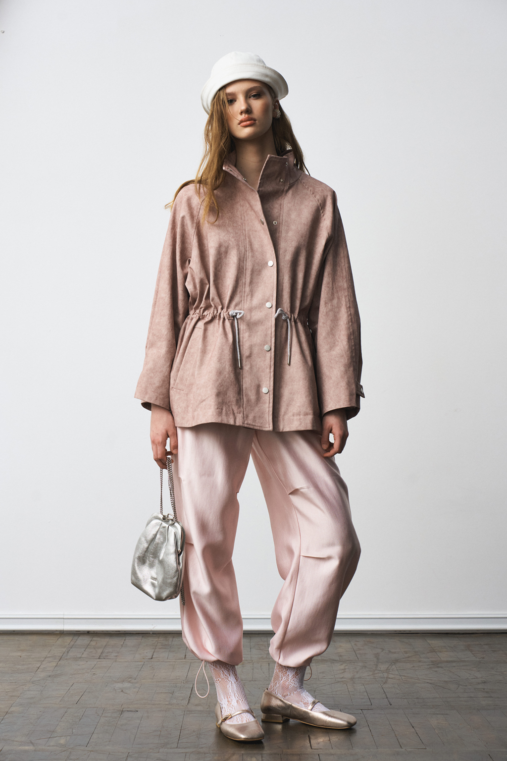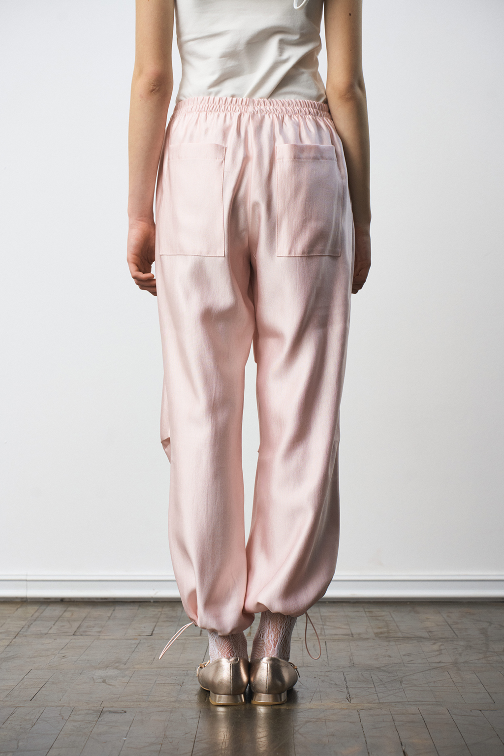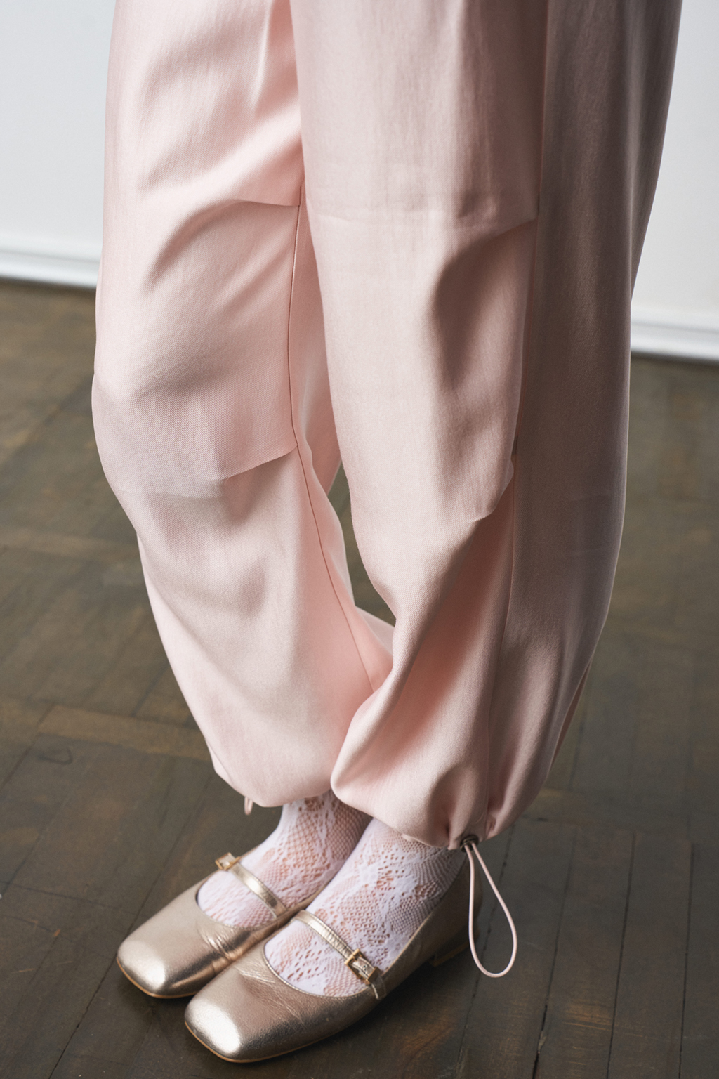 Брюки свободного силуэта со складками в области колена, карманы в боковых швах. По низу брюки собраны резинкой с регулятором ширины.