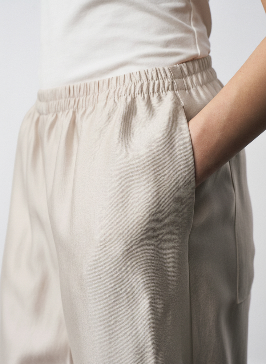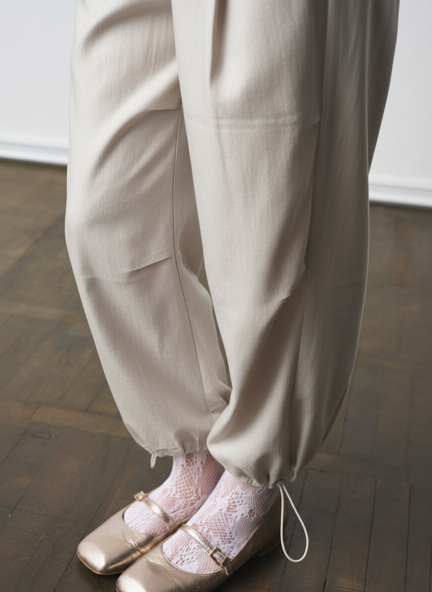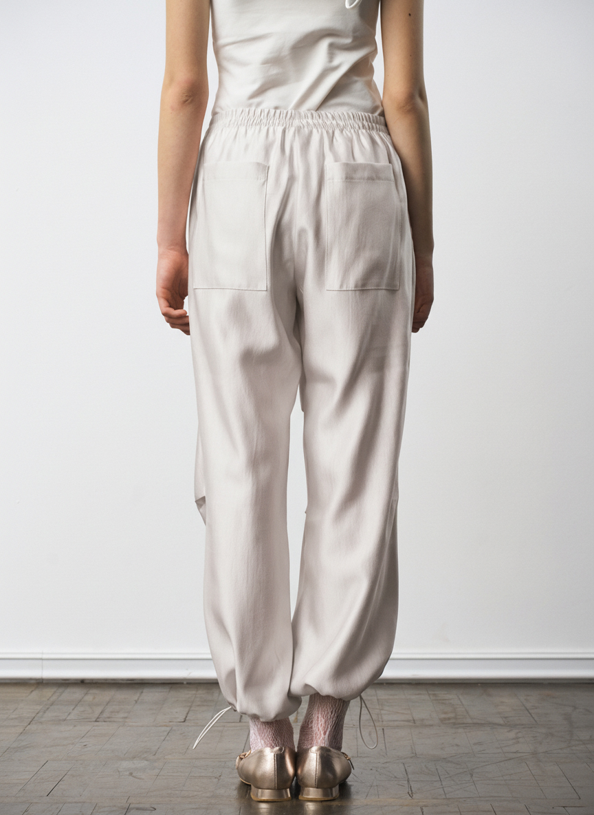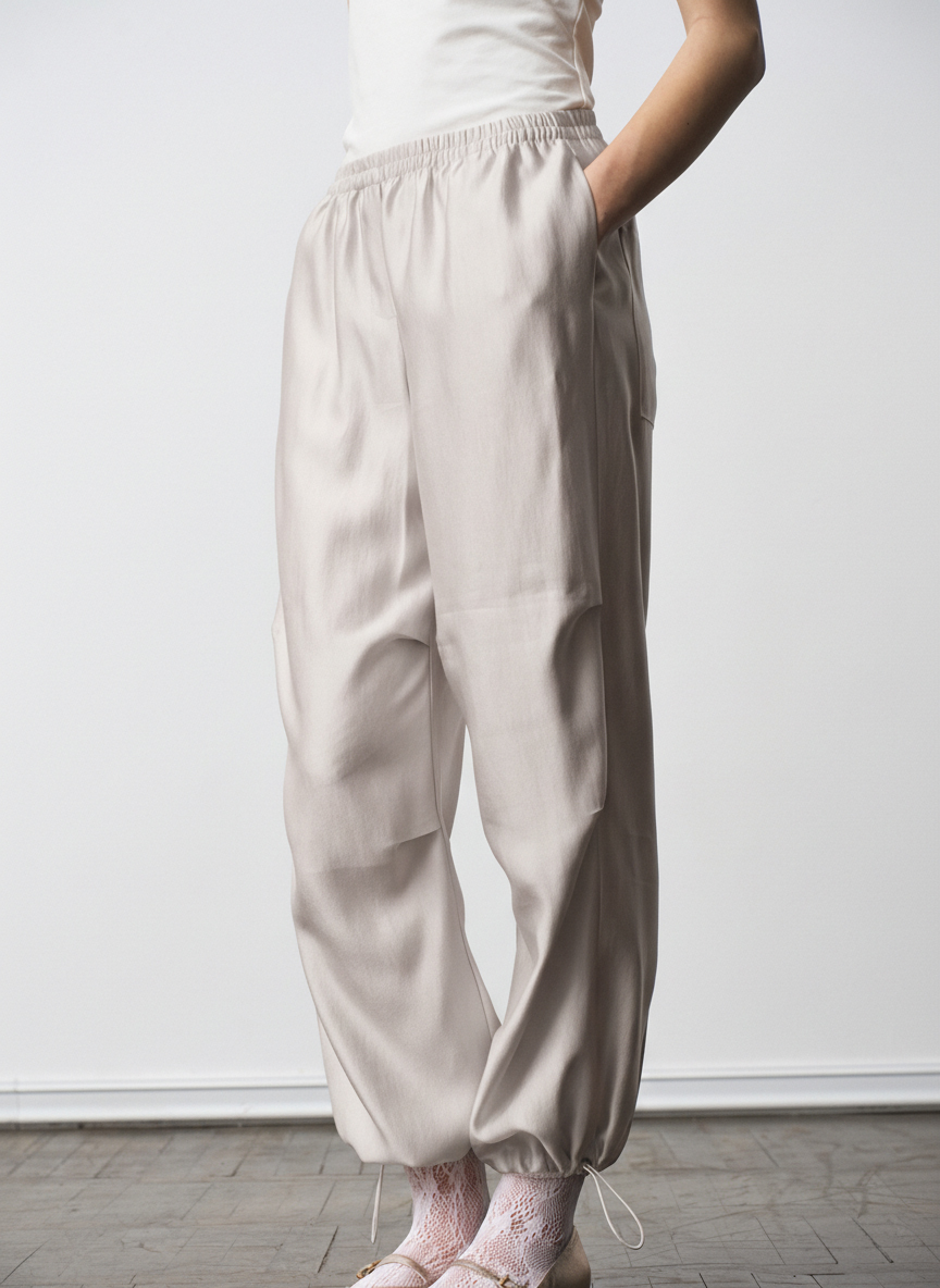 Брюки свободного силуэта со складками в области колена, карманы в боковых швах. По низу брюки собраны резинкой с регулятором ширины.