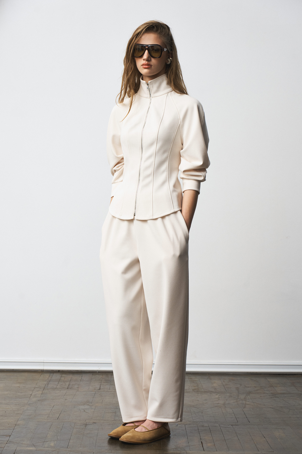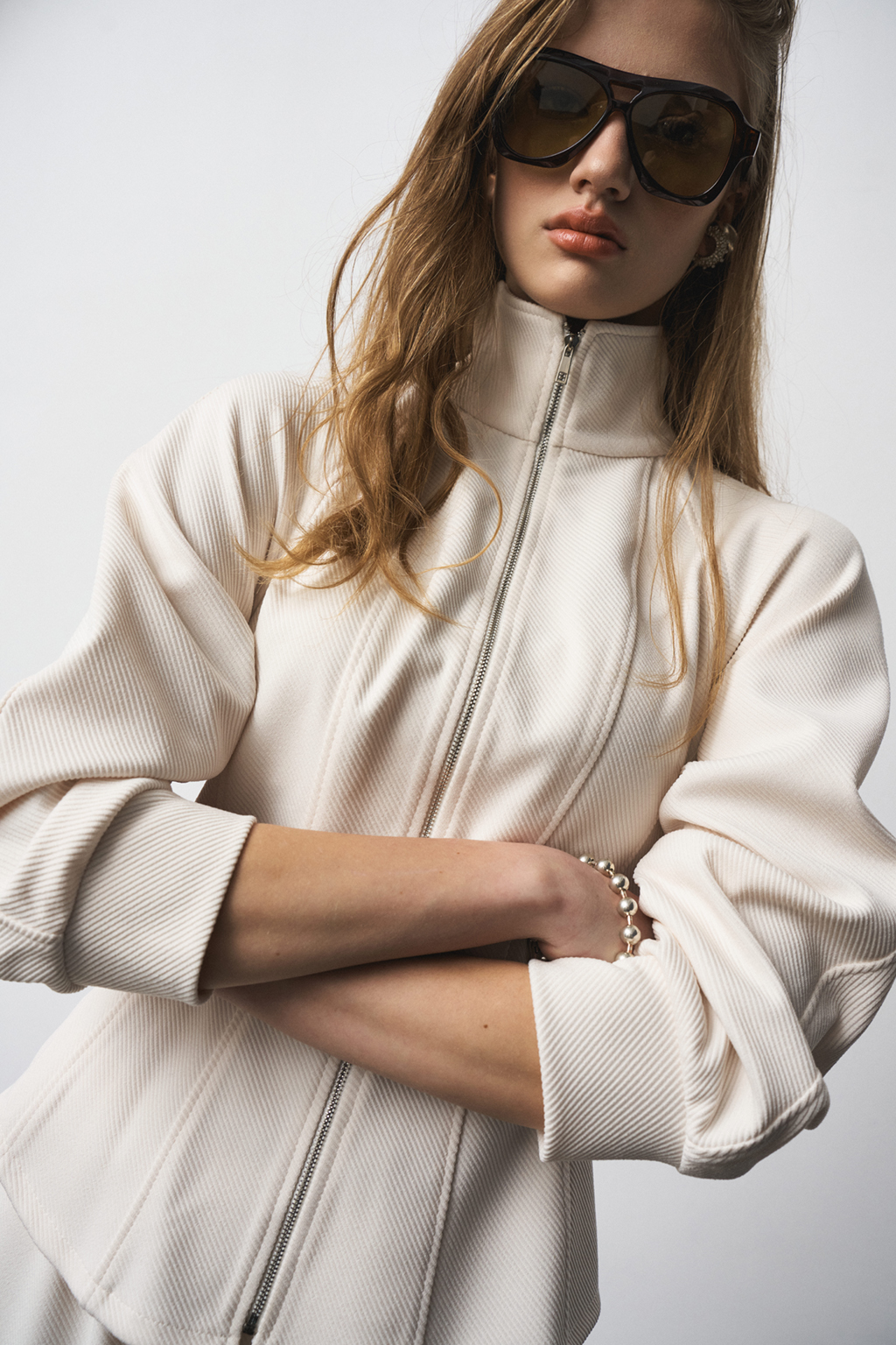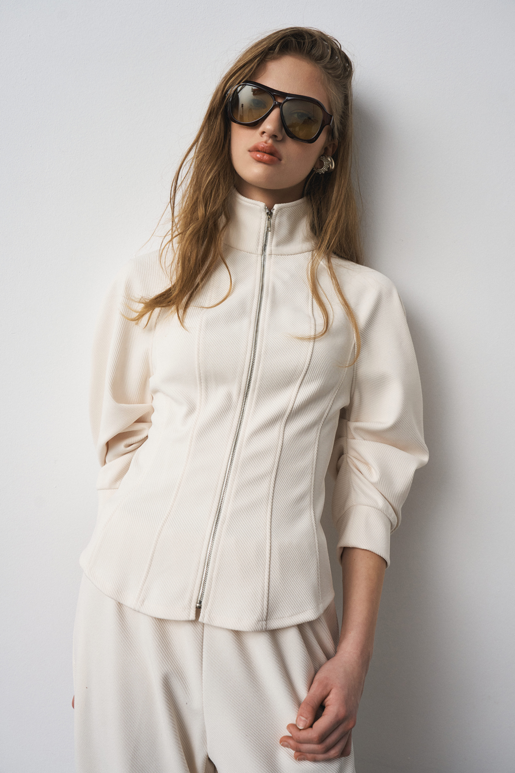 Джемпер прилегающего силуэта с воротником-стойкой, по рукаву заложенны конструктивные складки, образующие сборку. Застежка - на металлическую молнию. Материал - плотный трикотаж в рубчик.