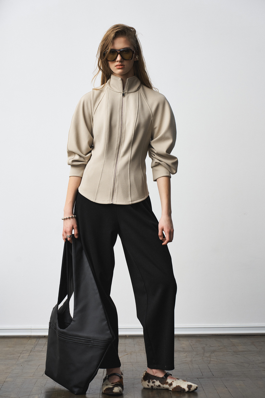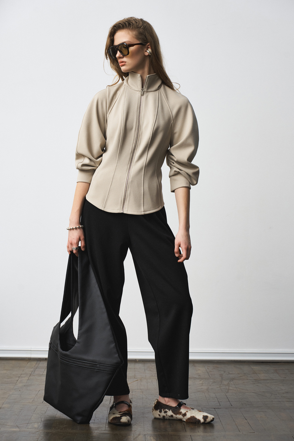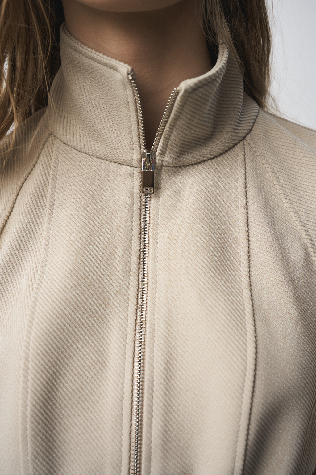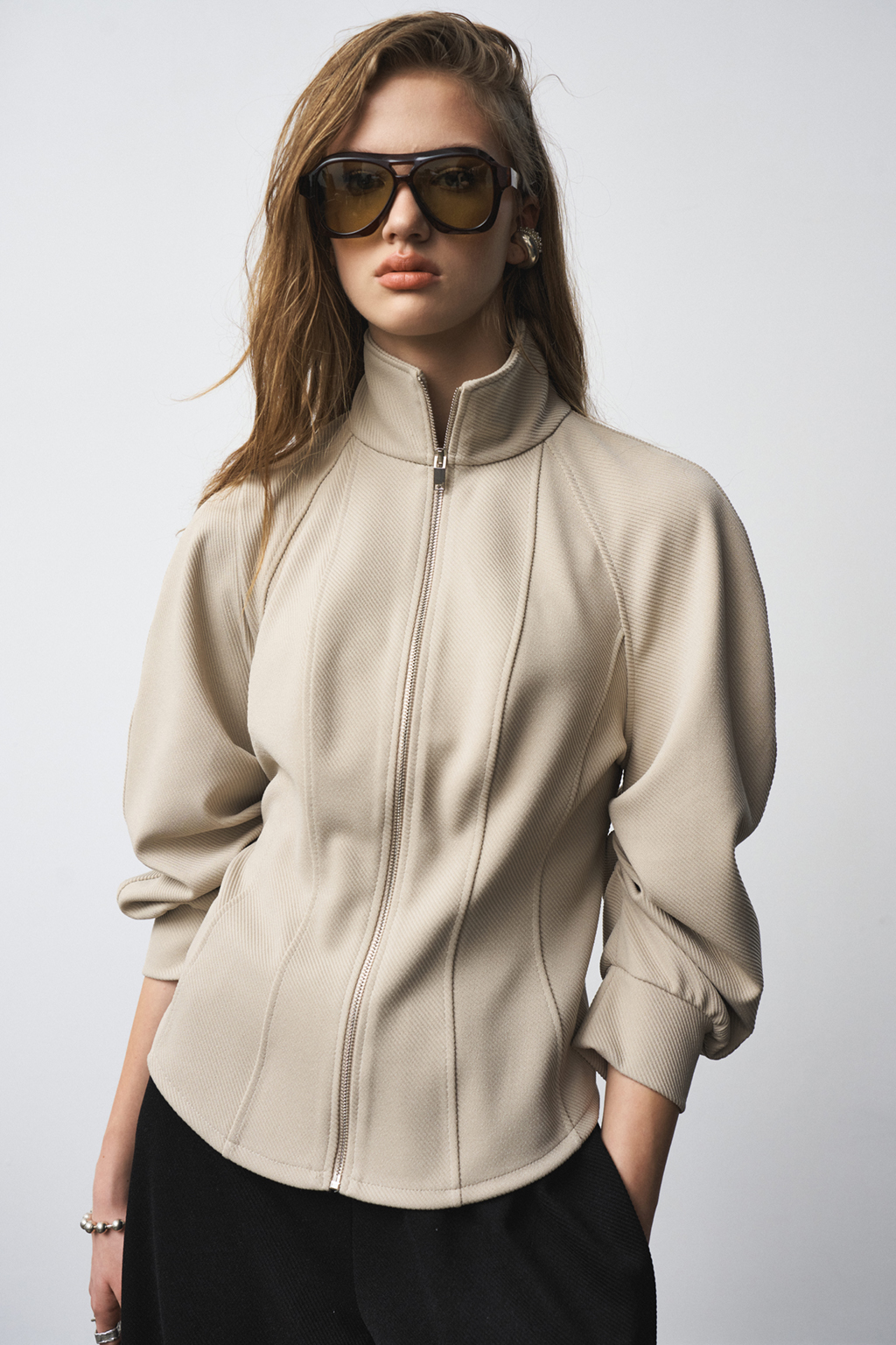 Джемпер прилегающего силуэта с воротником-стойкой, по рукаву заложенны конструктивные складки, образующие сборку. Застежка - на металлическую молнию. Материал - плотный трикотаж в рубчик.