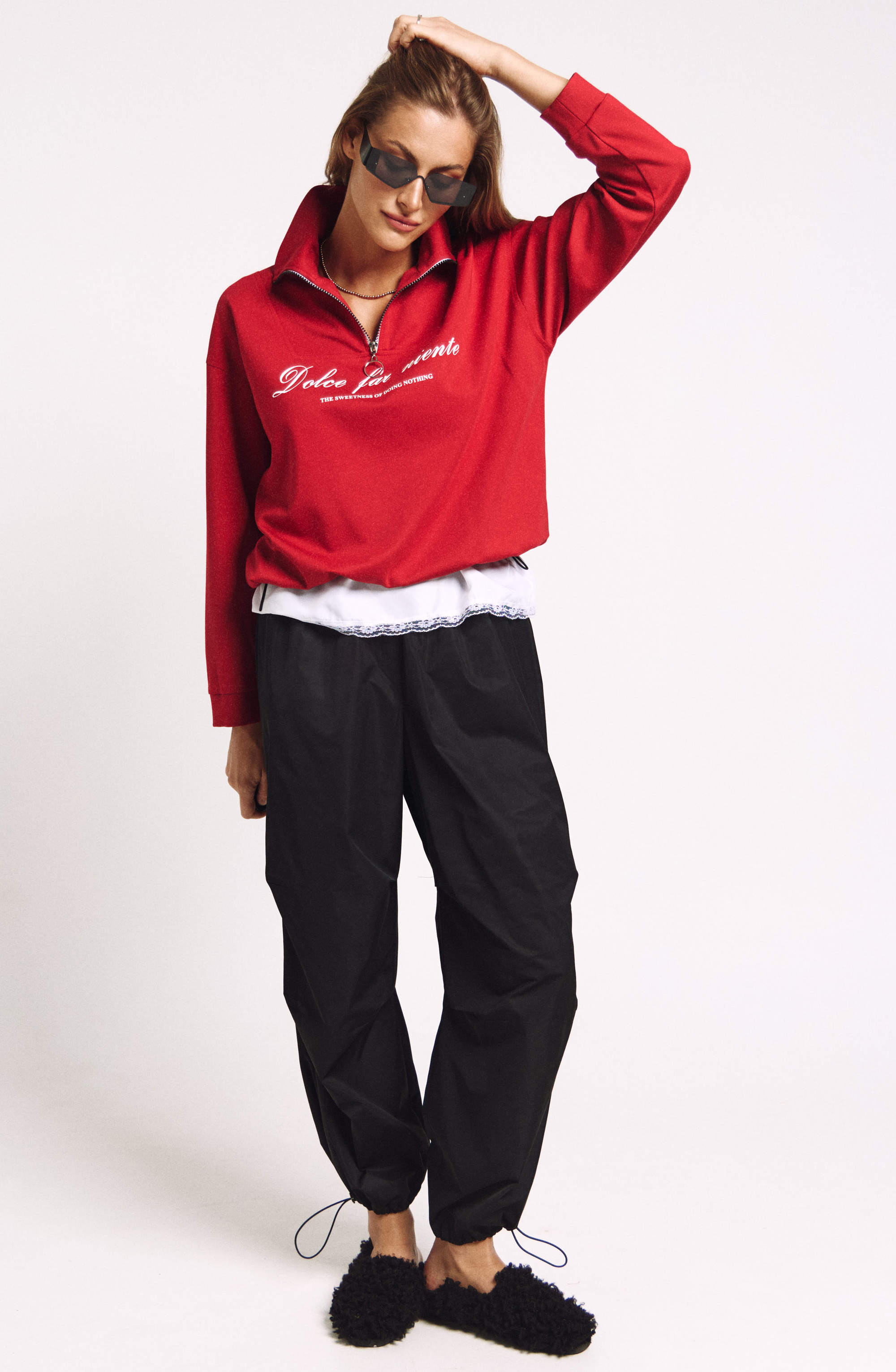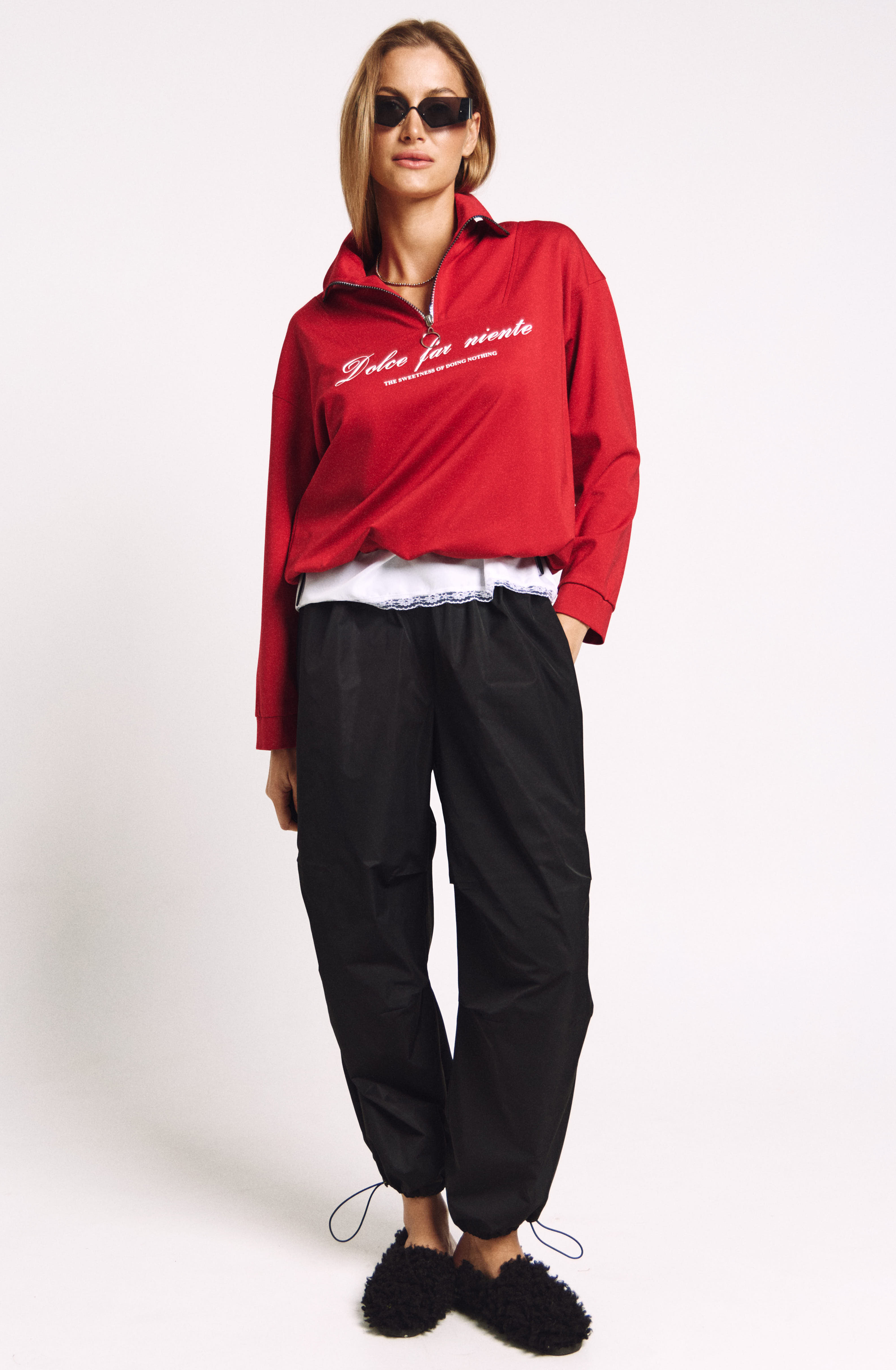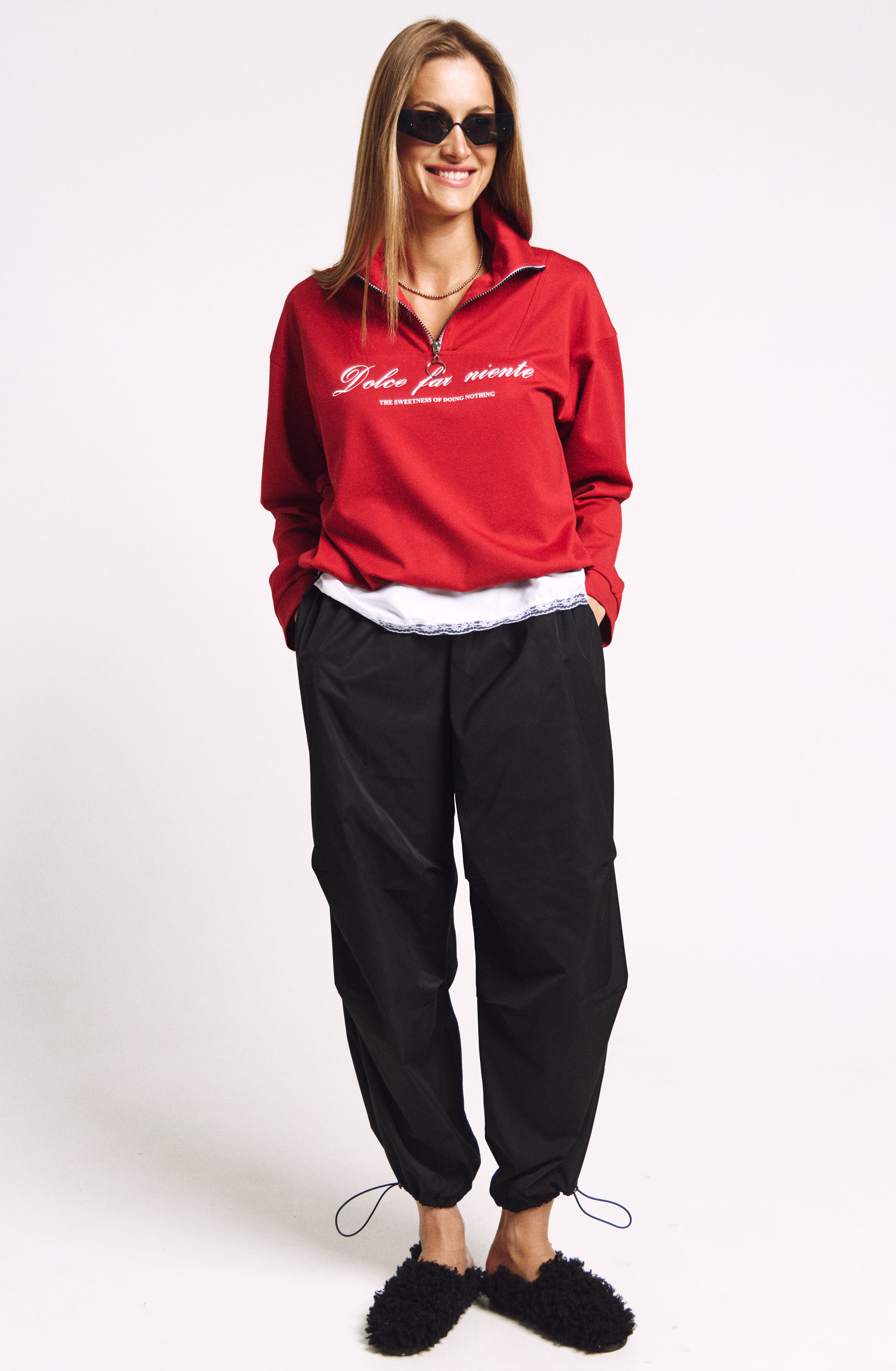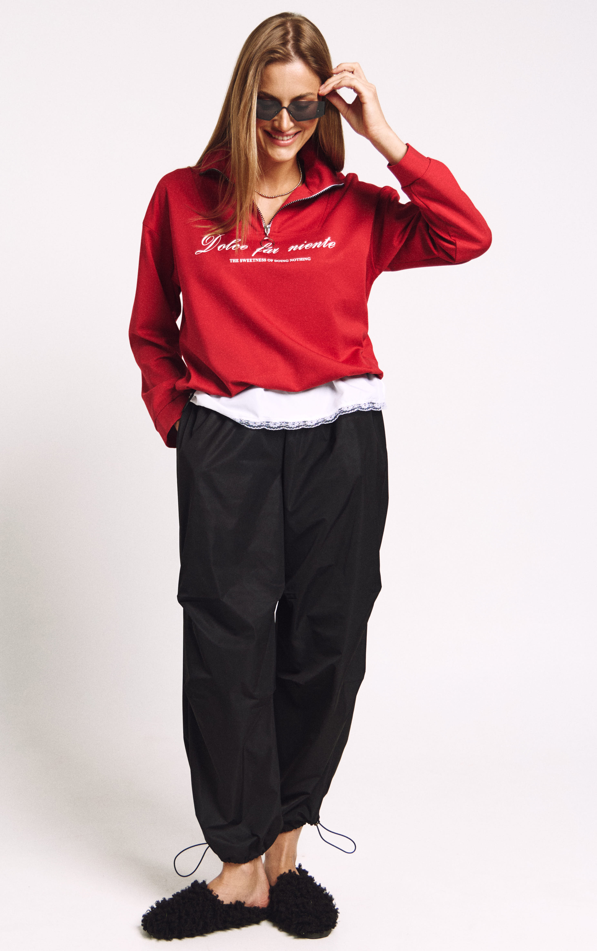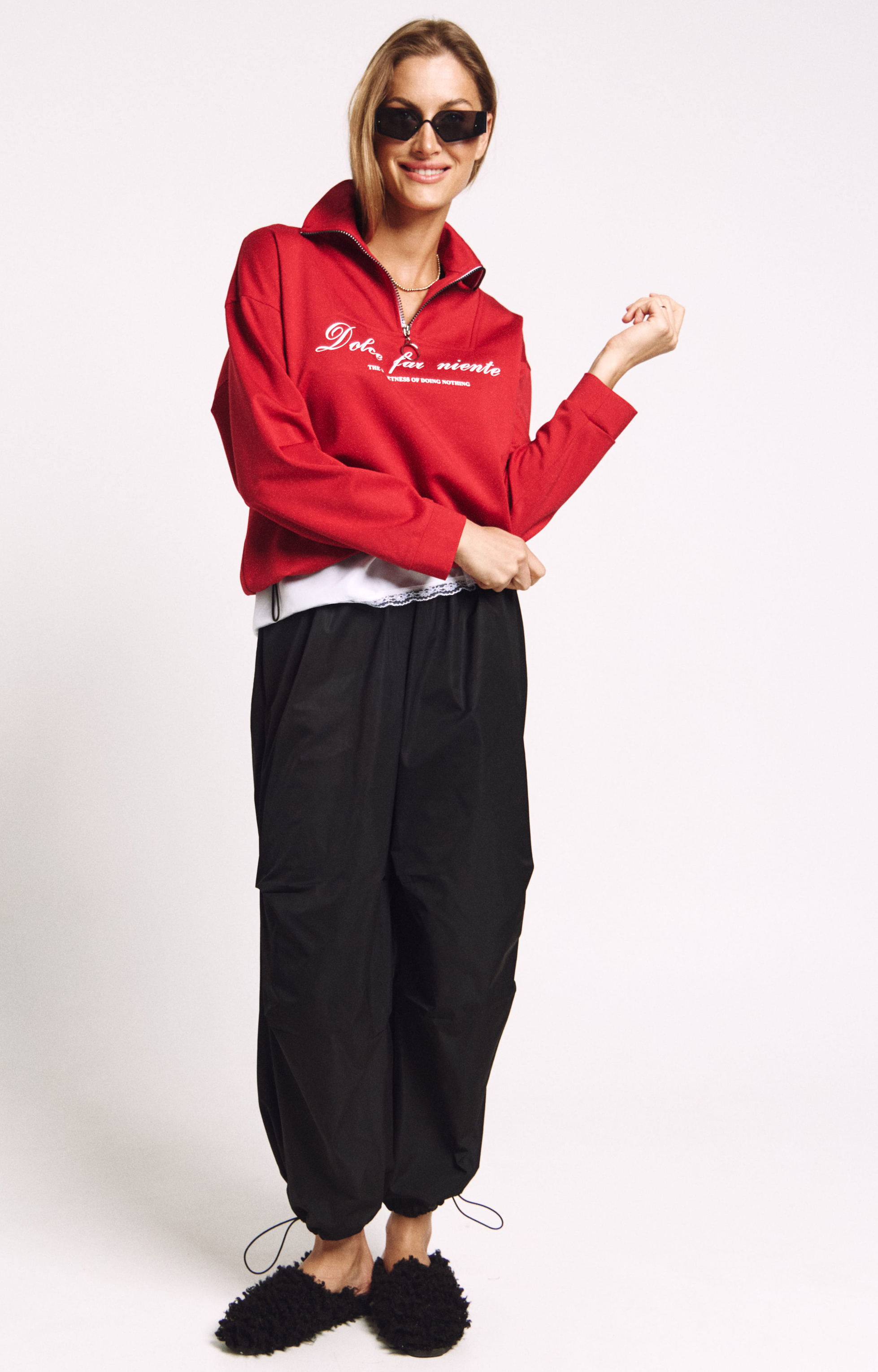 Джемпер в правильном красном цвете "скарлетт" со стойкой и молнией.