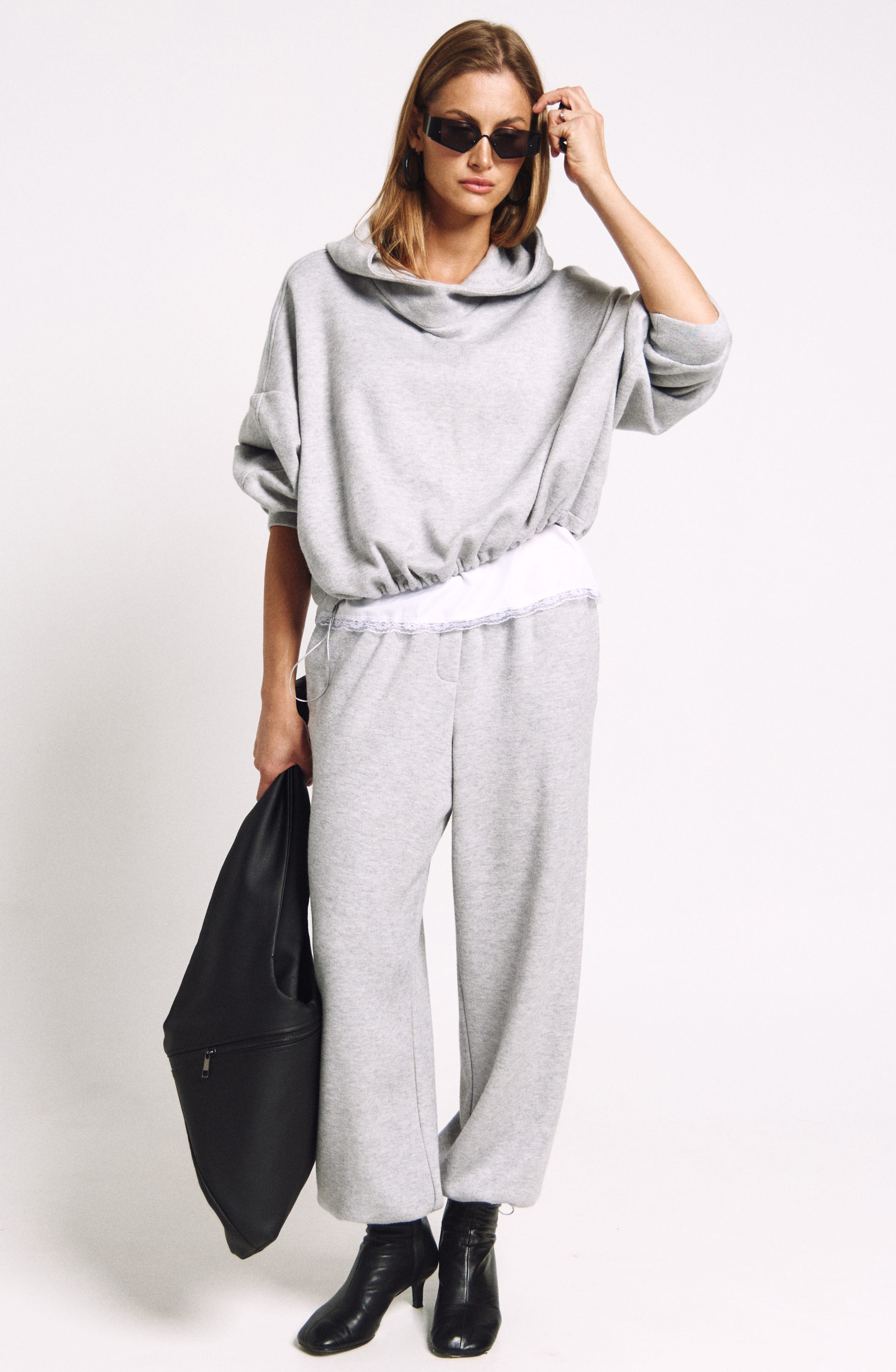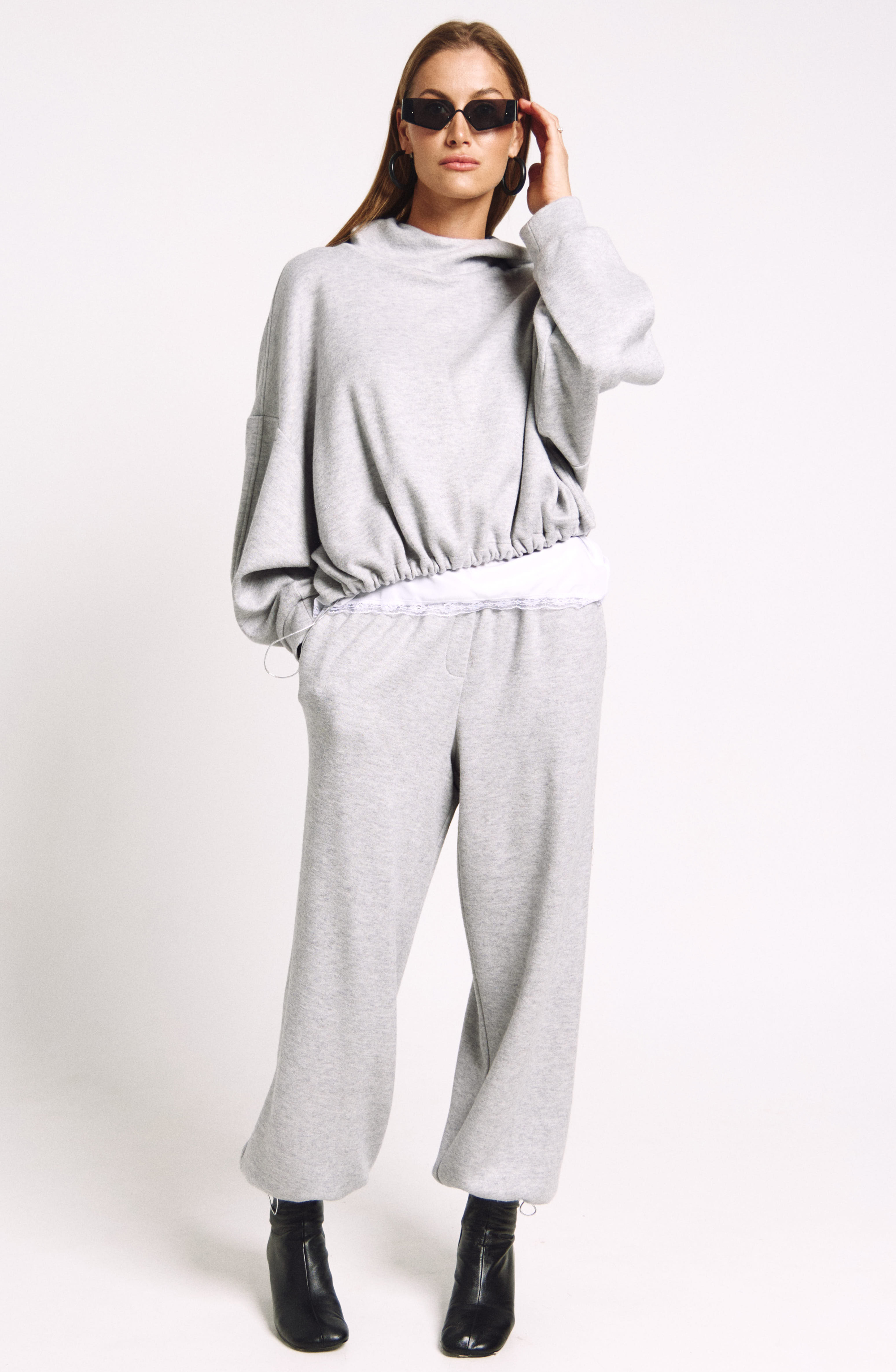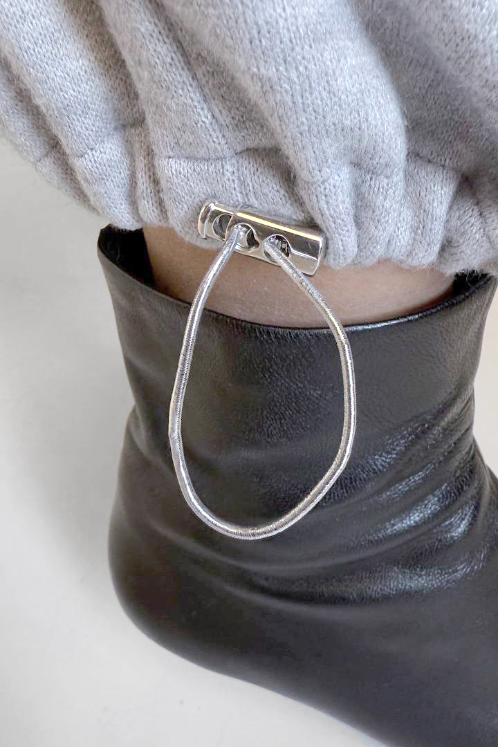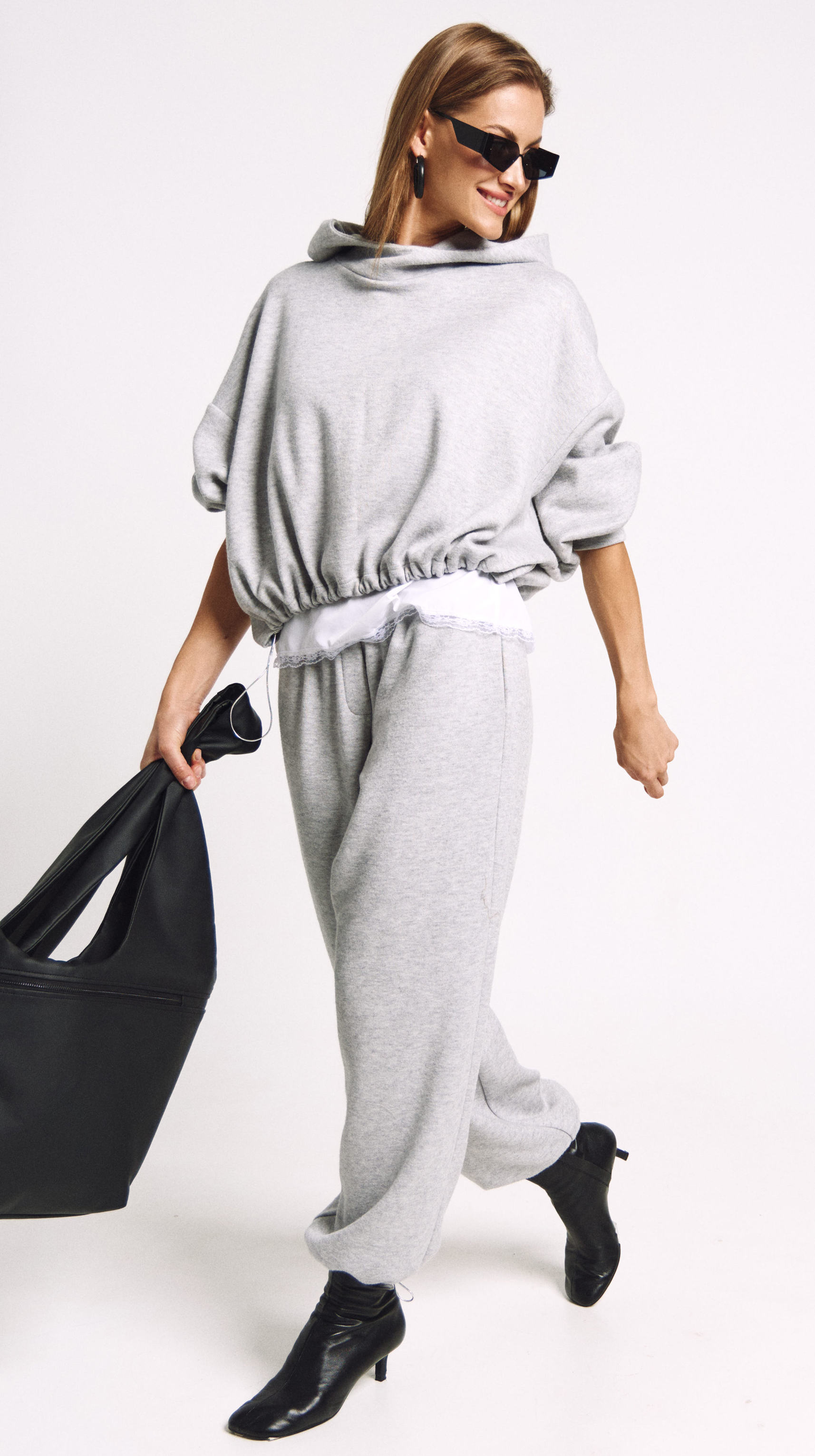 Джоггеры из мягкого трикотажа, в классическом сером. Джоггеры умеренного объема. По низу ширина регулируется металлизированной резинкой и фиксаторами.
