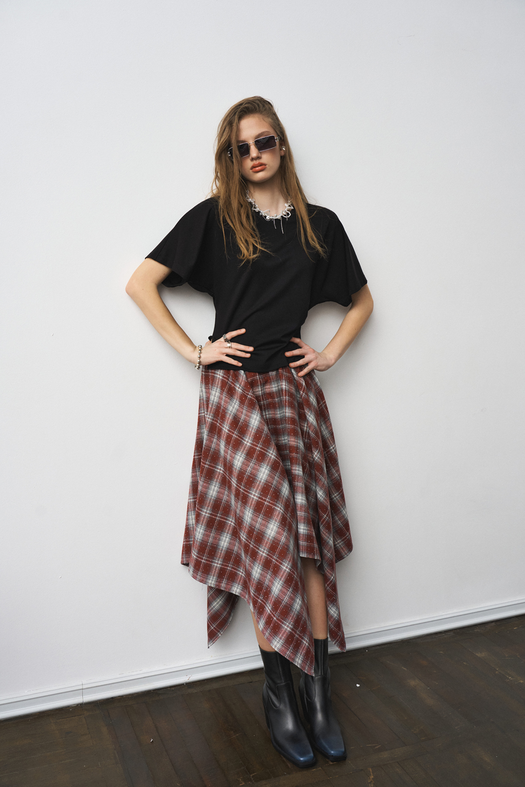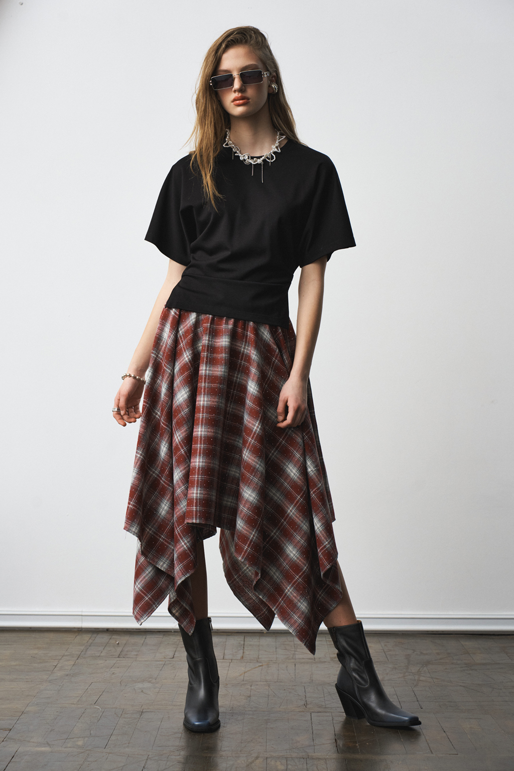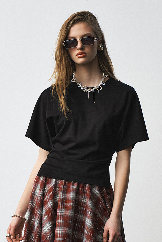 Футболка прилегающая по талии с разрезами по боковым швам и декоративными складками по талии.