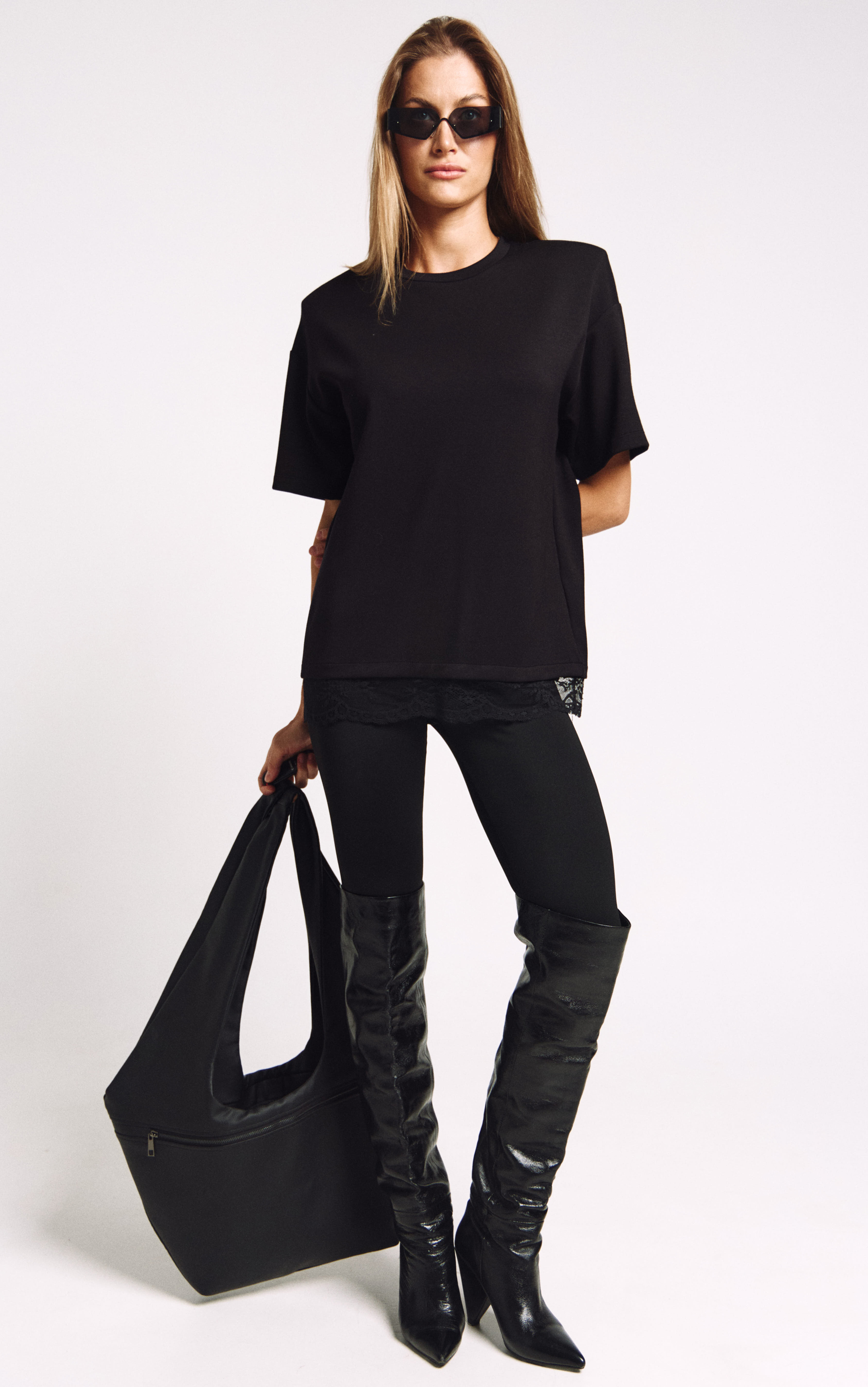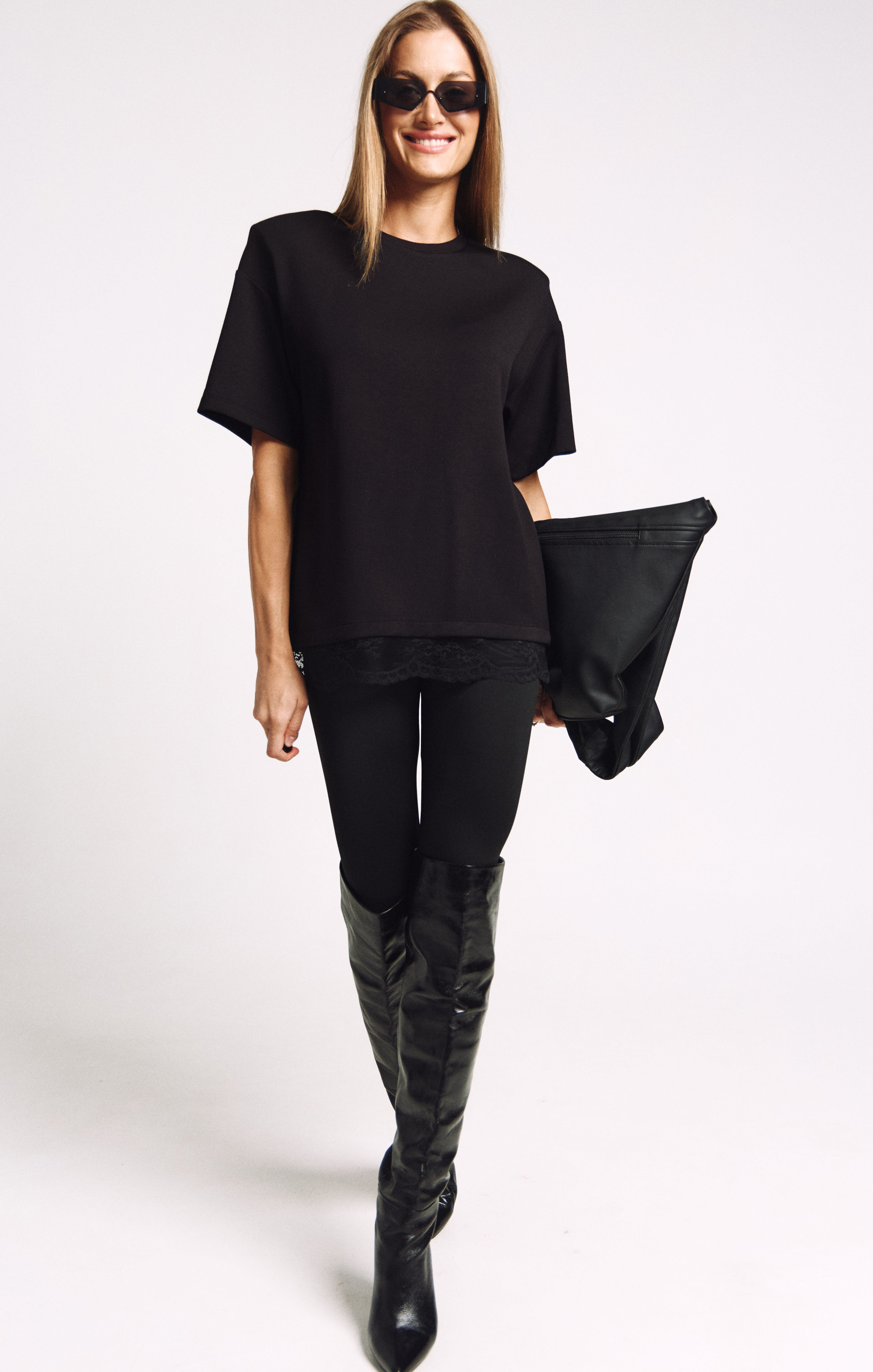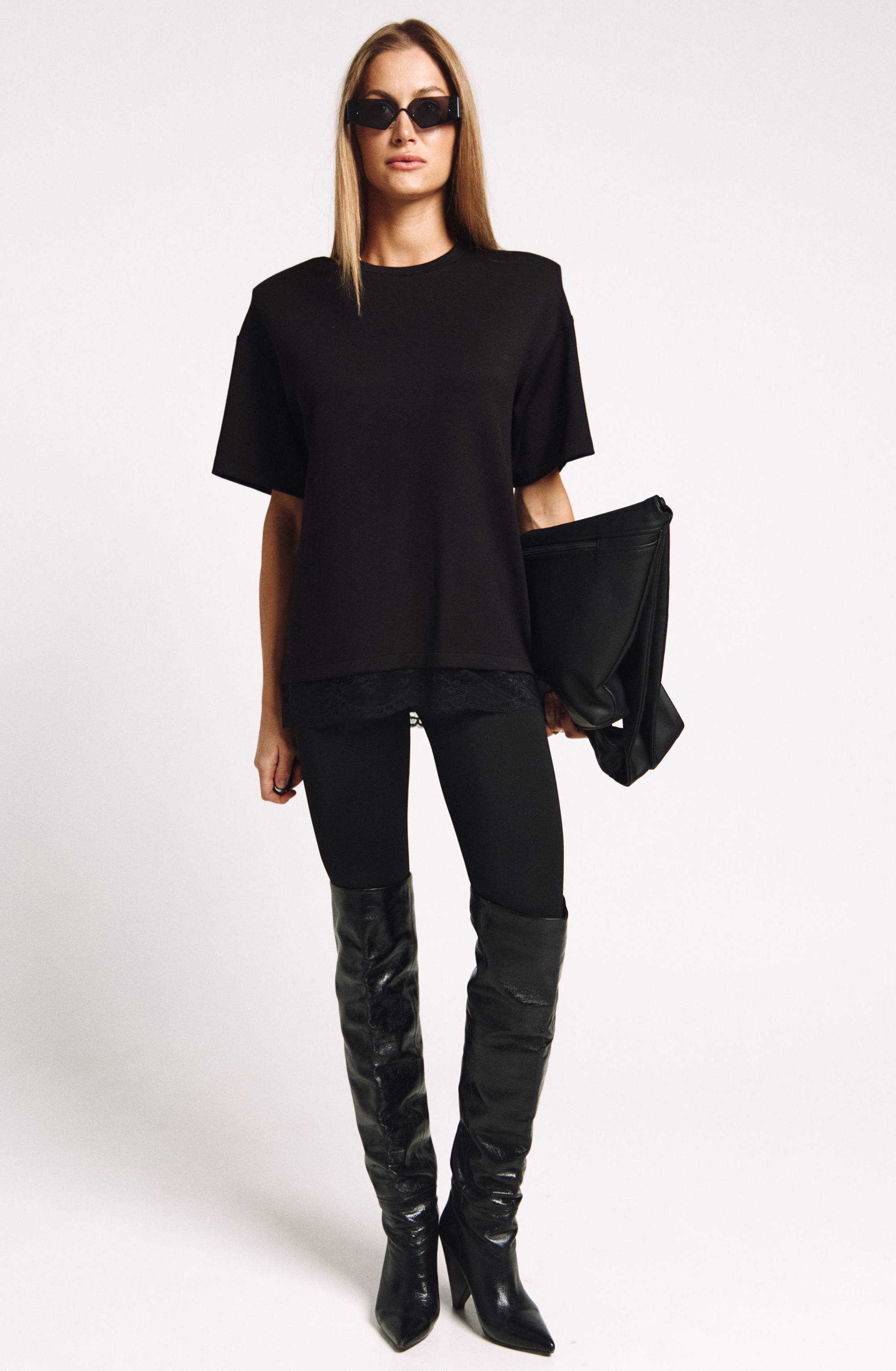 Футболка женская, удлиненная, из плотного трикотажа, с декоративными плечами и француским кружевом по низу.