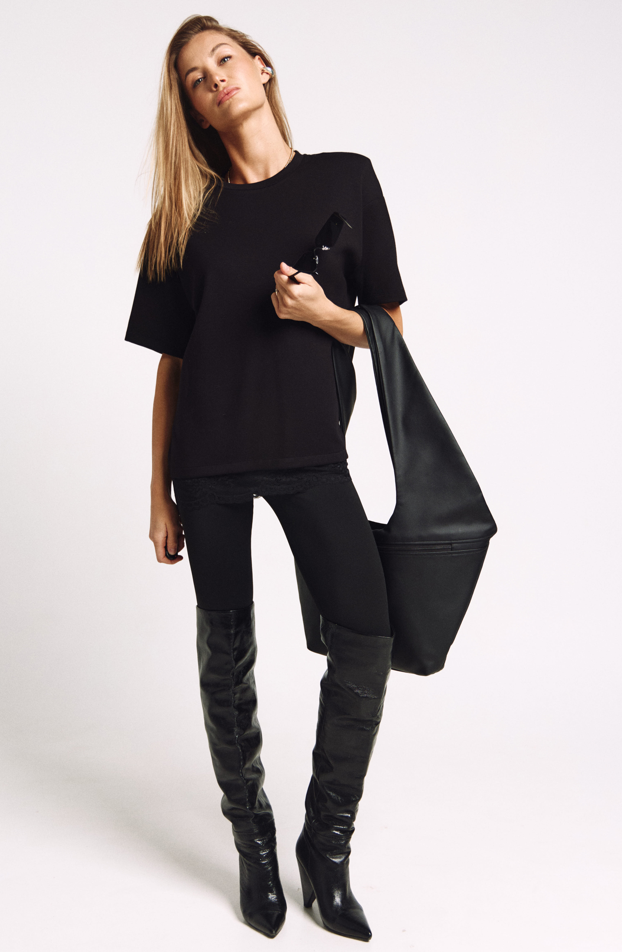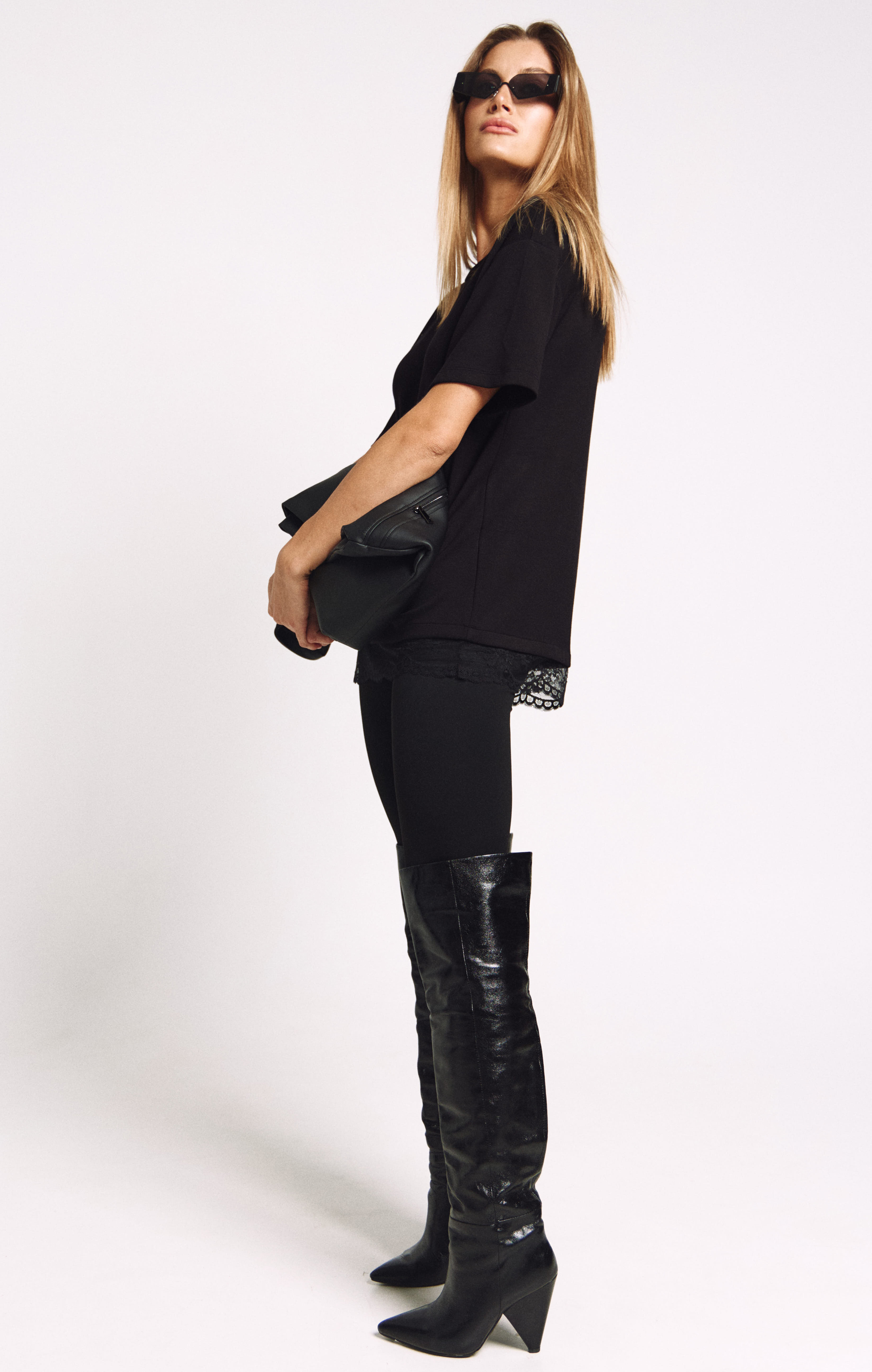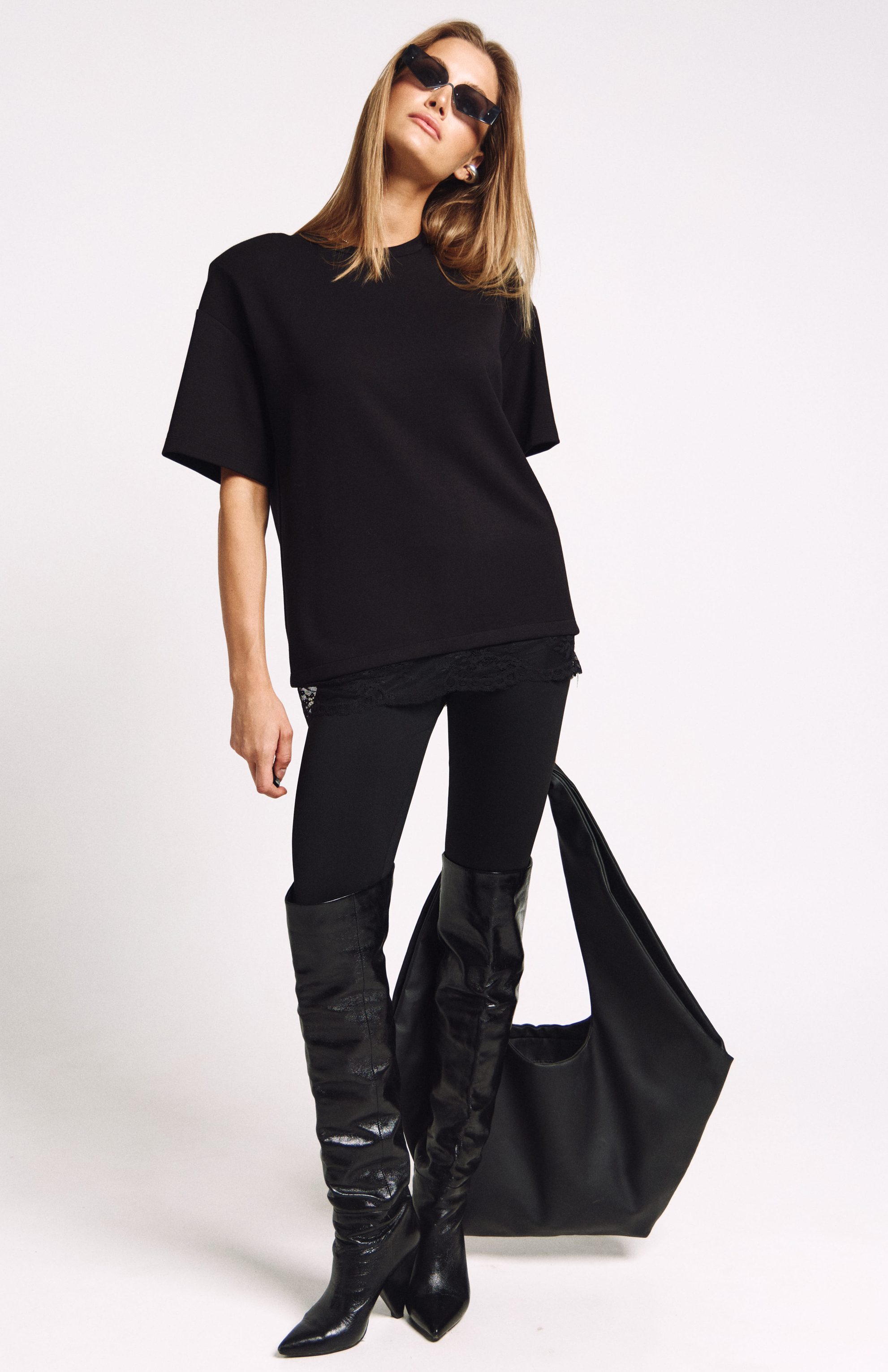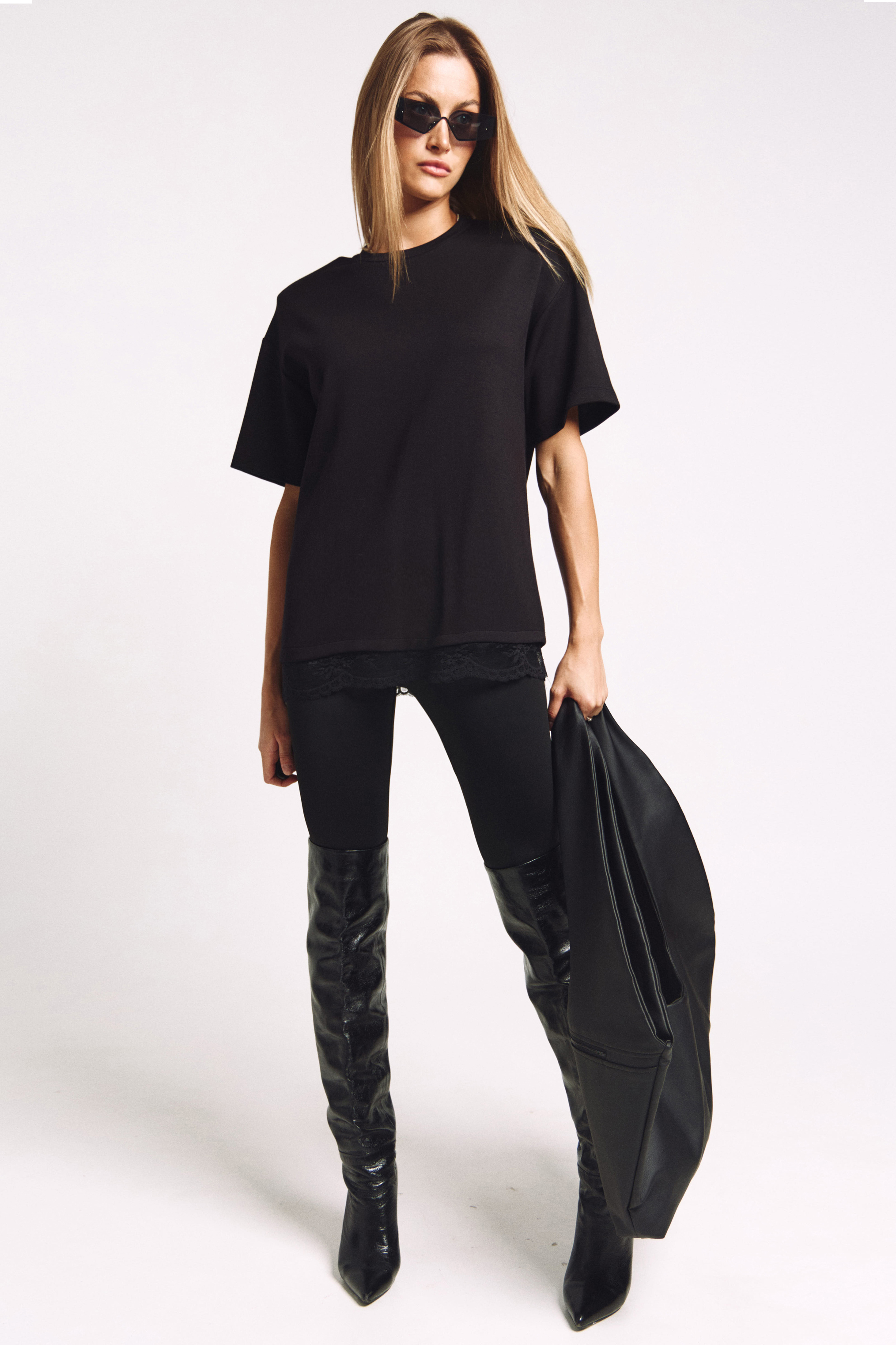 Футболка женская, удлиненная, из плотного трикотажа, с декоративными плечами и француским кружевом по низу.