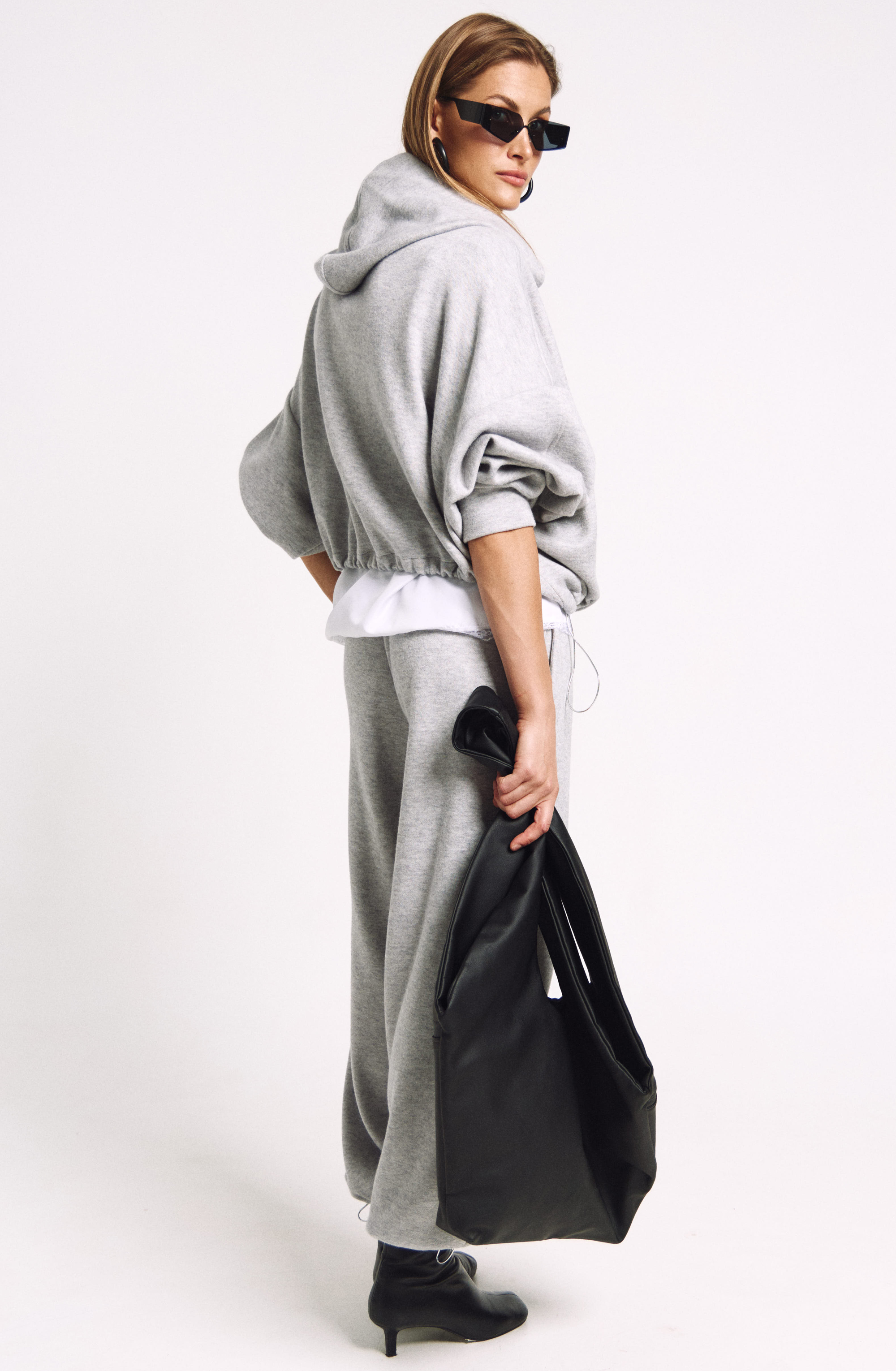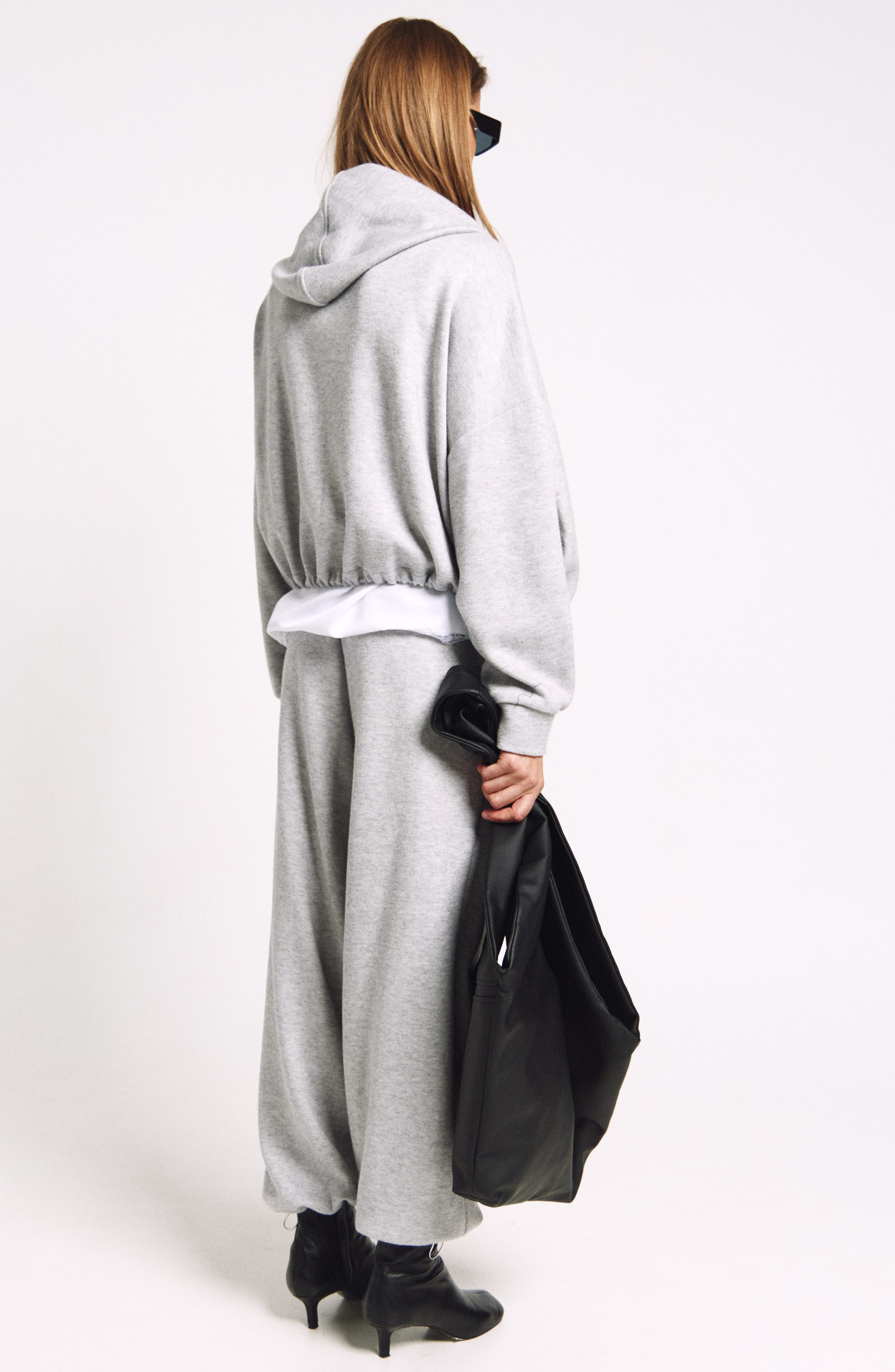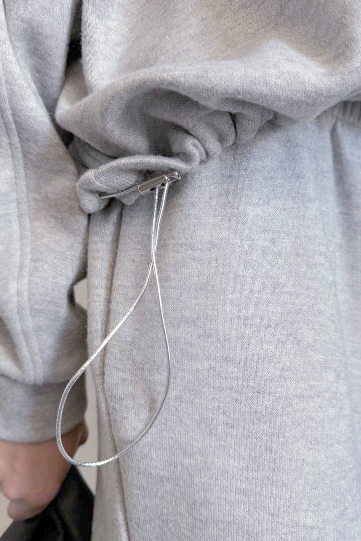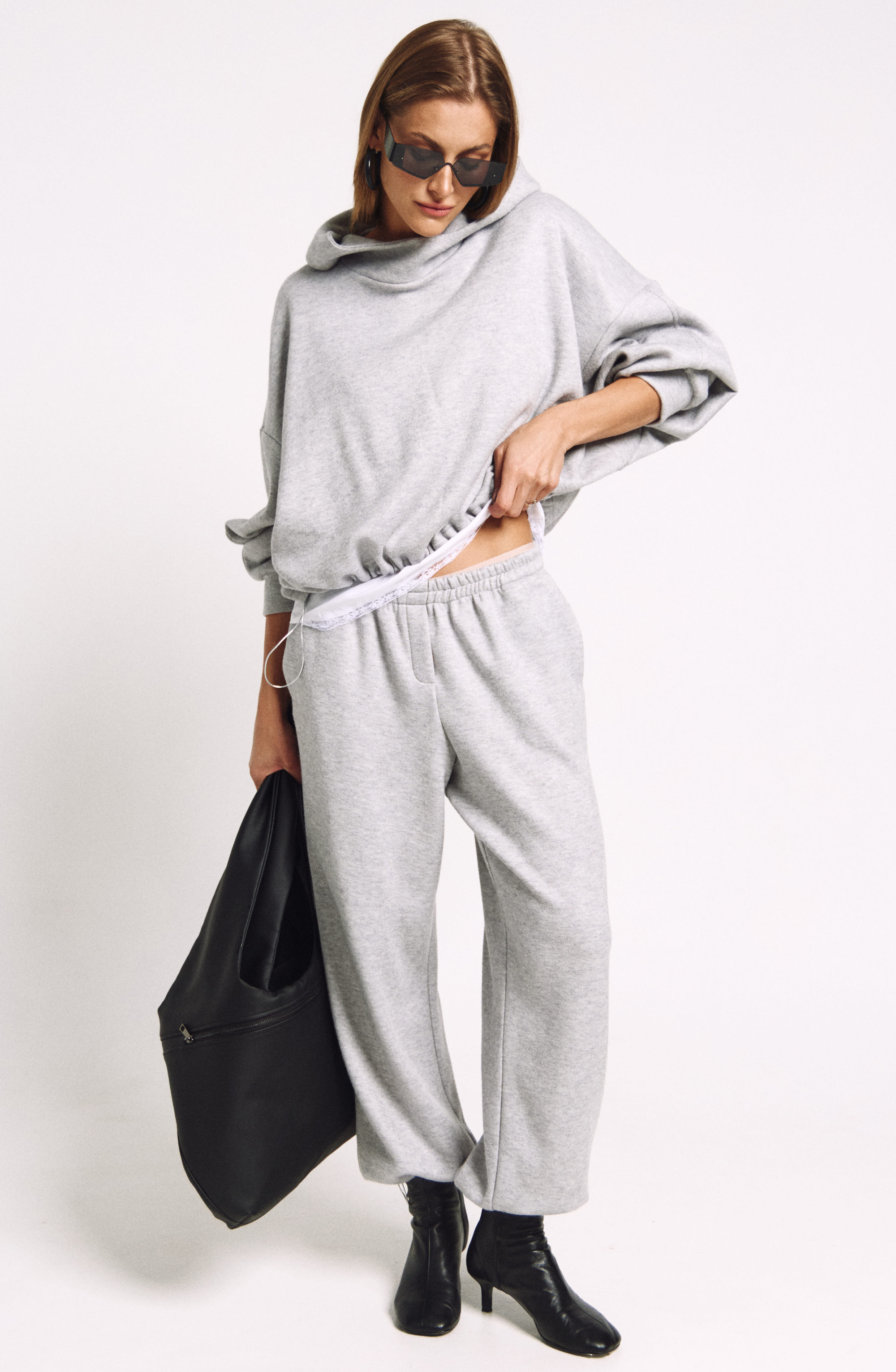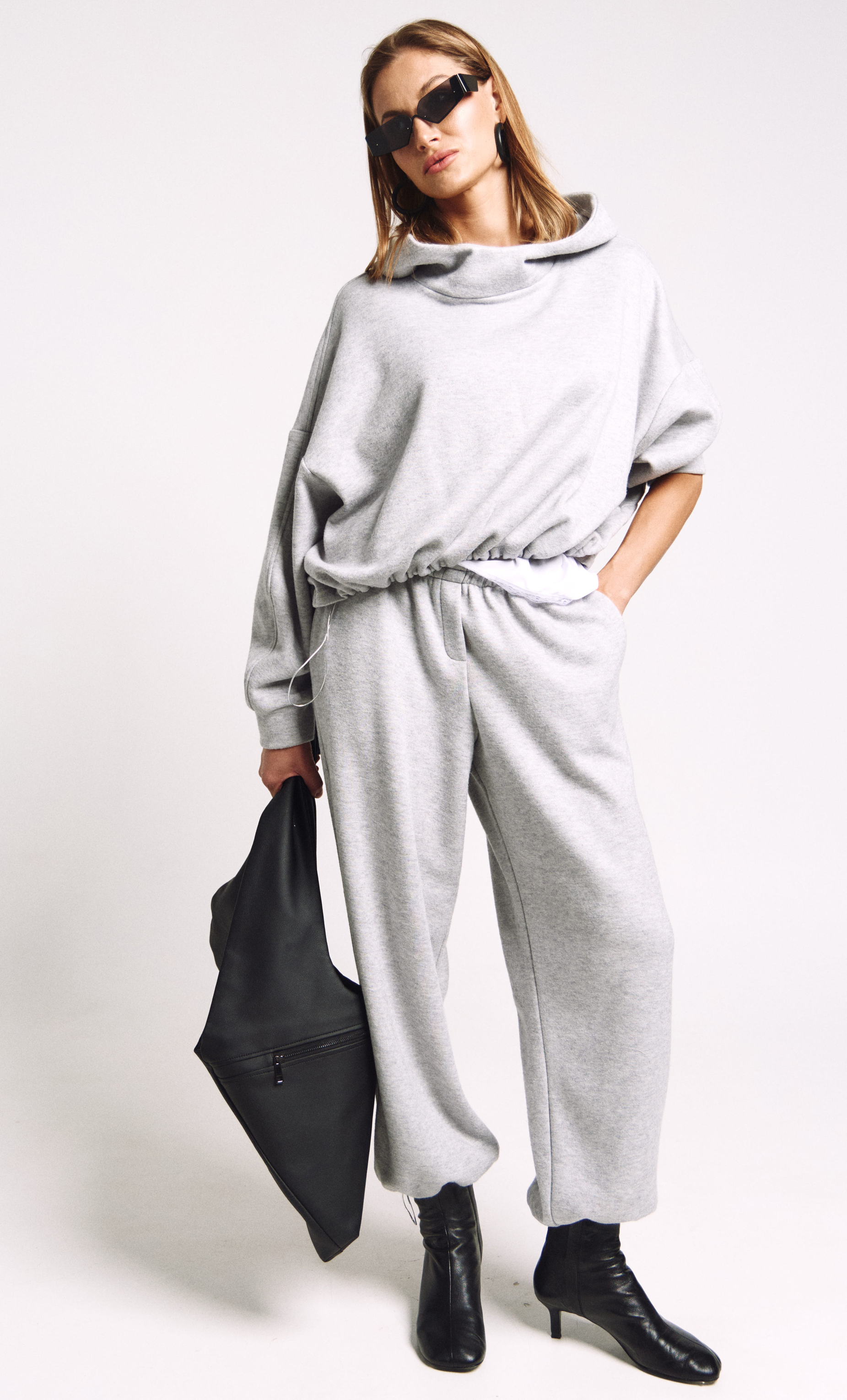 Комплект - худи и джоггеры. Худи большого объема с необычным капюшоном-стокой. Ширина низа худи регулируется резинками. Джоггеры из мягкого трикотажа, в классическом сером. Джоггеры умеренного объема. По низу ширина регулируется металлизированной резинкой и фиксаторами.