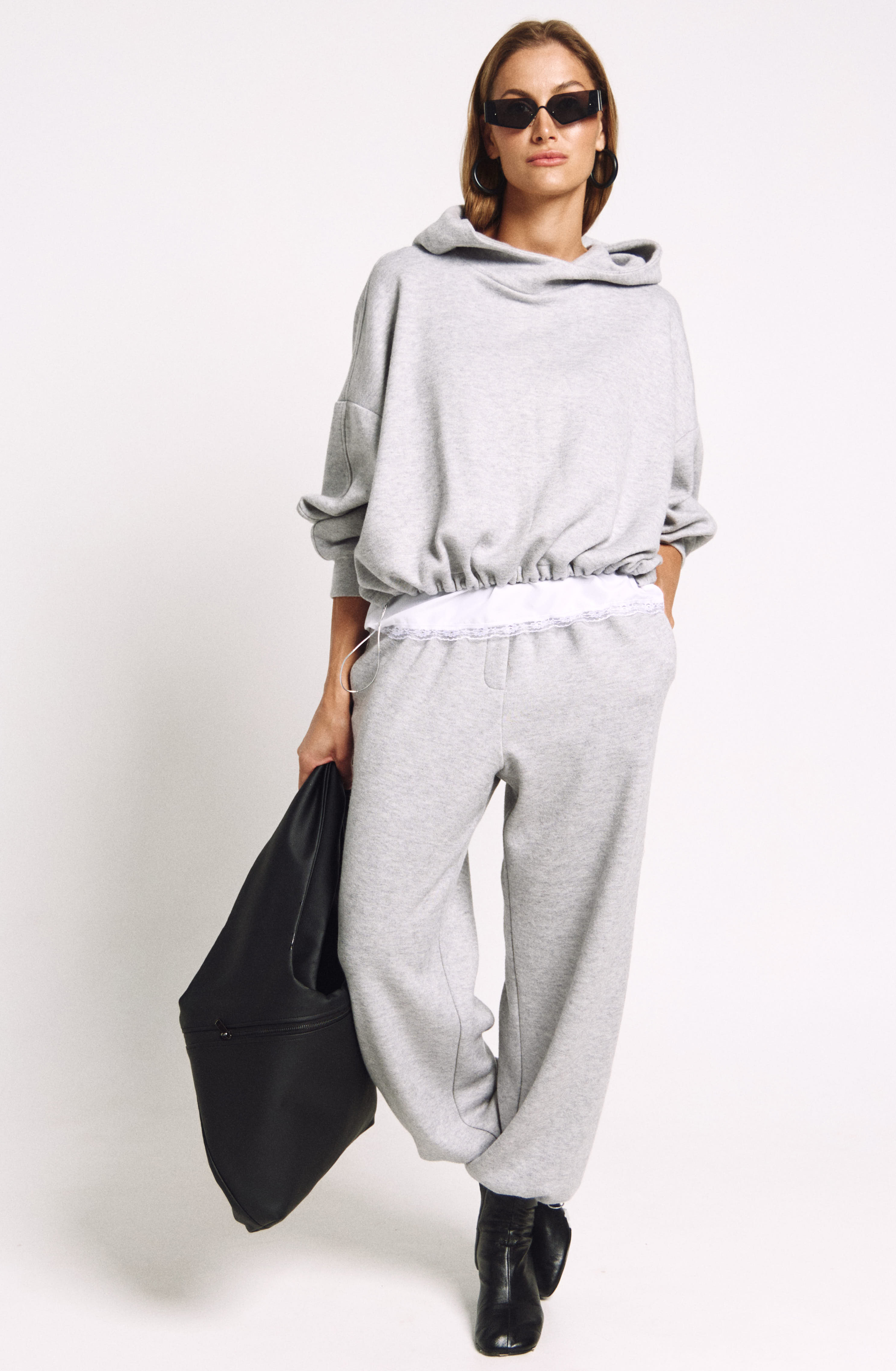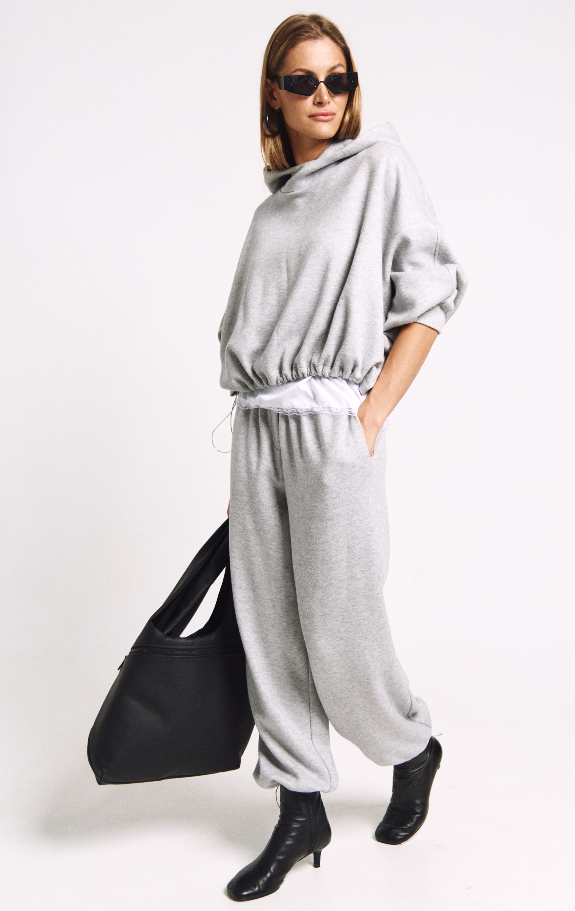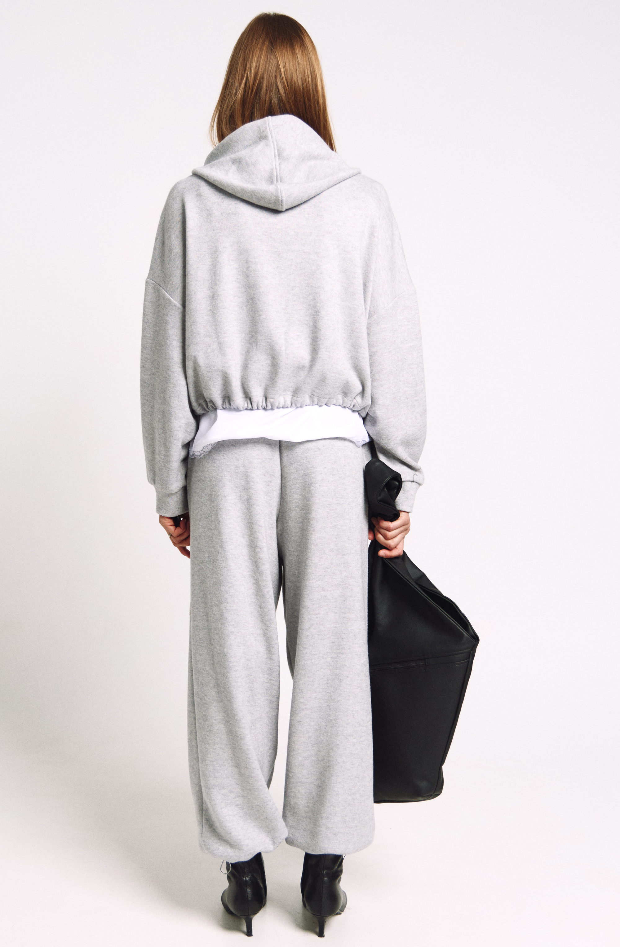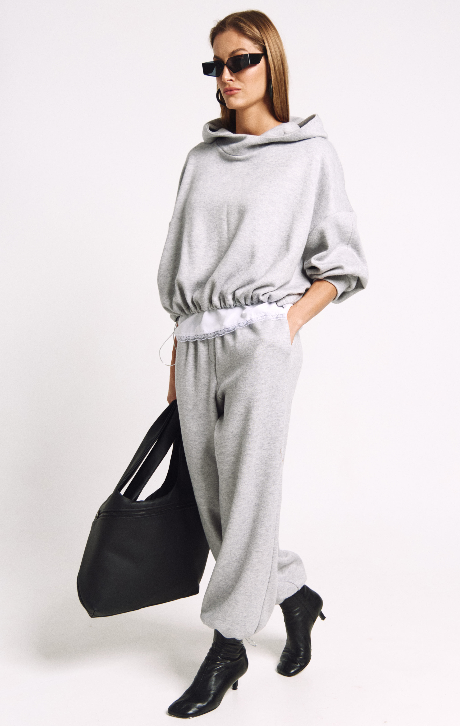 Комплект - худи и джоггеры. Худи большого объема с необычным капюшоном-стокой. Ширина низа худи регулируется резинками. Джоггеры из мягкого трикотажа, в классическом сером. Джоггеры умеренного объема. По низу ширина регулируется металлизированной резинкой и фиксаторами.