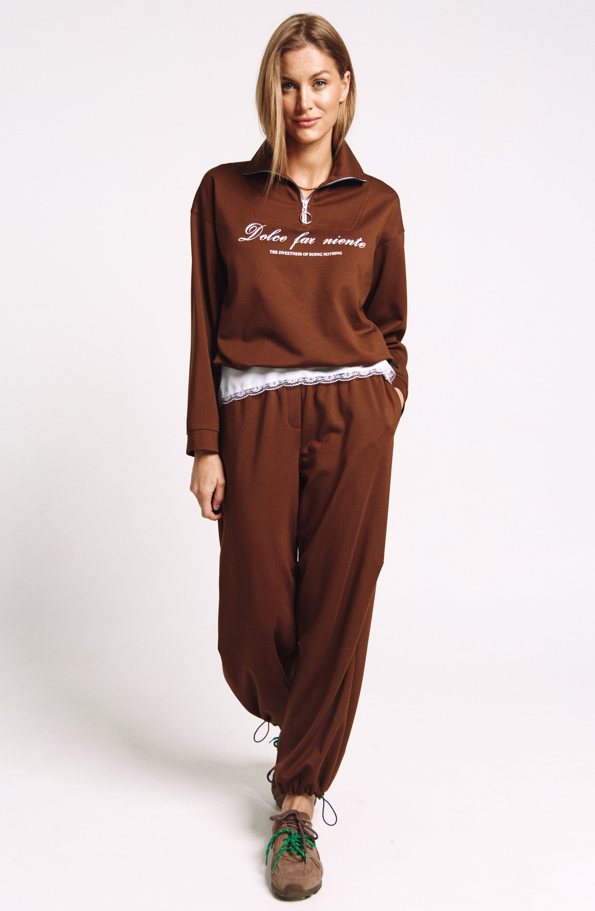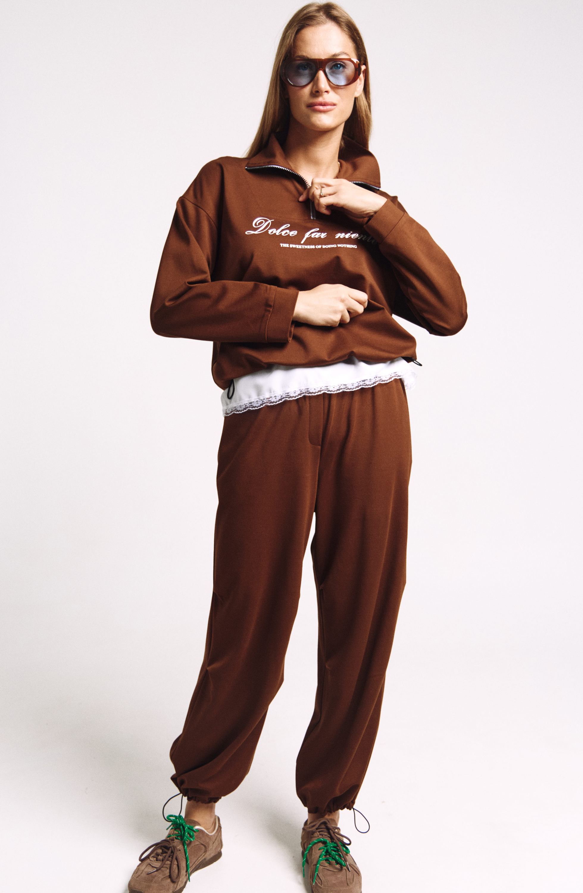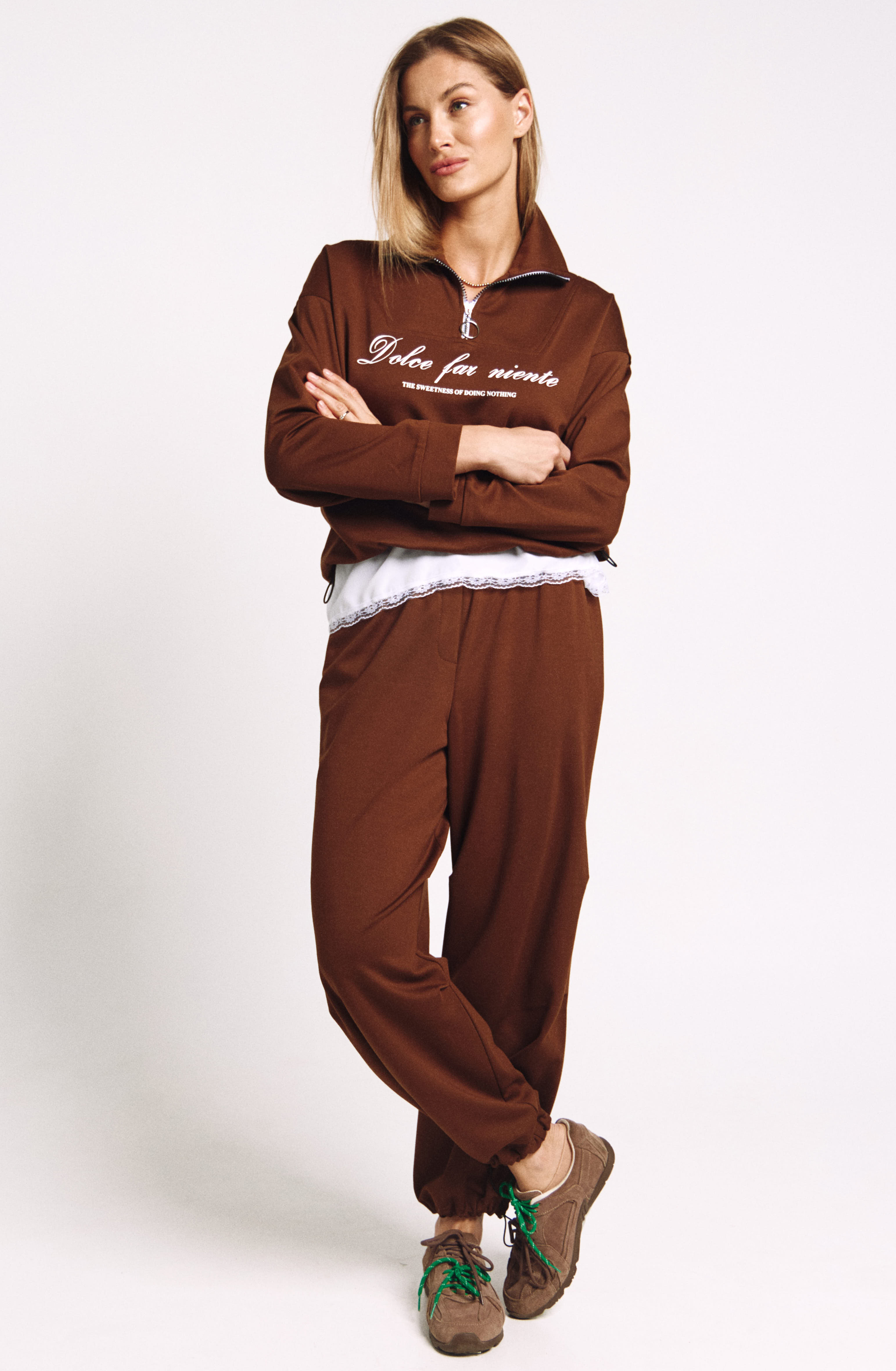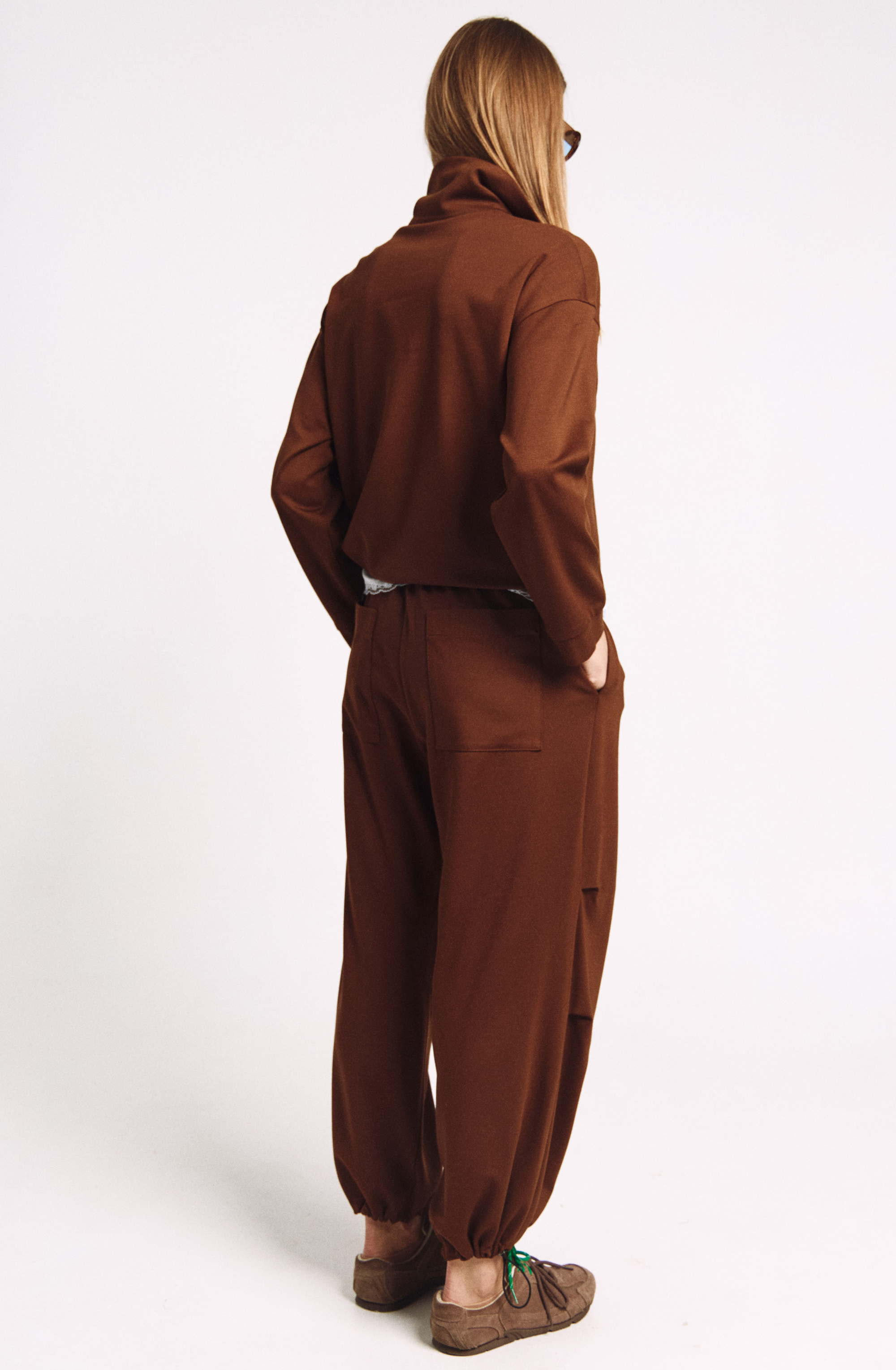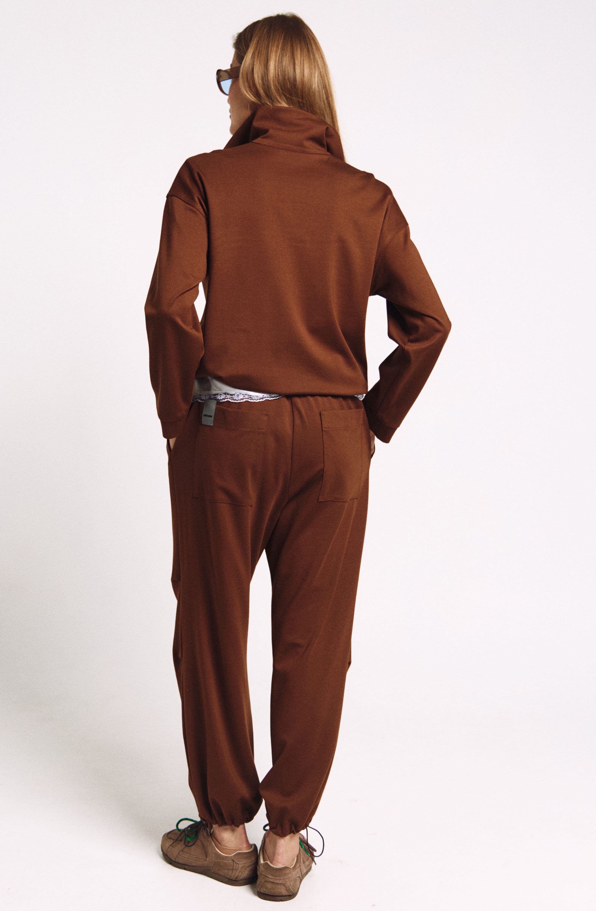 Костюм в цвете "корица" из приятного вискозного трикотажа. Джемпер с воротником--стойкой на молнии. Брюки с регулирующей резинкой по талии и по низу.