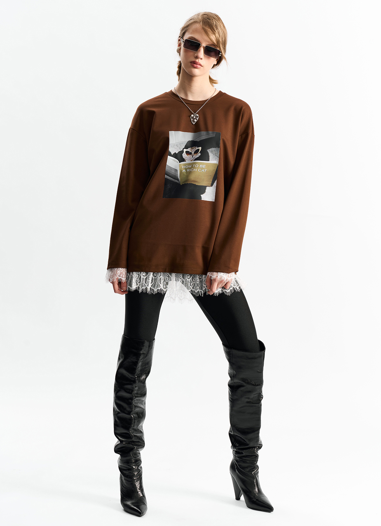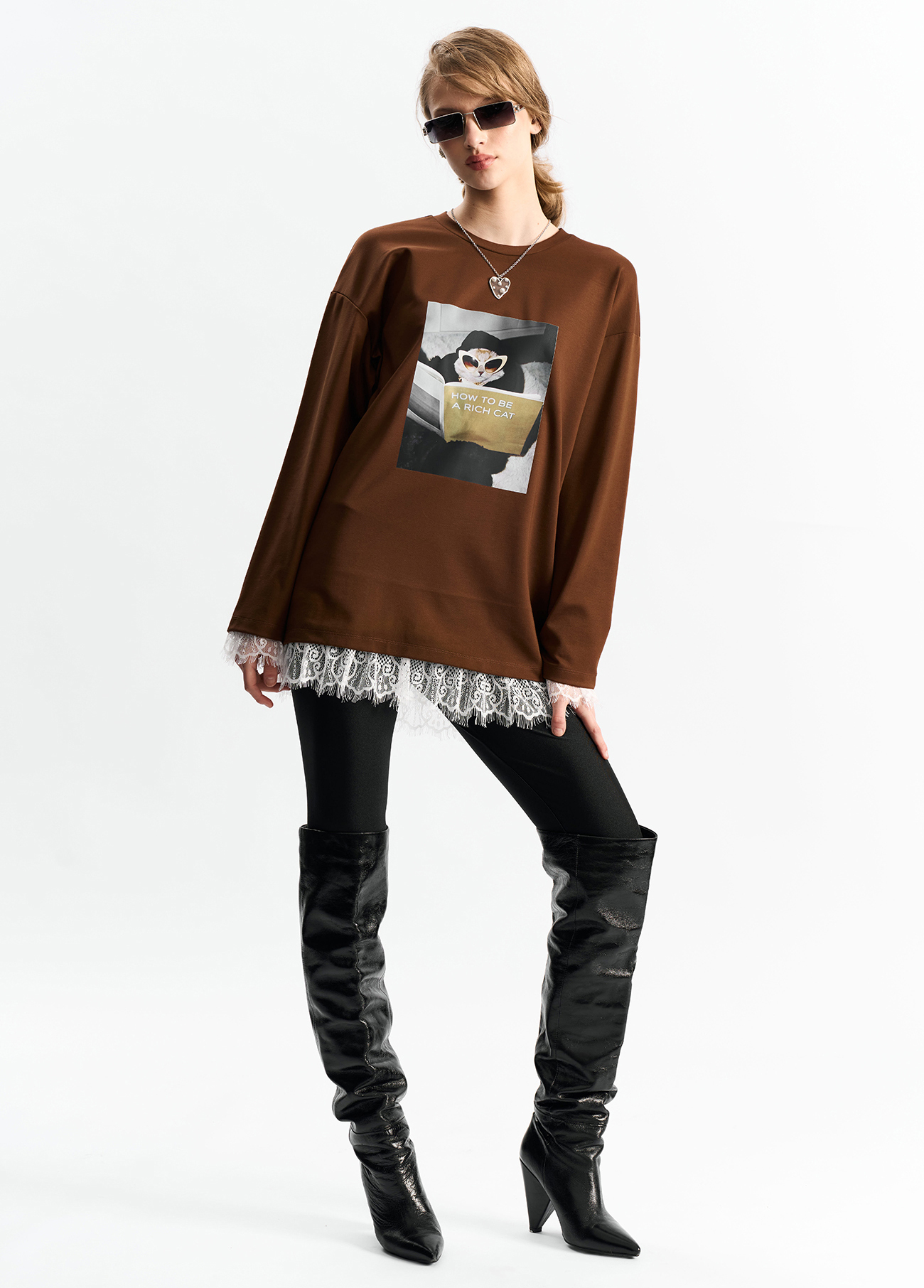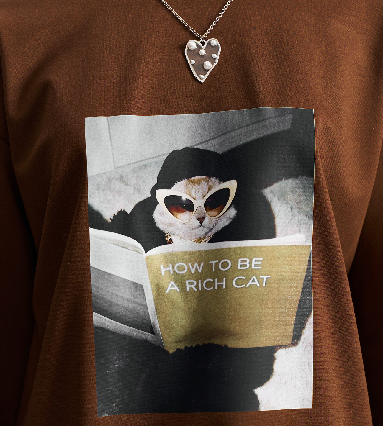 Лонгслив из плотного трикотажа цвета "корица" с печатью. Свободный крой.Два универсальных размера - S (соответствует 42-44-46) и L (48-50-52)Состав: 60% вискоза 35% полиамид 5% спандекс