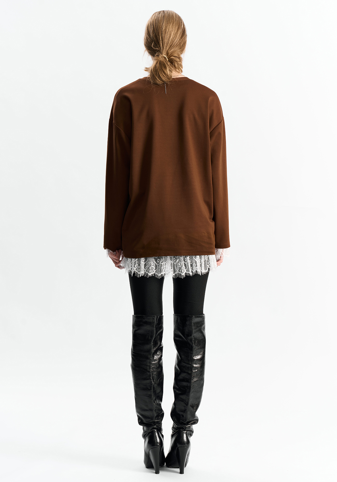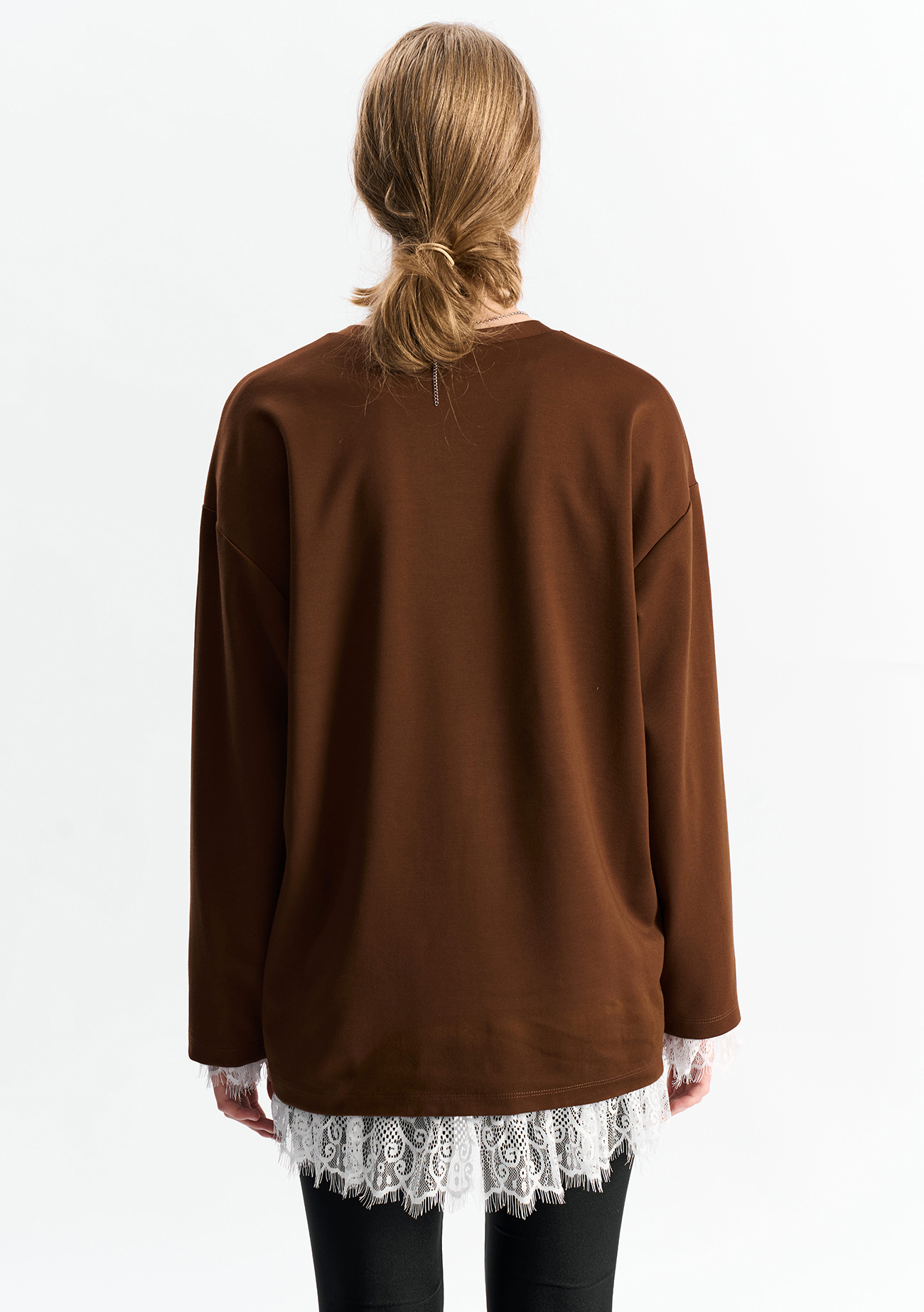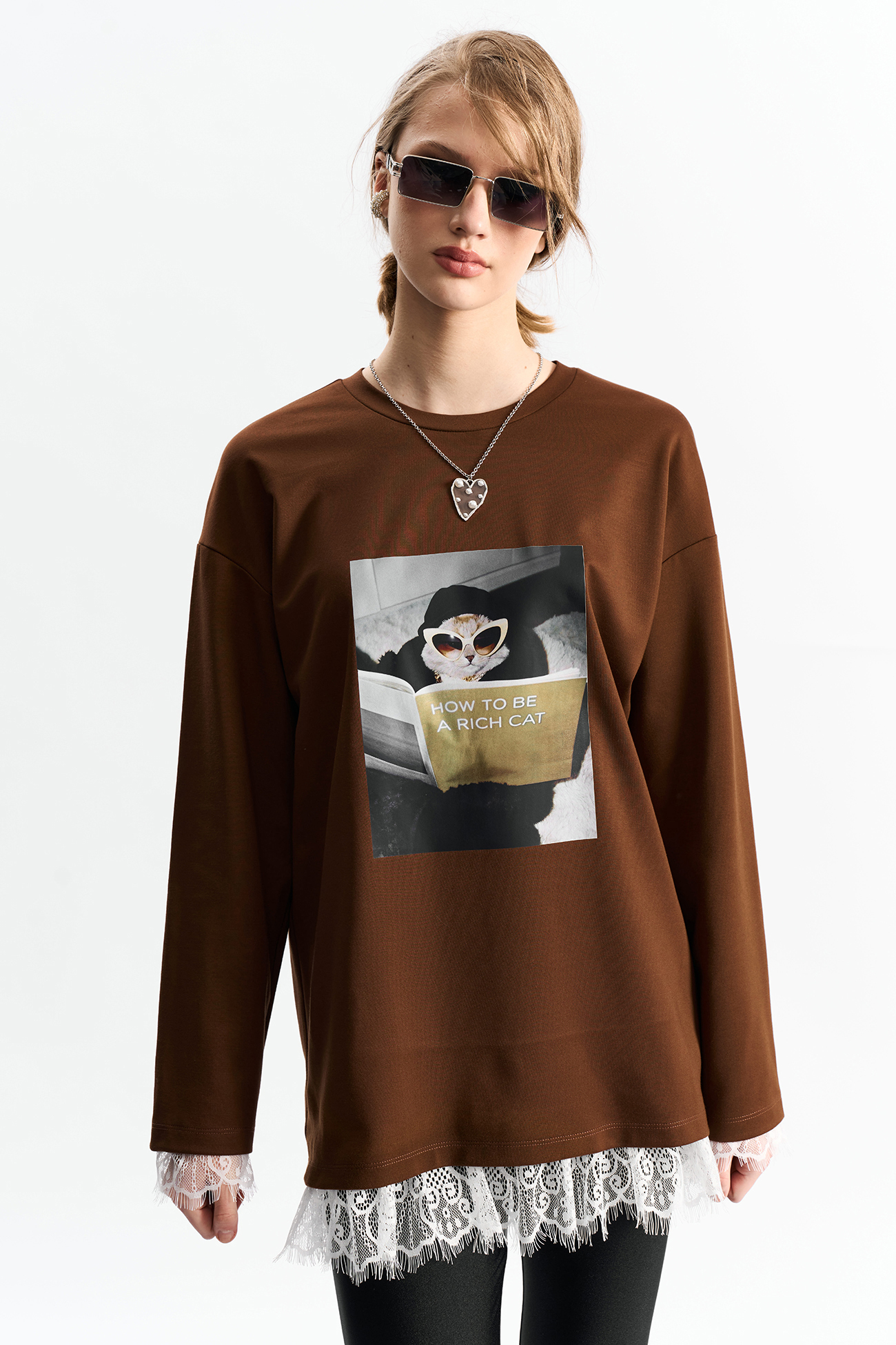 Лонгслив из плотного трикотажа цвета "корица" с печатью. Свободный крой.Два универсальных размера - S (соответствует 42-44-46) и L (48-50-52)Состав: 60% вискоза 35% полиамид 5% спандекс