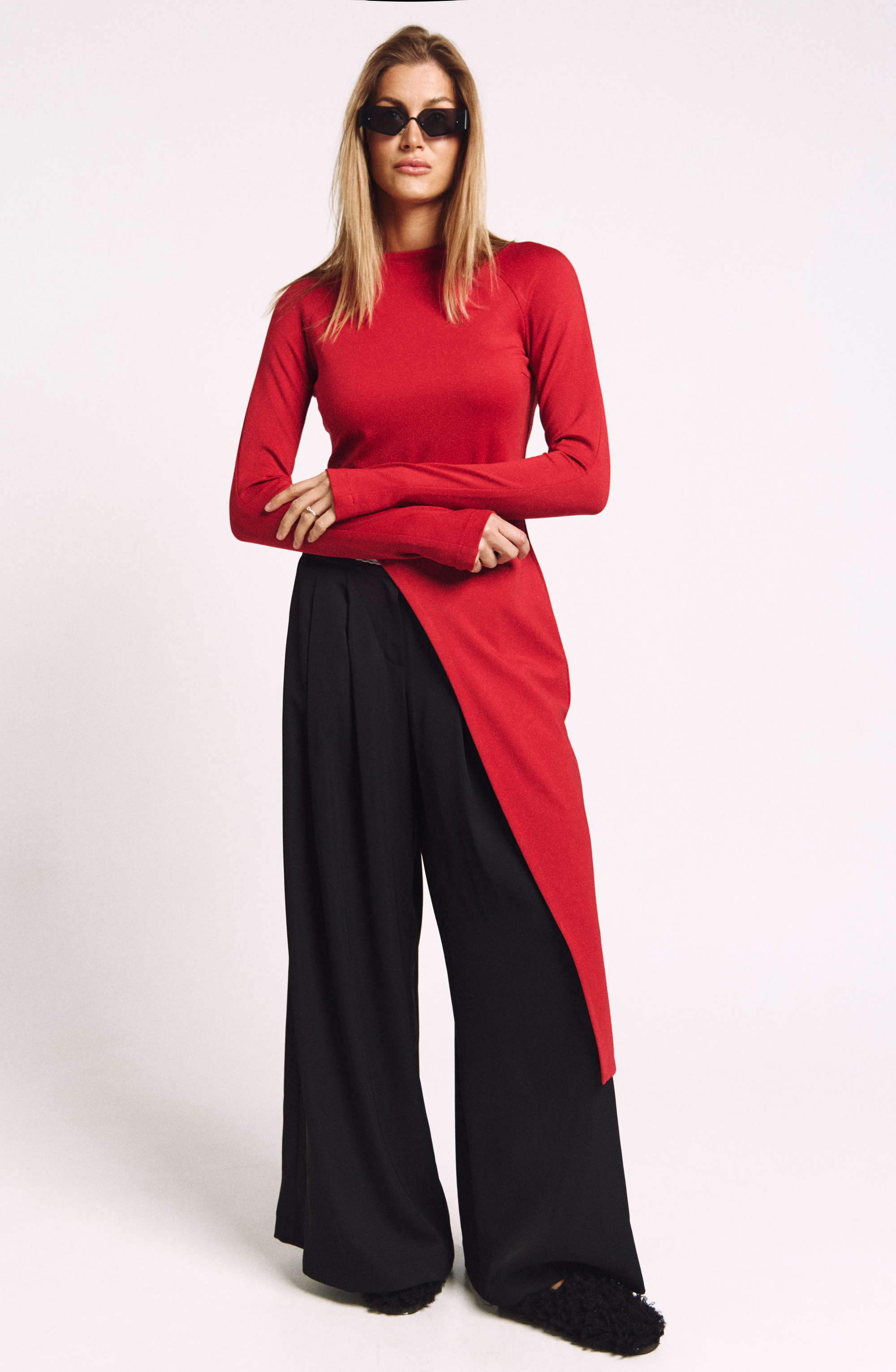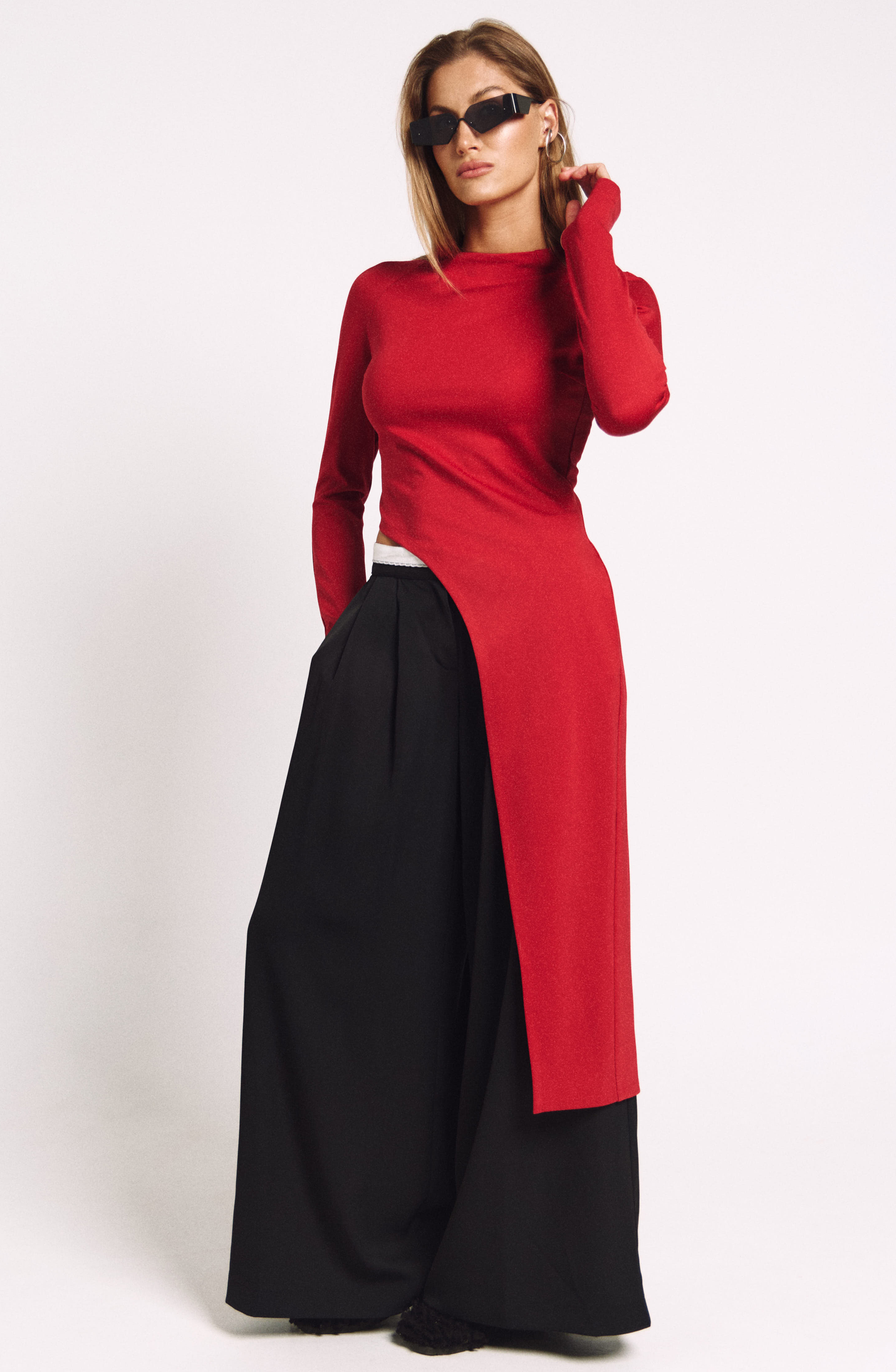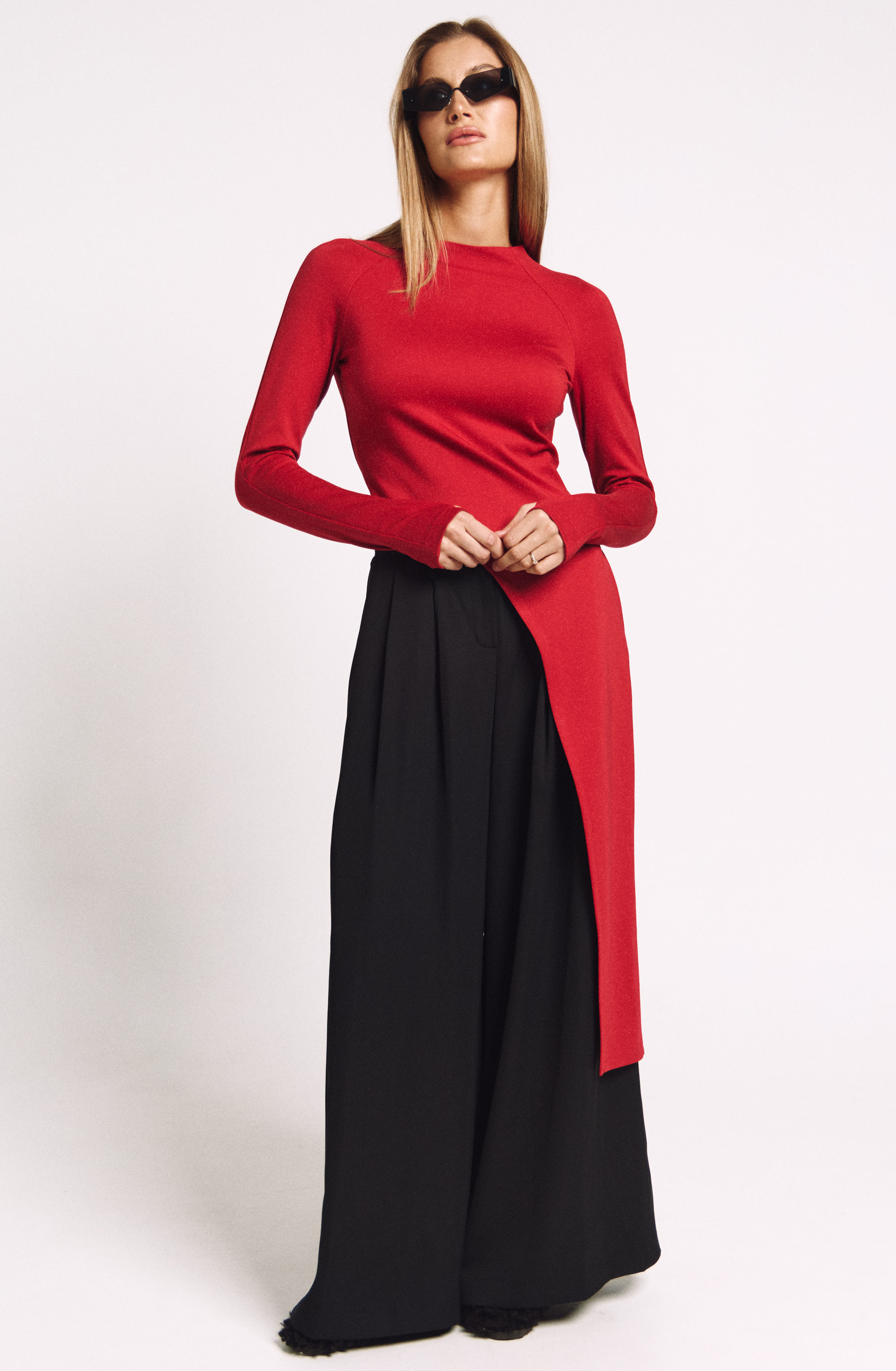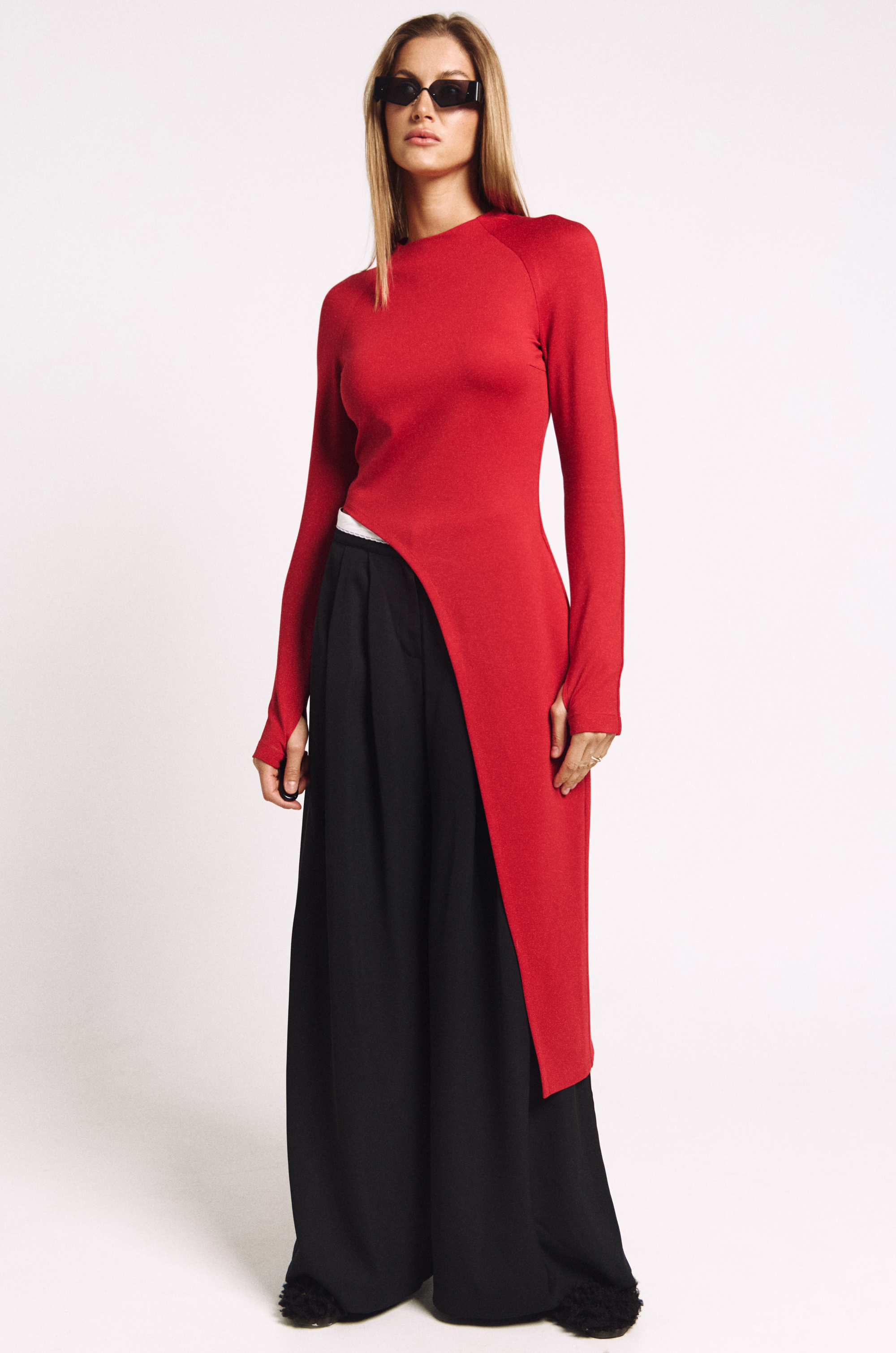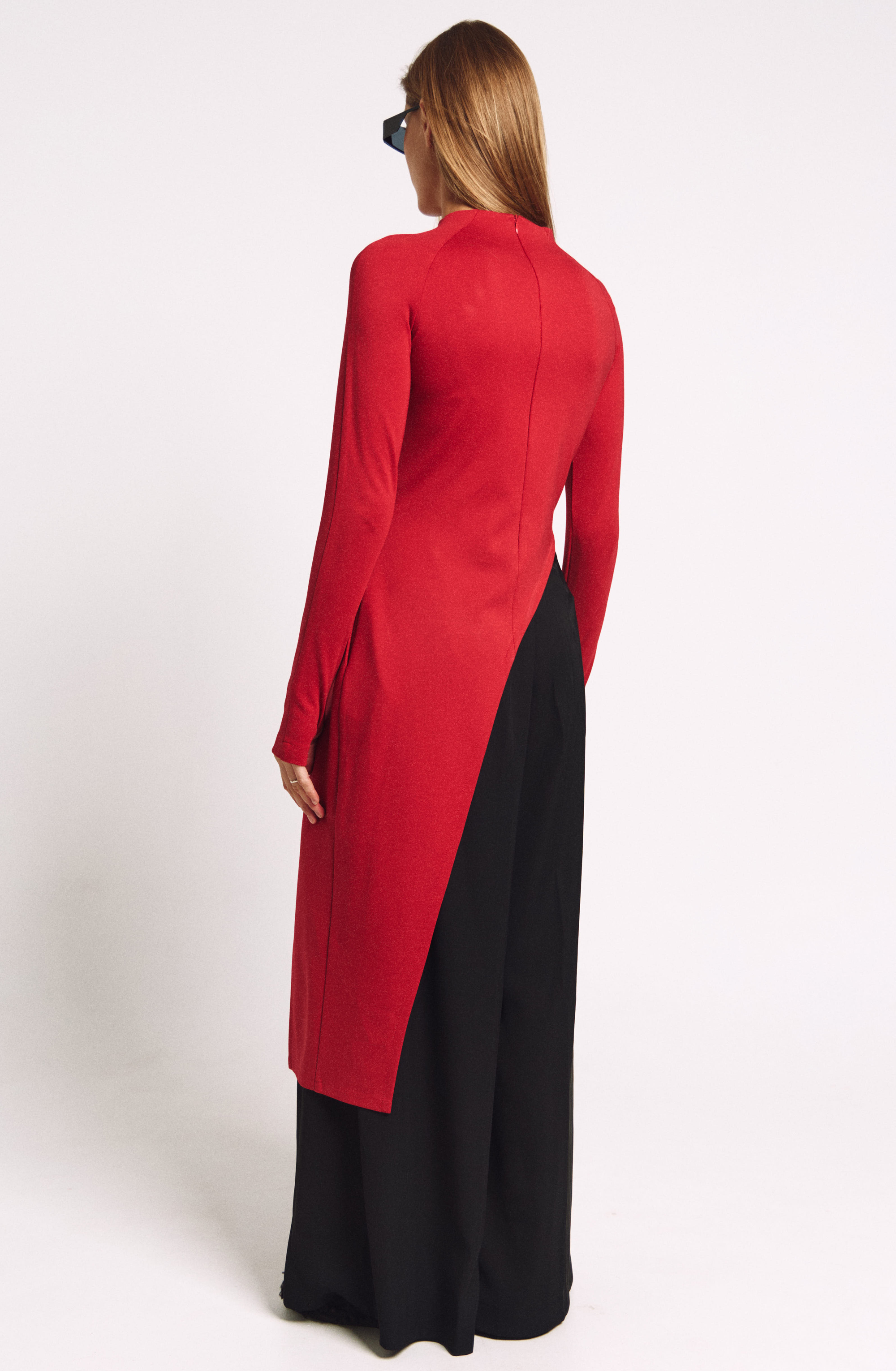 Лонгслив асимметричный, с удлиненной левой стороной.