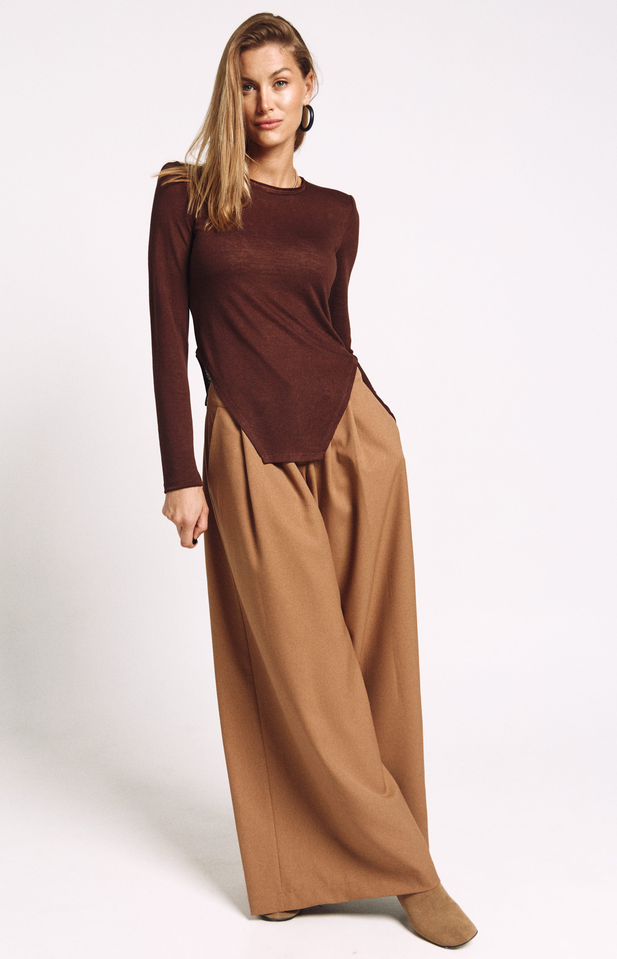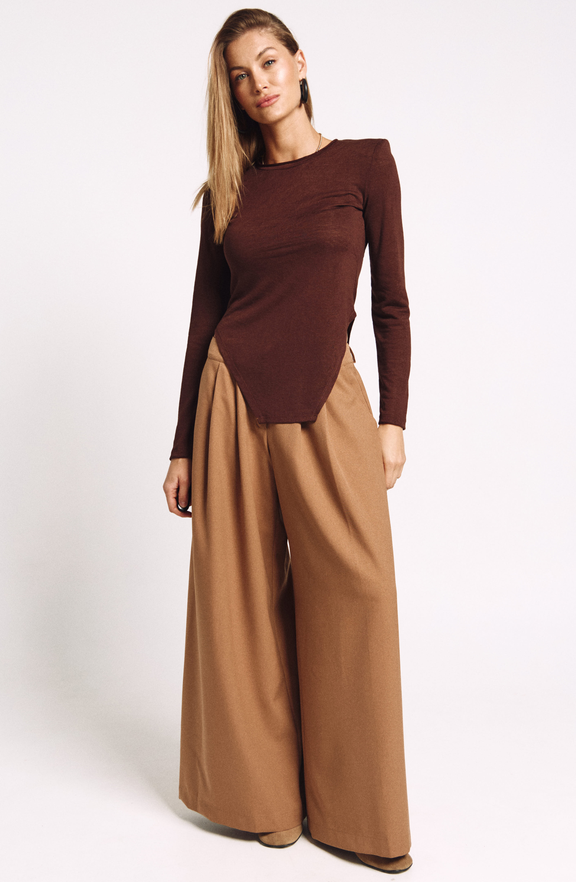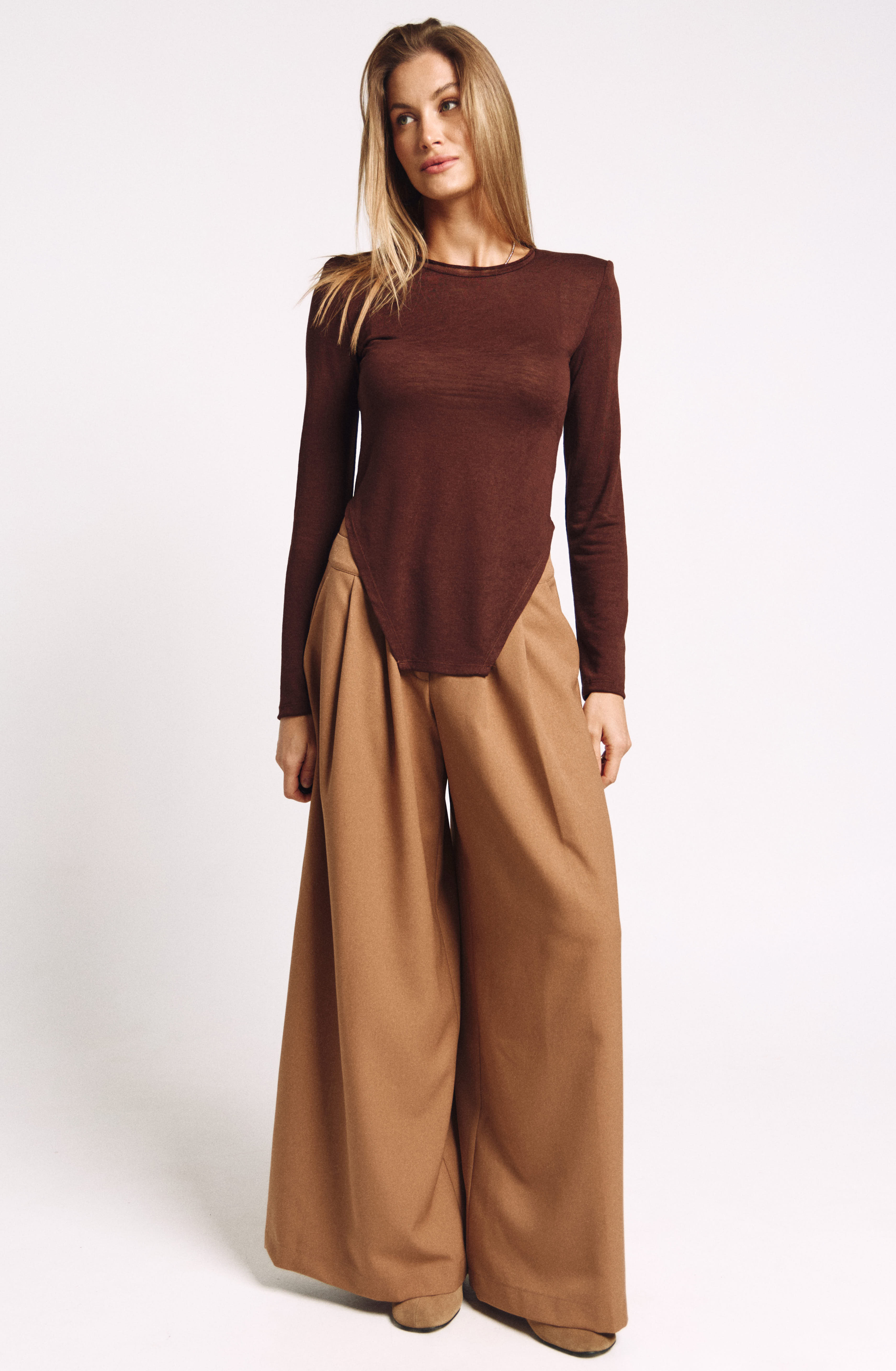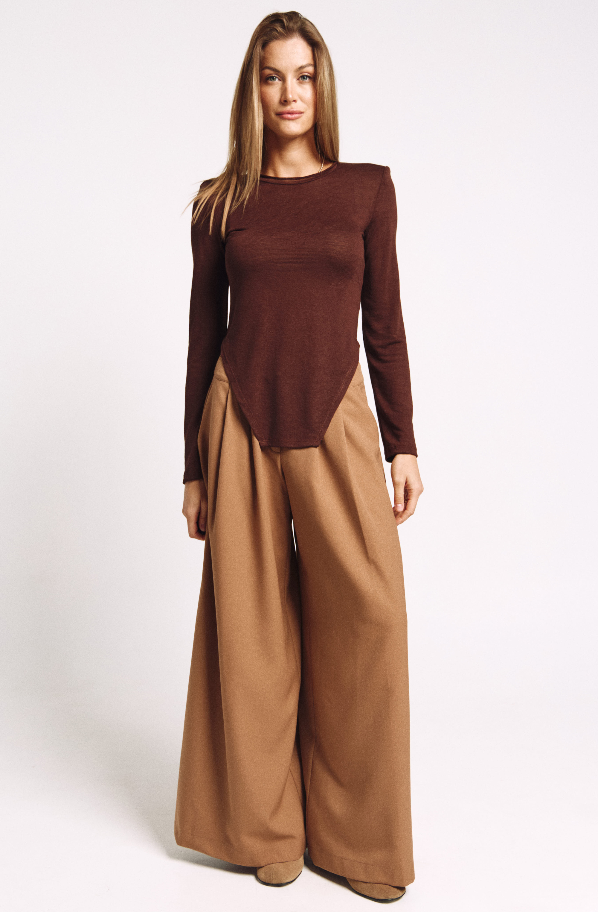 Лонгслив прилегающего силуэта с фигурной линией низа и вставными плечами. Фактурный трикотаж.