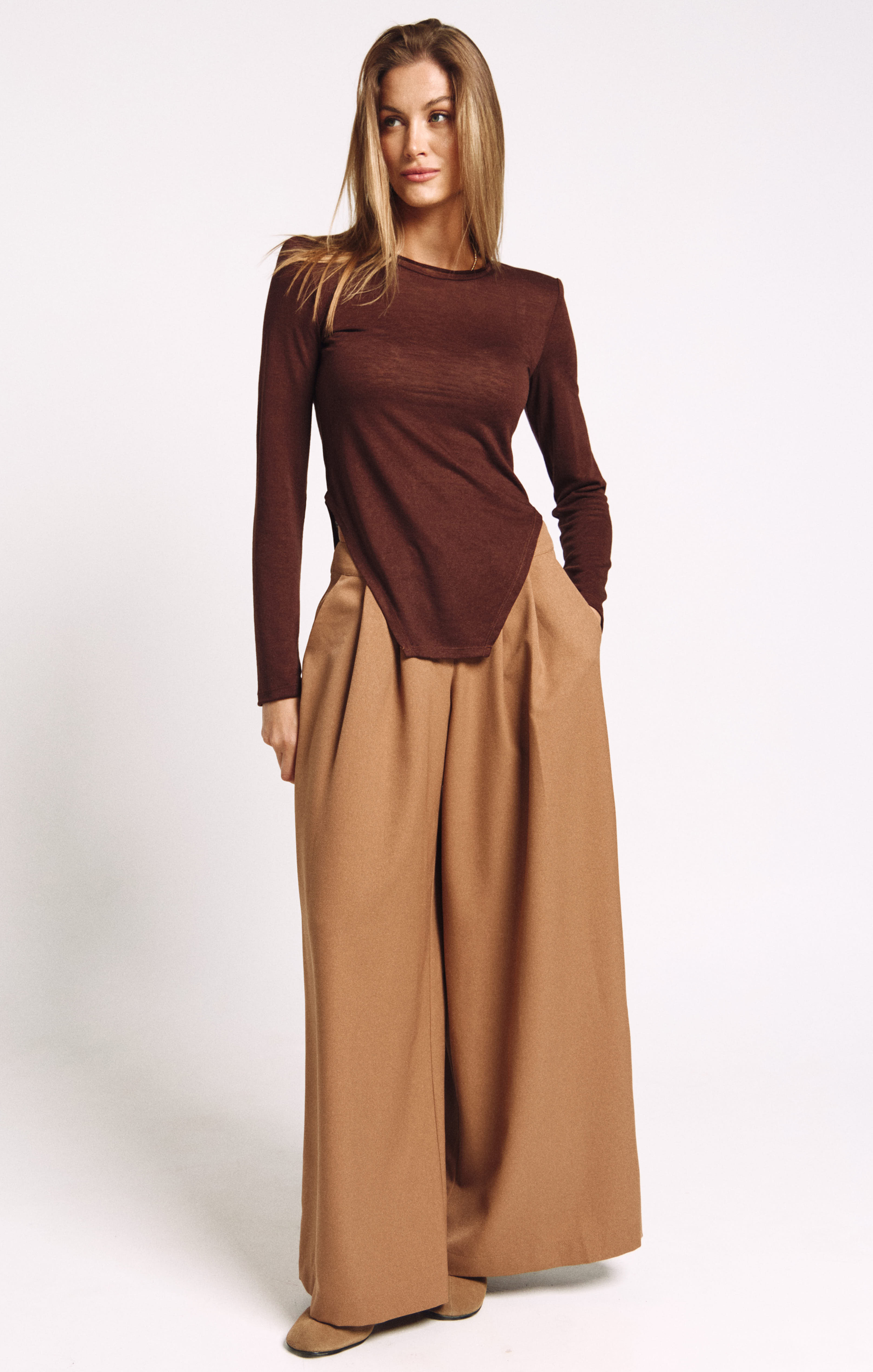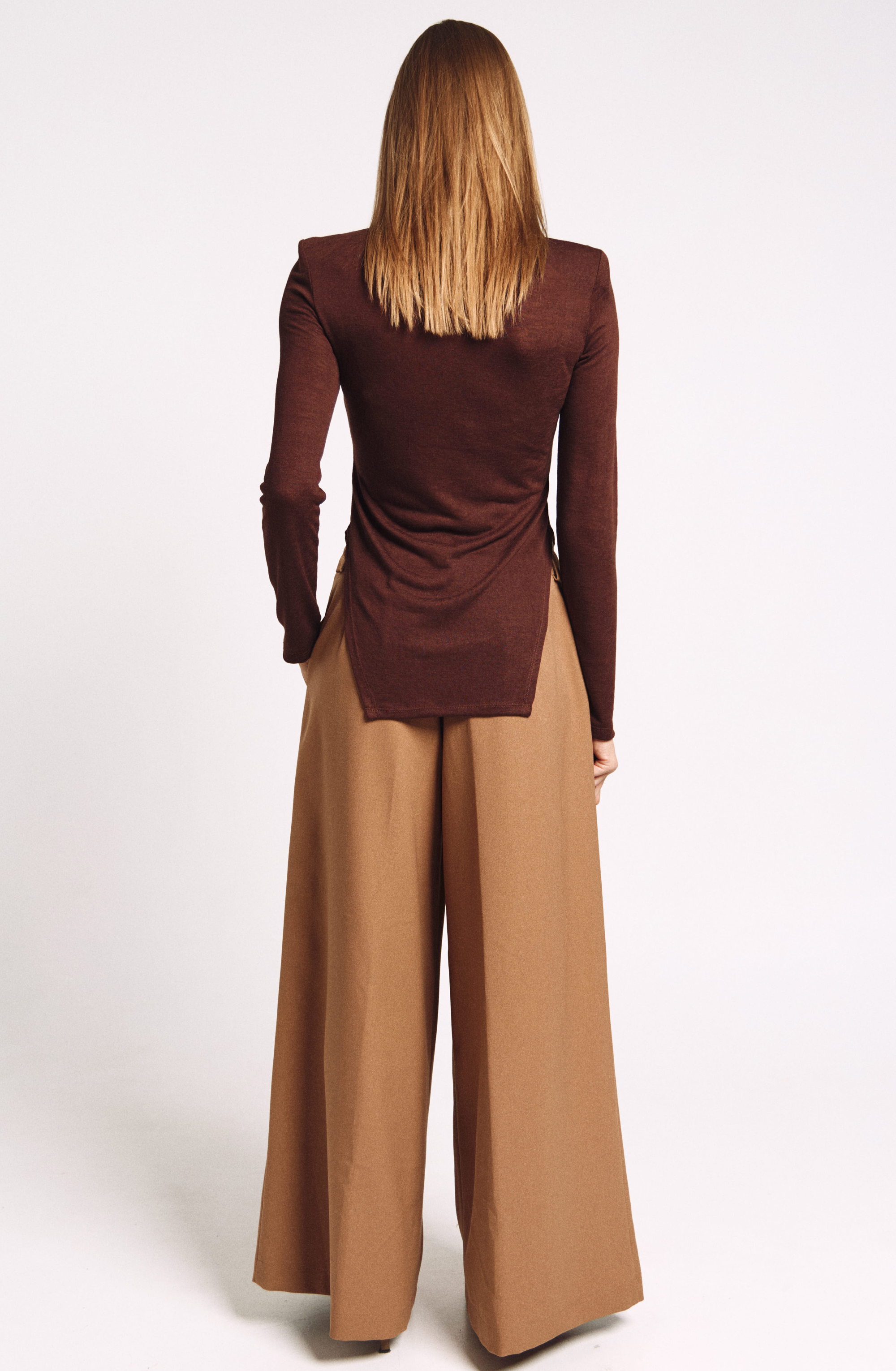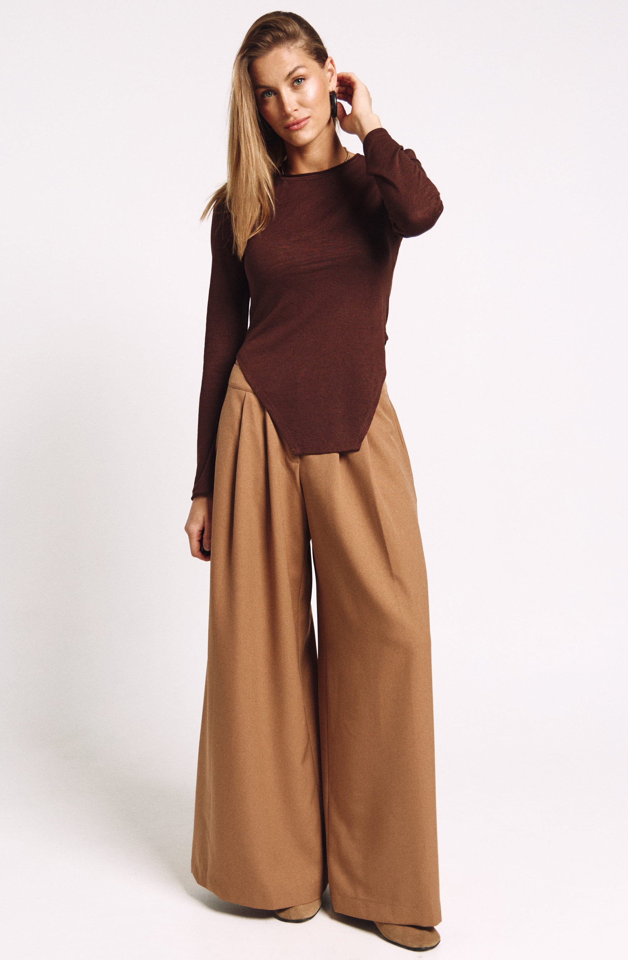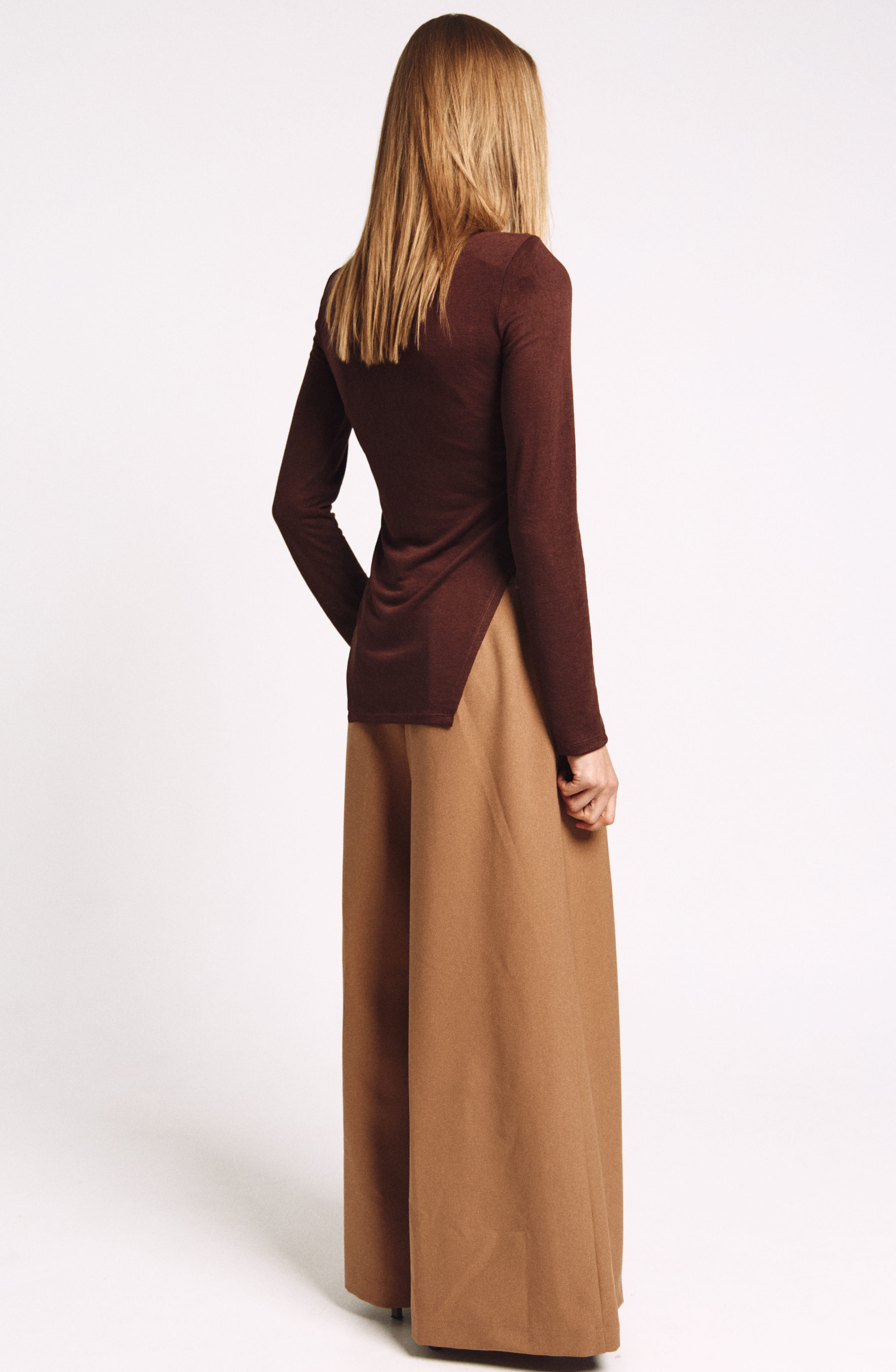 Лонгслив прилегающего силуэта с фигурной линией низа и вставными плечами. Фактурный трикотаж.