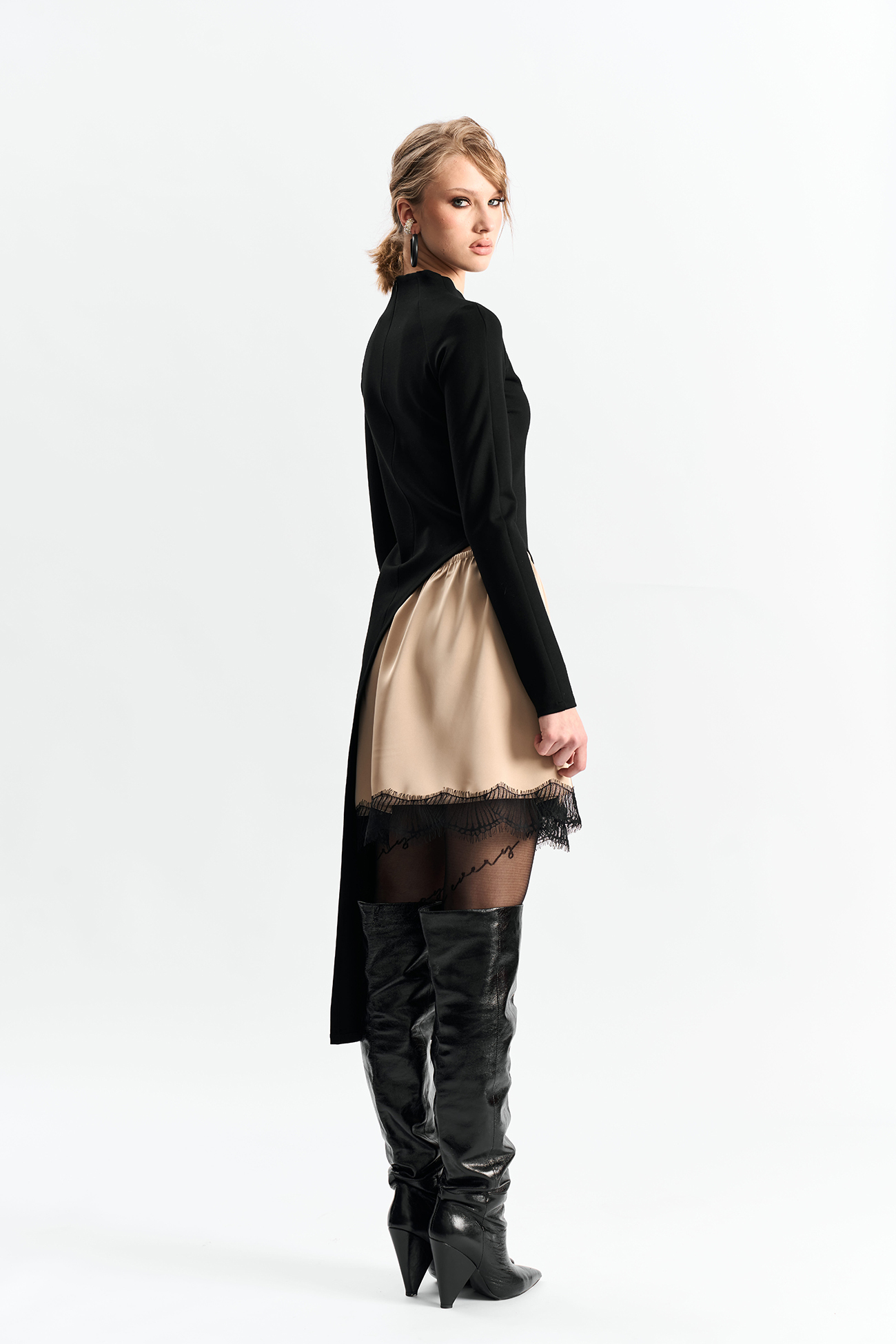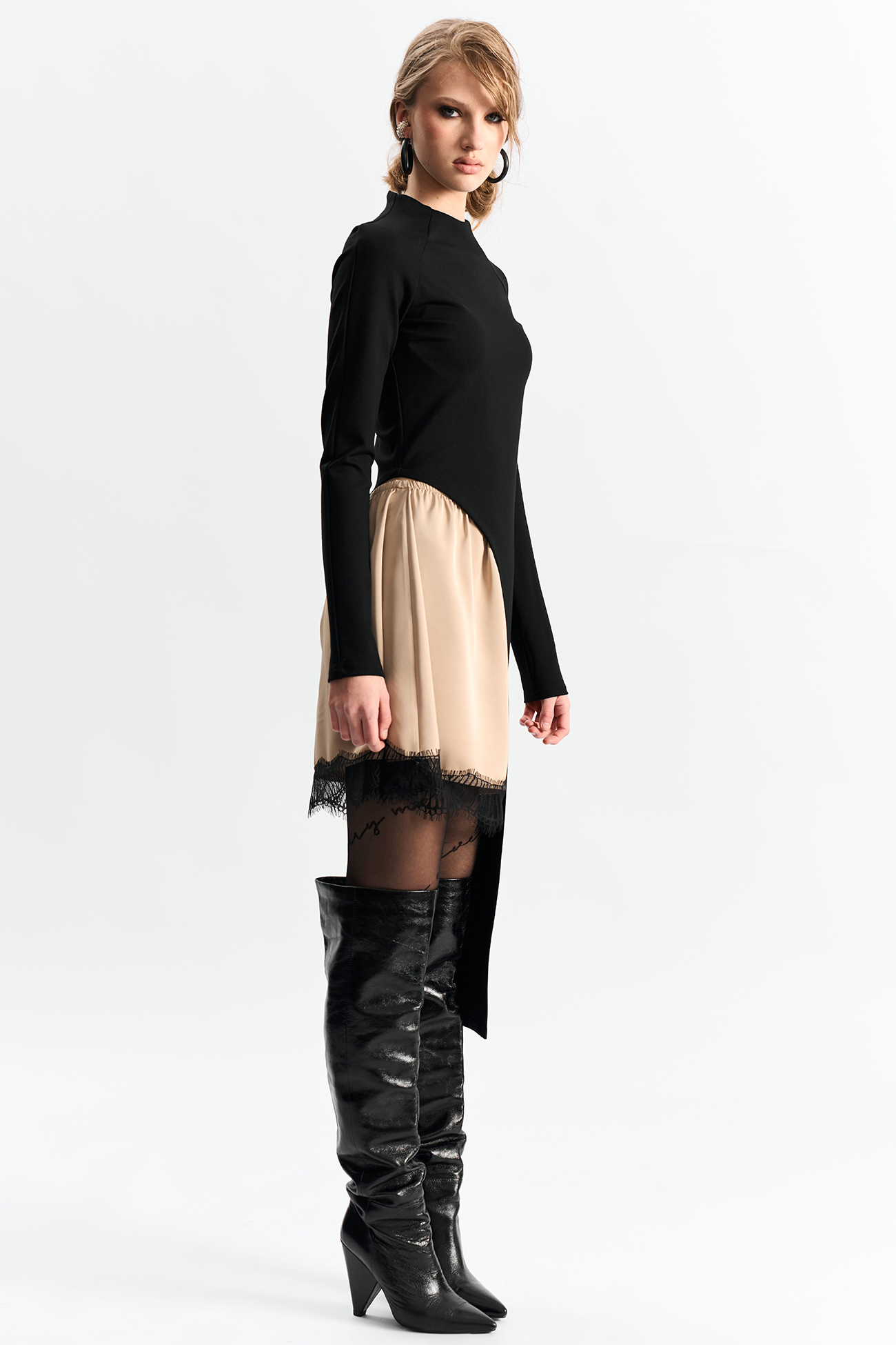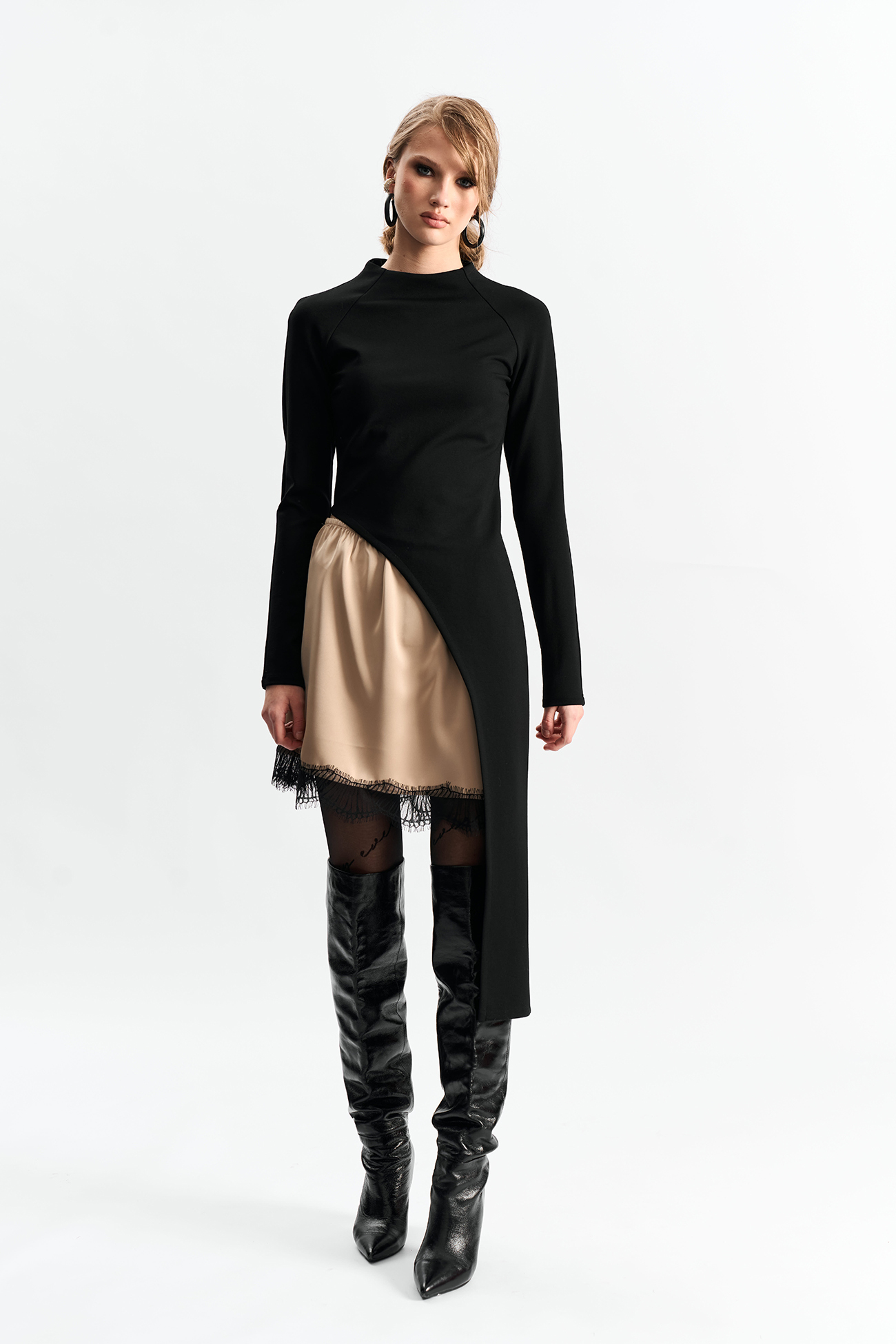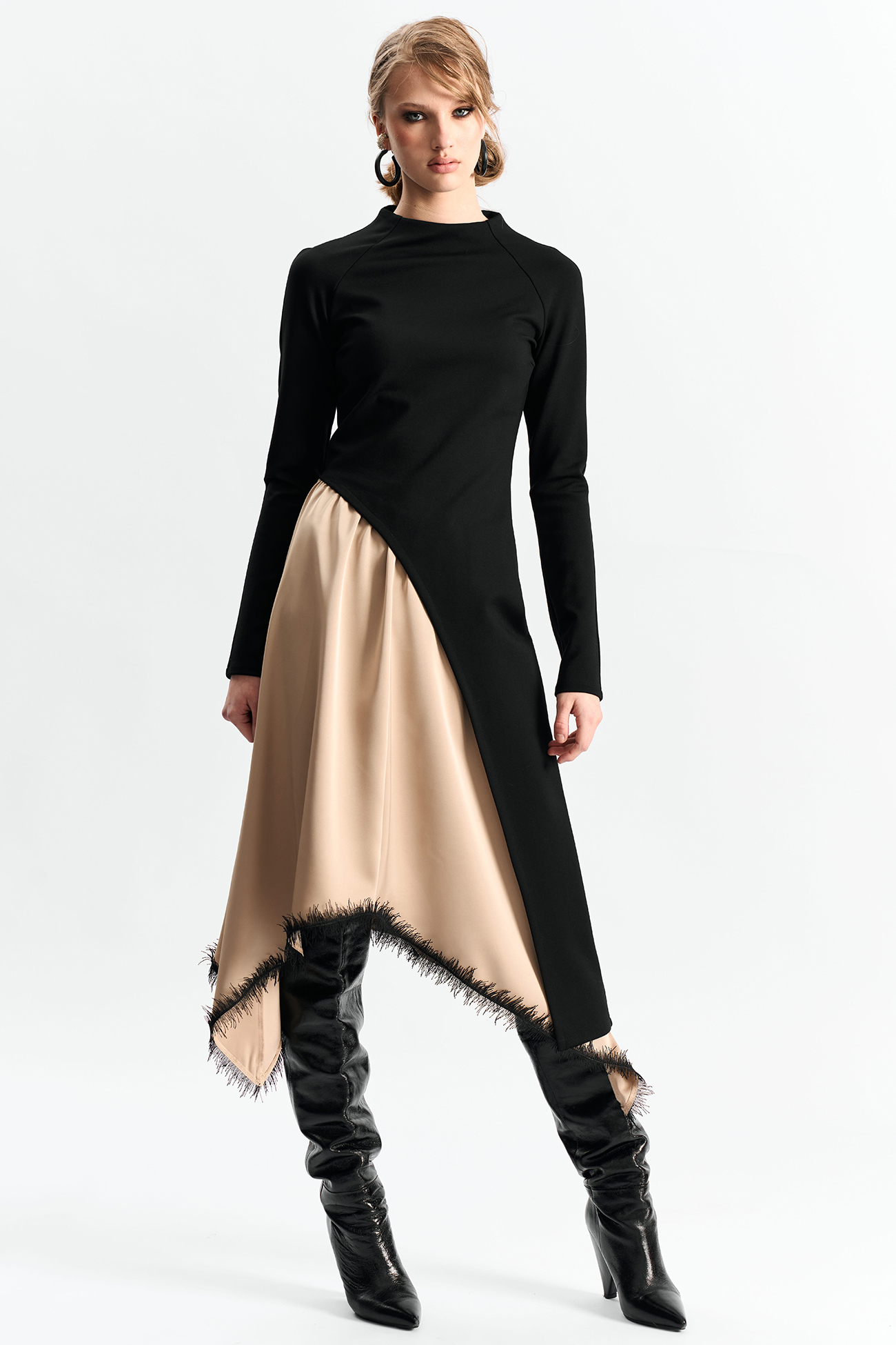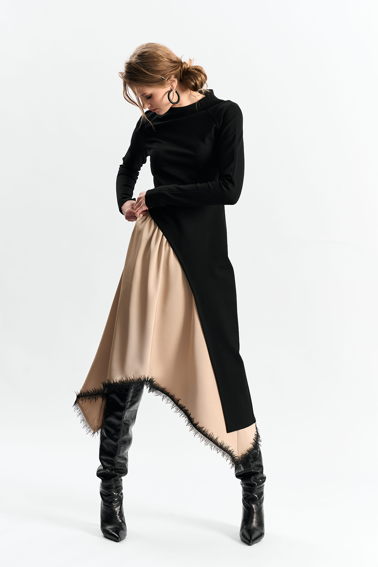 Джемпер асимметричный, с удлиненной левой стороной. Рукав удлиненный с разрезом бля большого пальца. Прилегающий силуэт, сзади - потайная молния в цвет изделияСостав: вискоза 60%, полиамид 35%, спандекс 5%