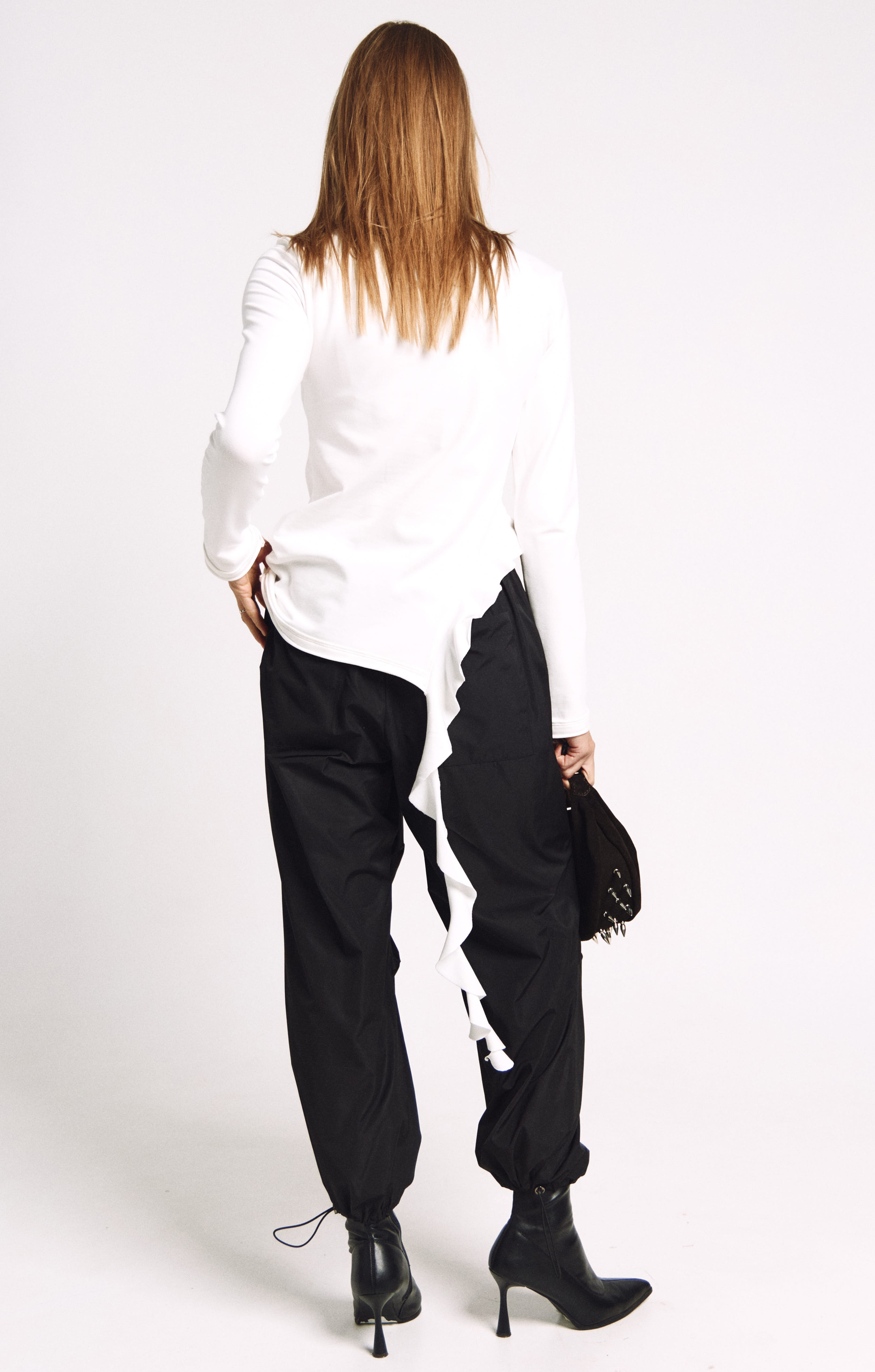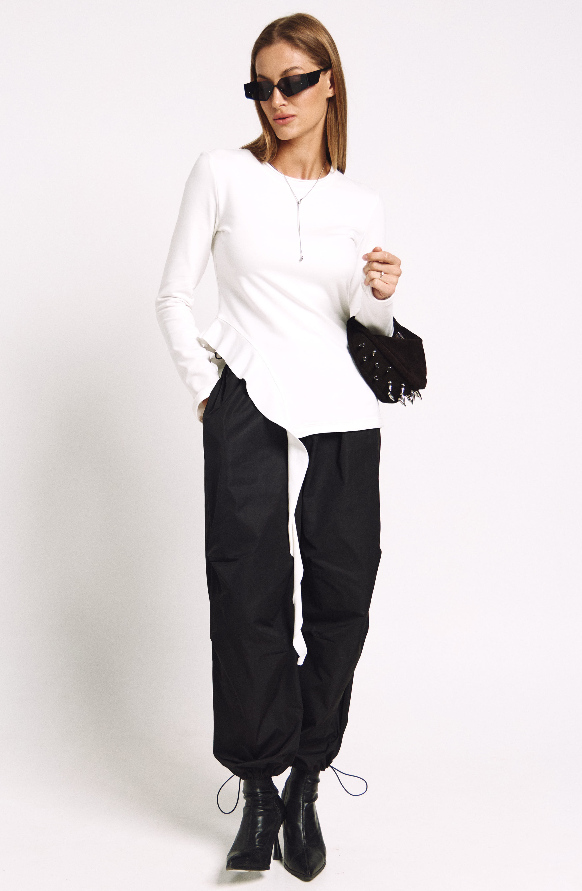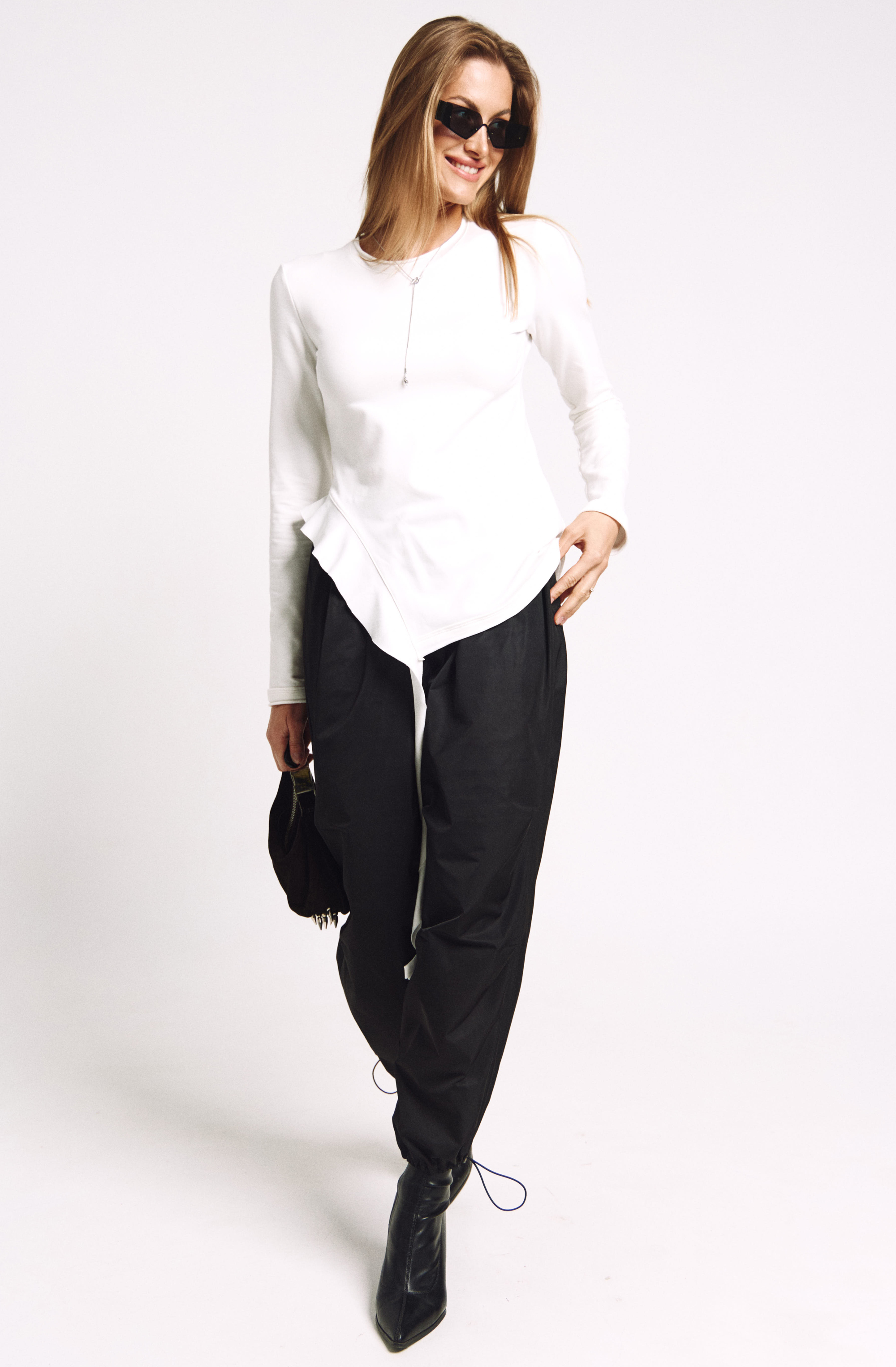Лонгслив из смесового хлопка, с асимметричным боковым вырезом и притачной деталью-рюшей.