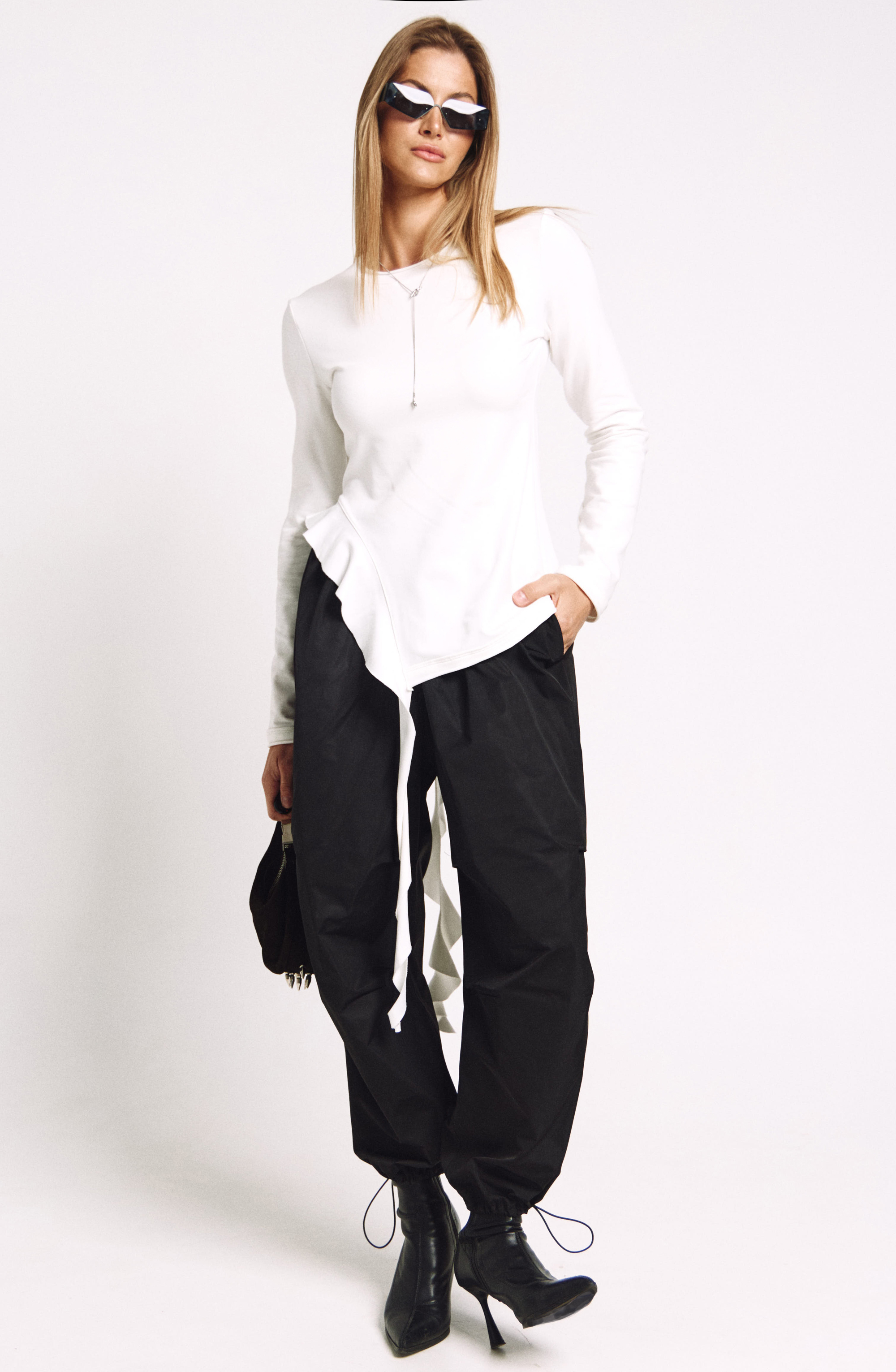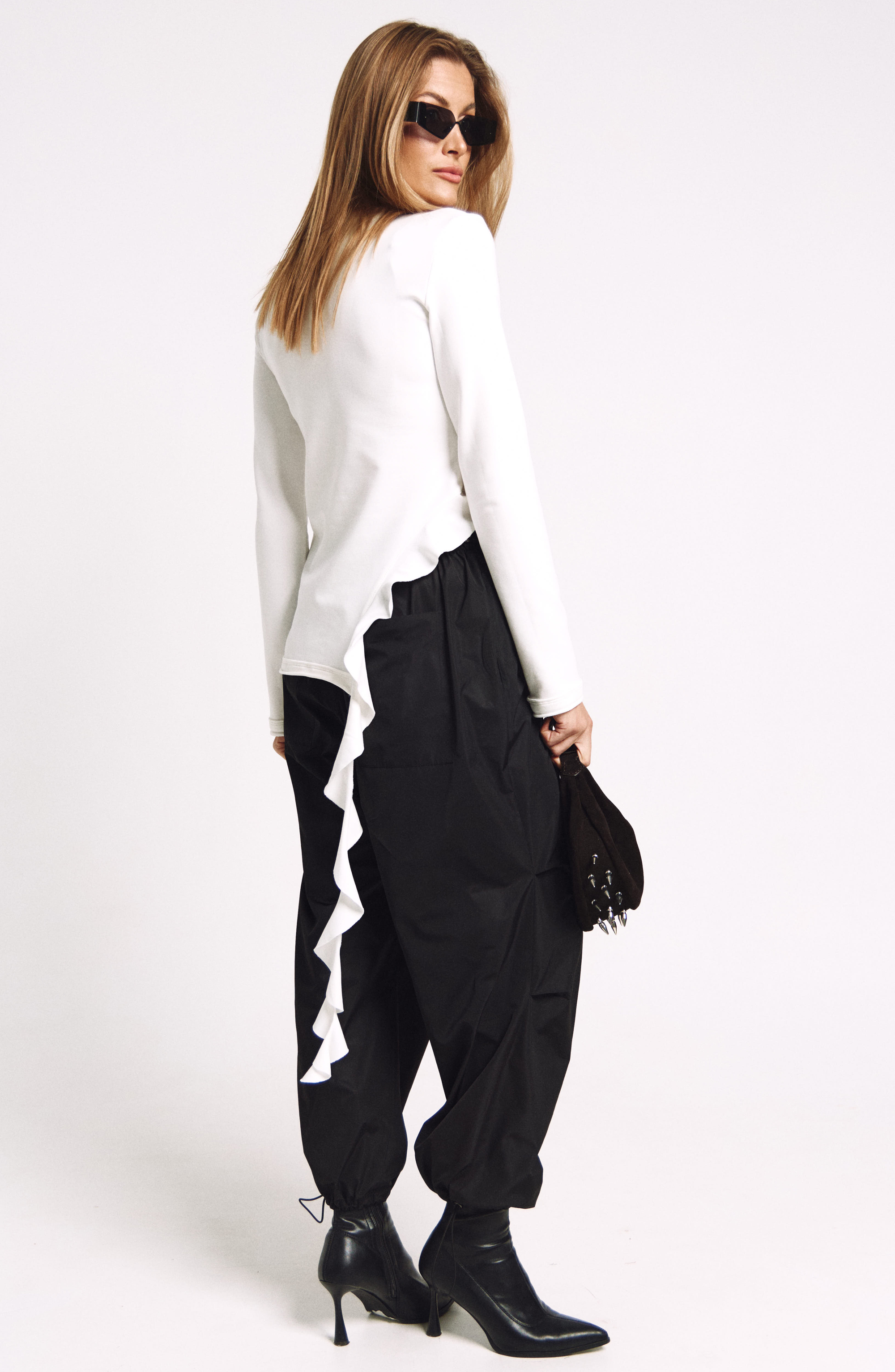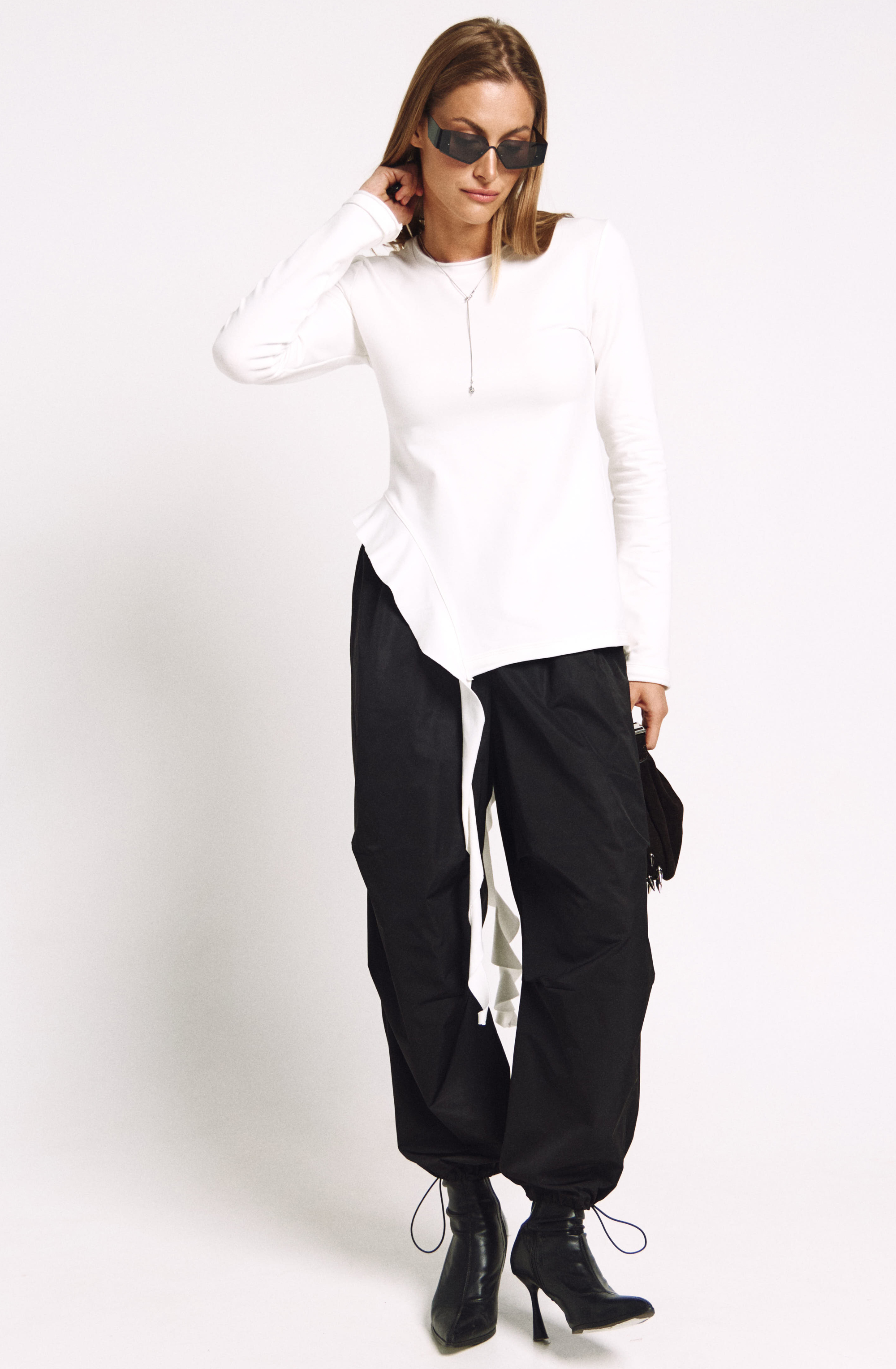 Лонгслив из смесового хлопка, с асимметричным боковым вырезом и притачной деталью-рюшей.