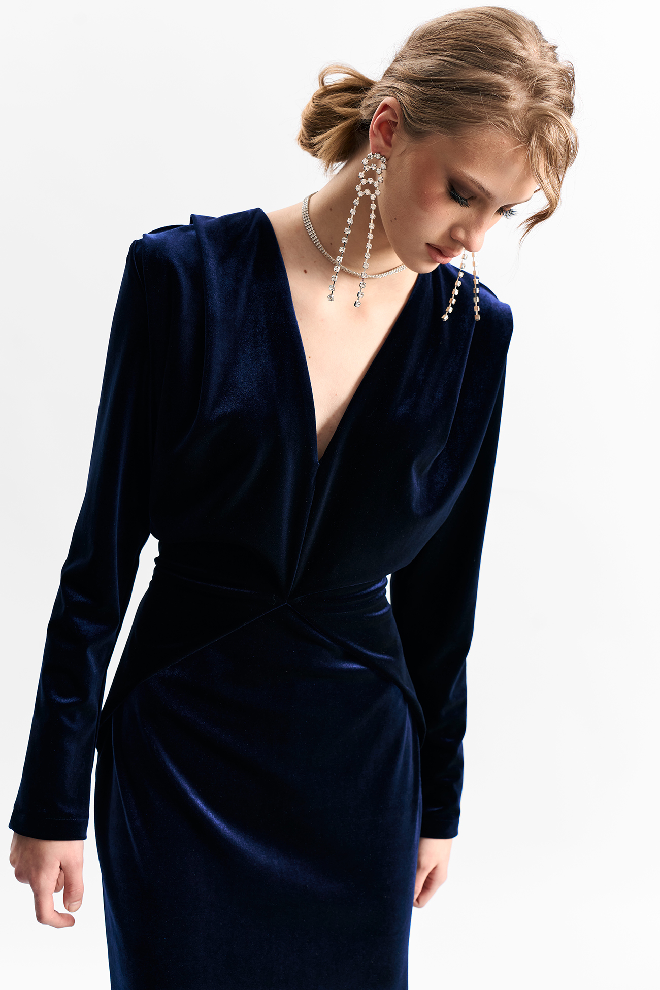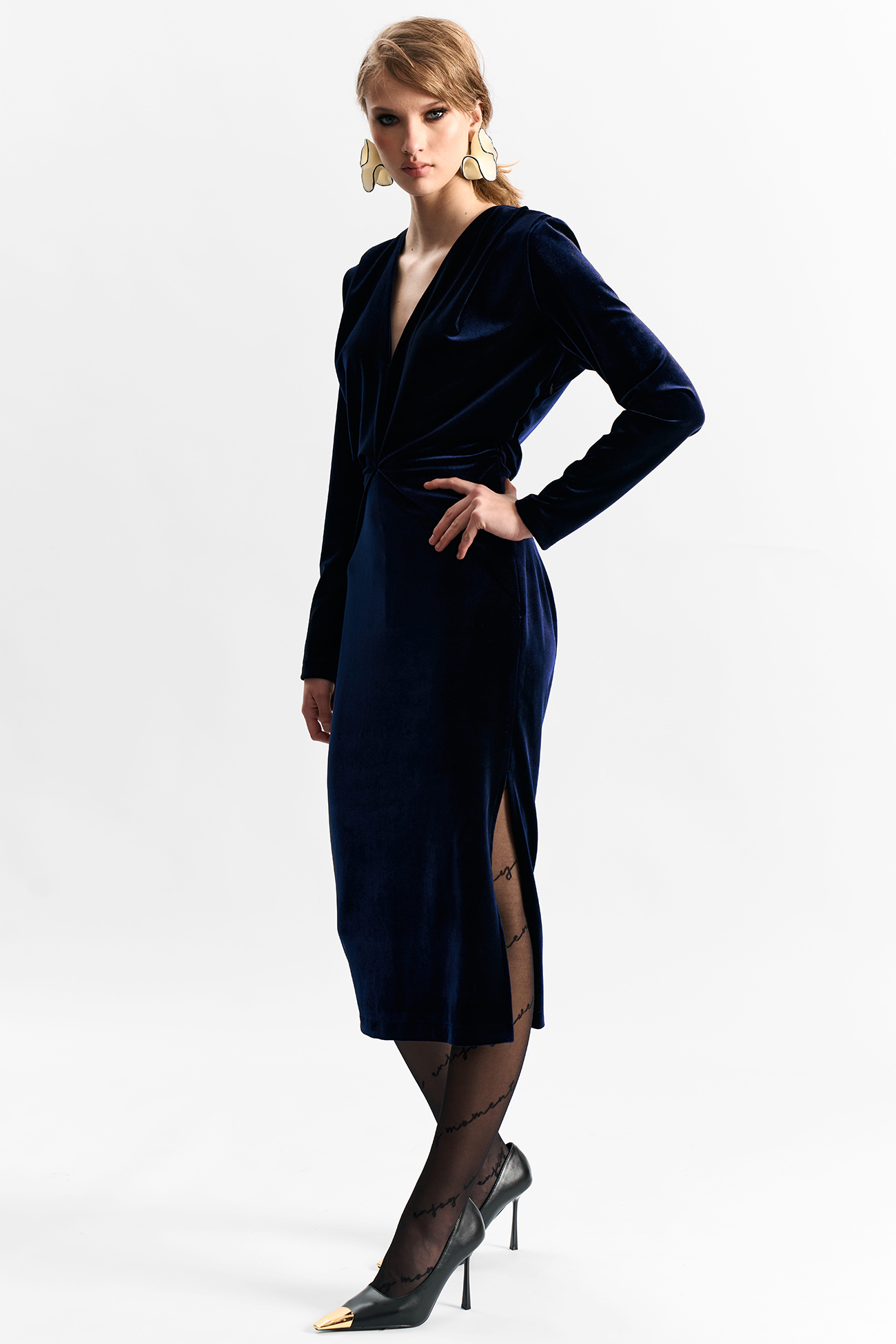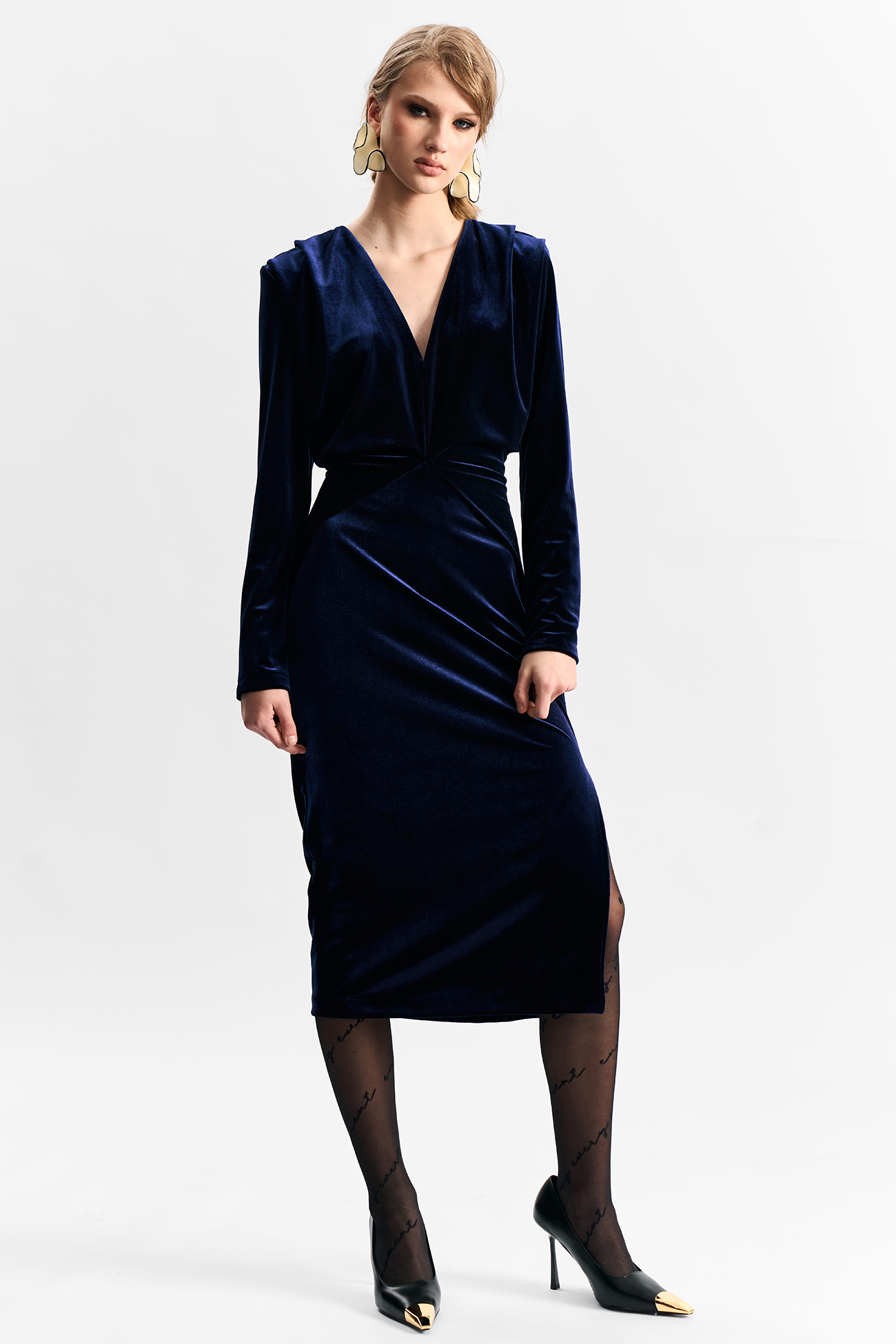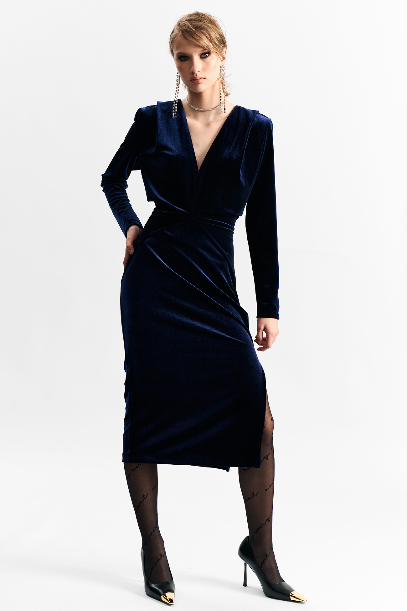 Платье прилегающего силуэта, с акцентными складками по плечу. Заложенные складки по талии. Сбоку - разрез. Платье из плотного бархата глубокого синего цвета.Состав: 100% полиэстер