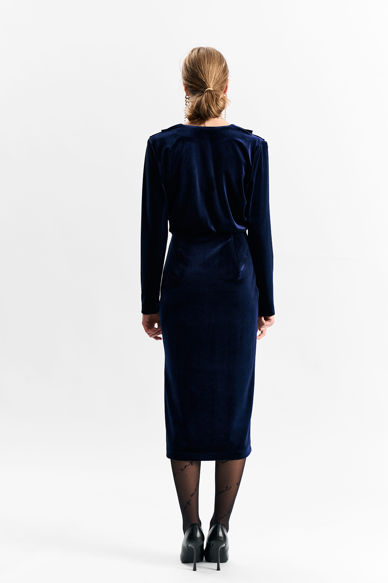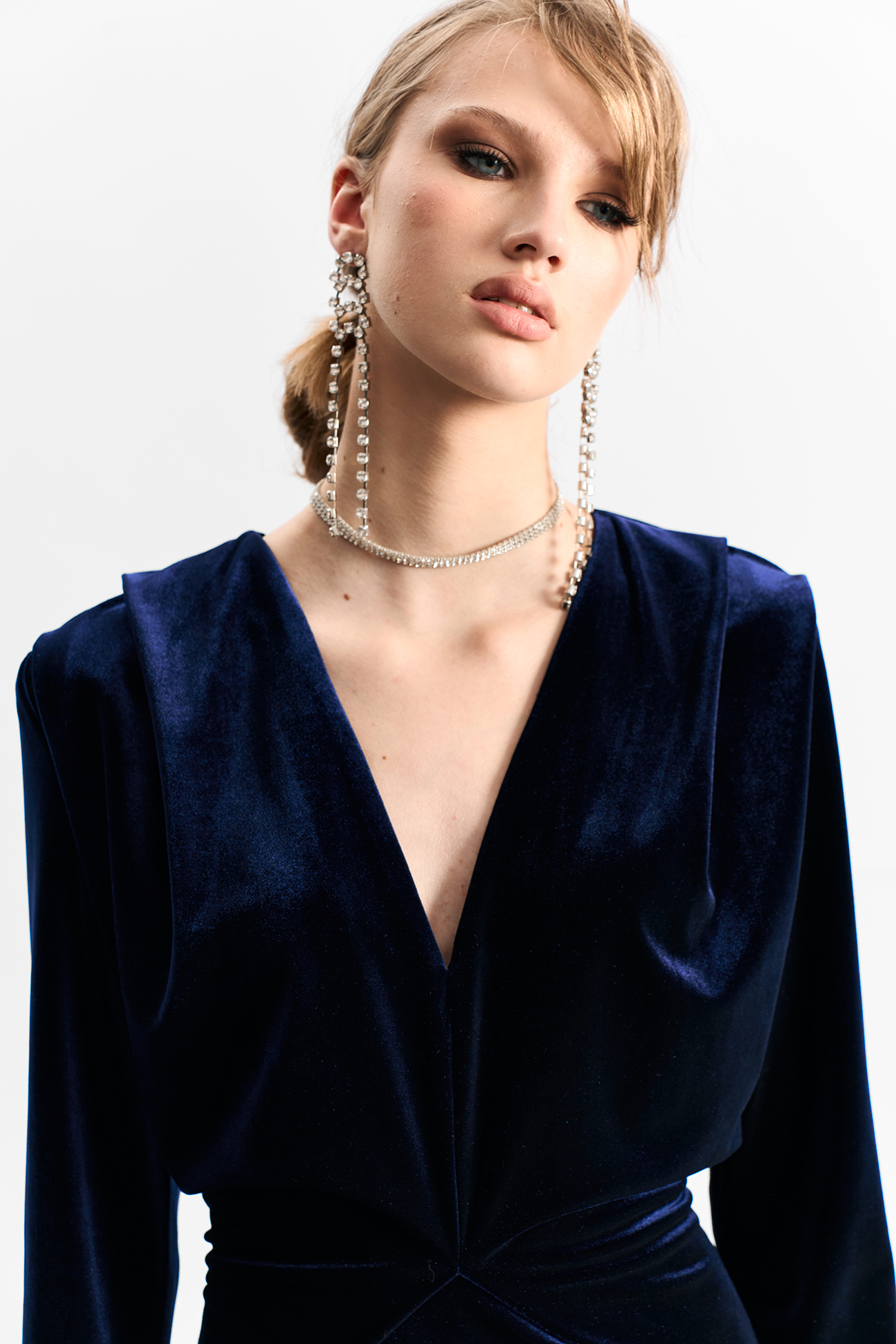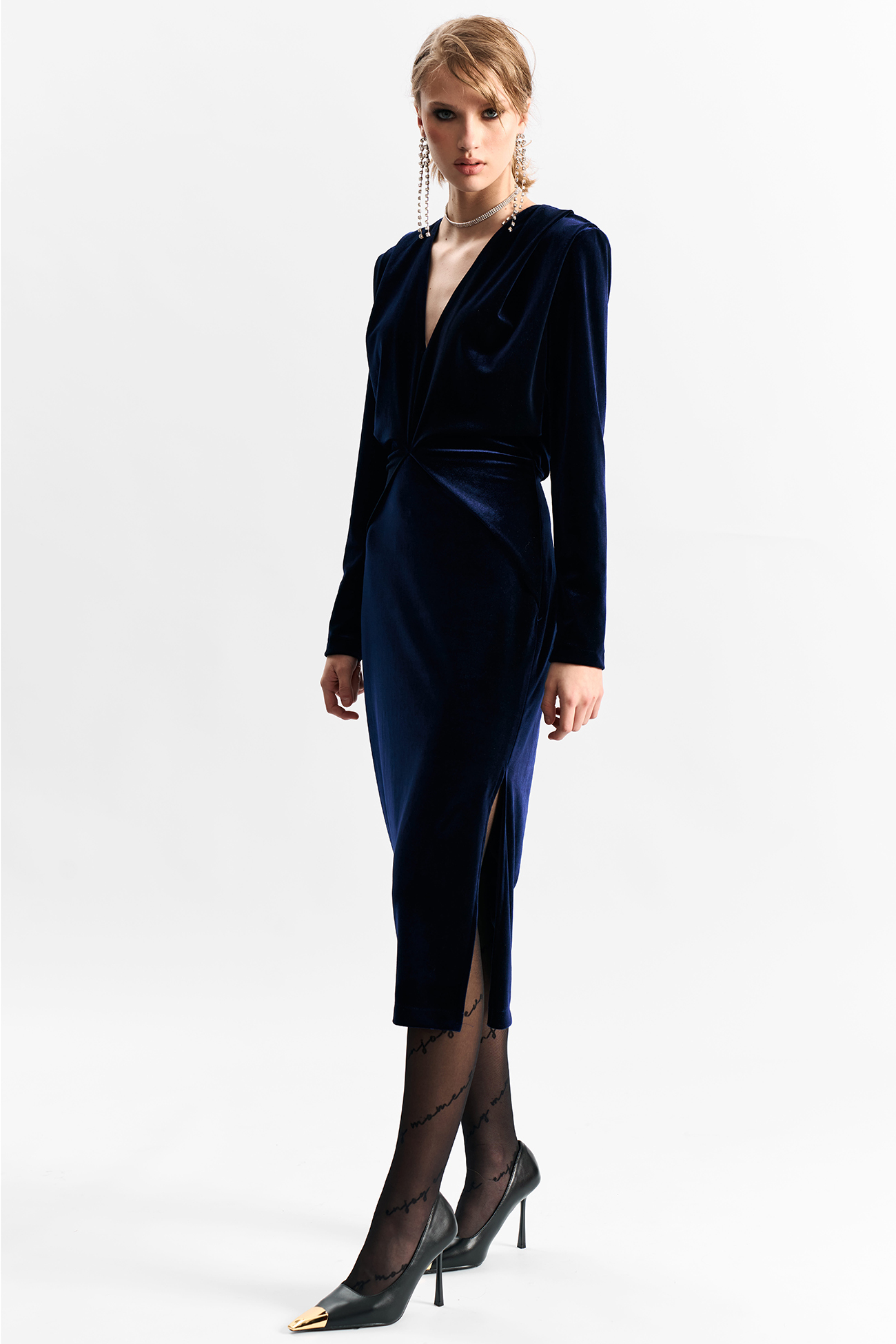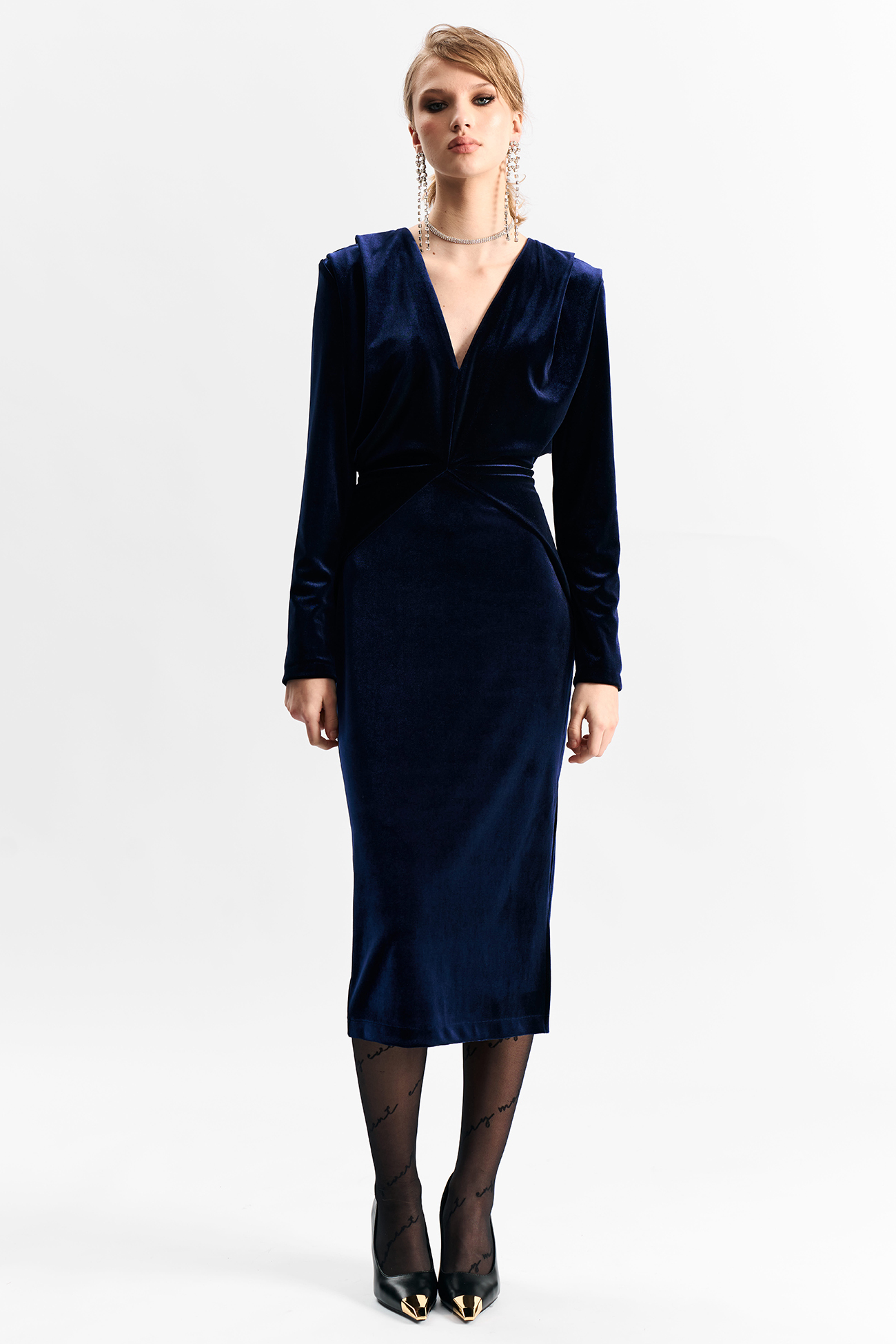 Платье прилегающего силуэта, с акцентными складками по плечу. Заложенные складки по талии. Сбоку - разрез. Платье из плотного бархата глубокого синего цвета.Состав: 100% полиэстер