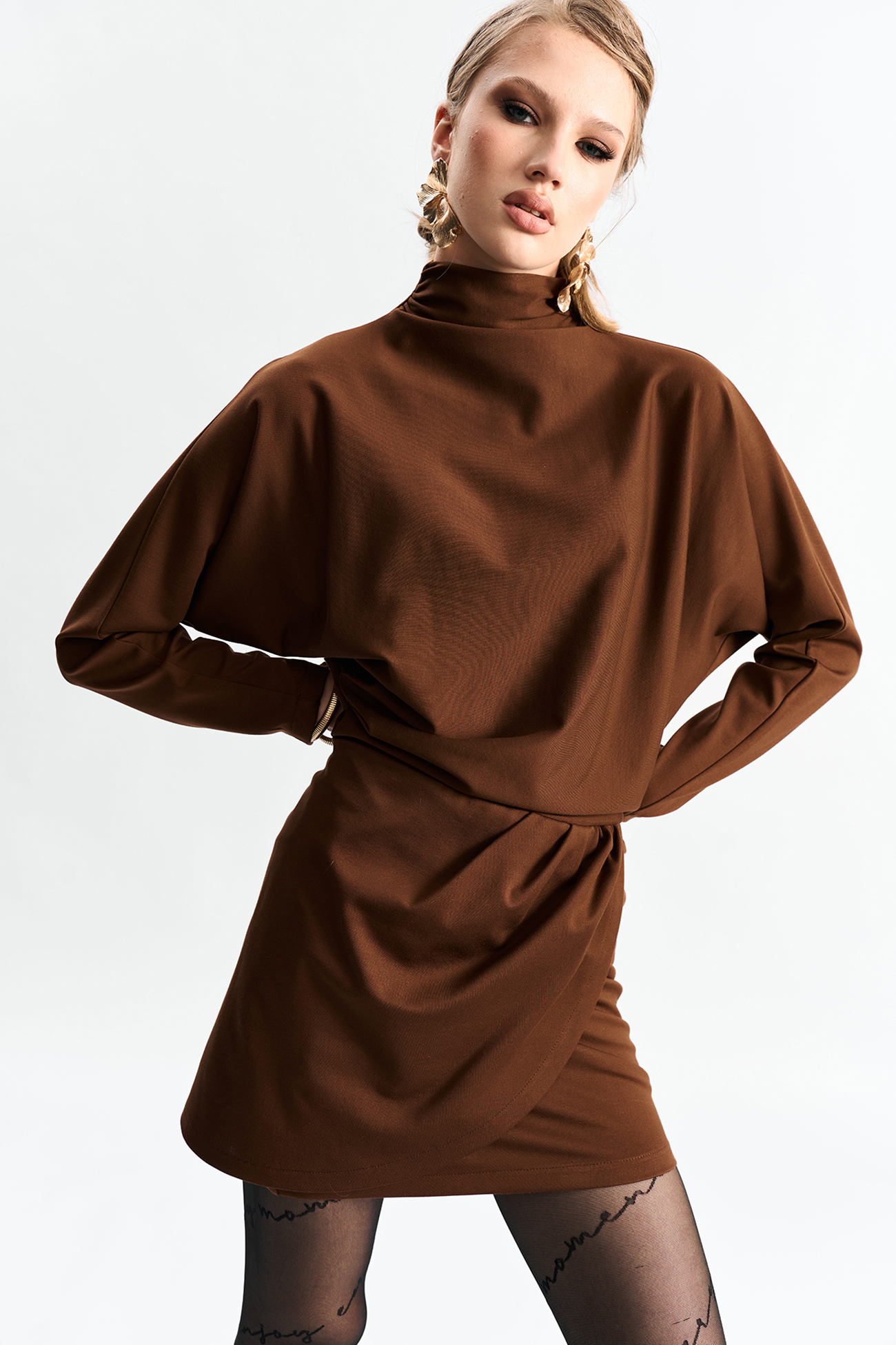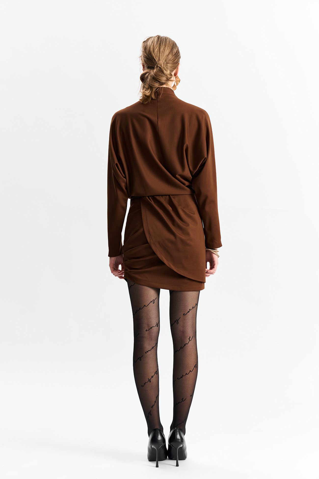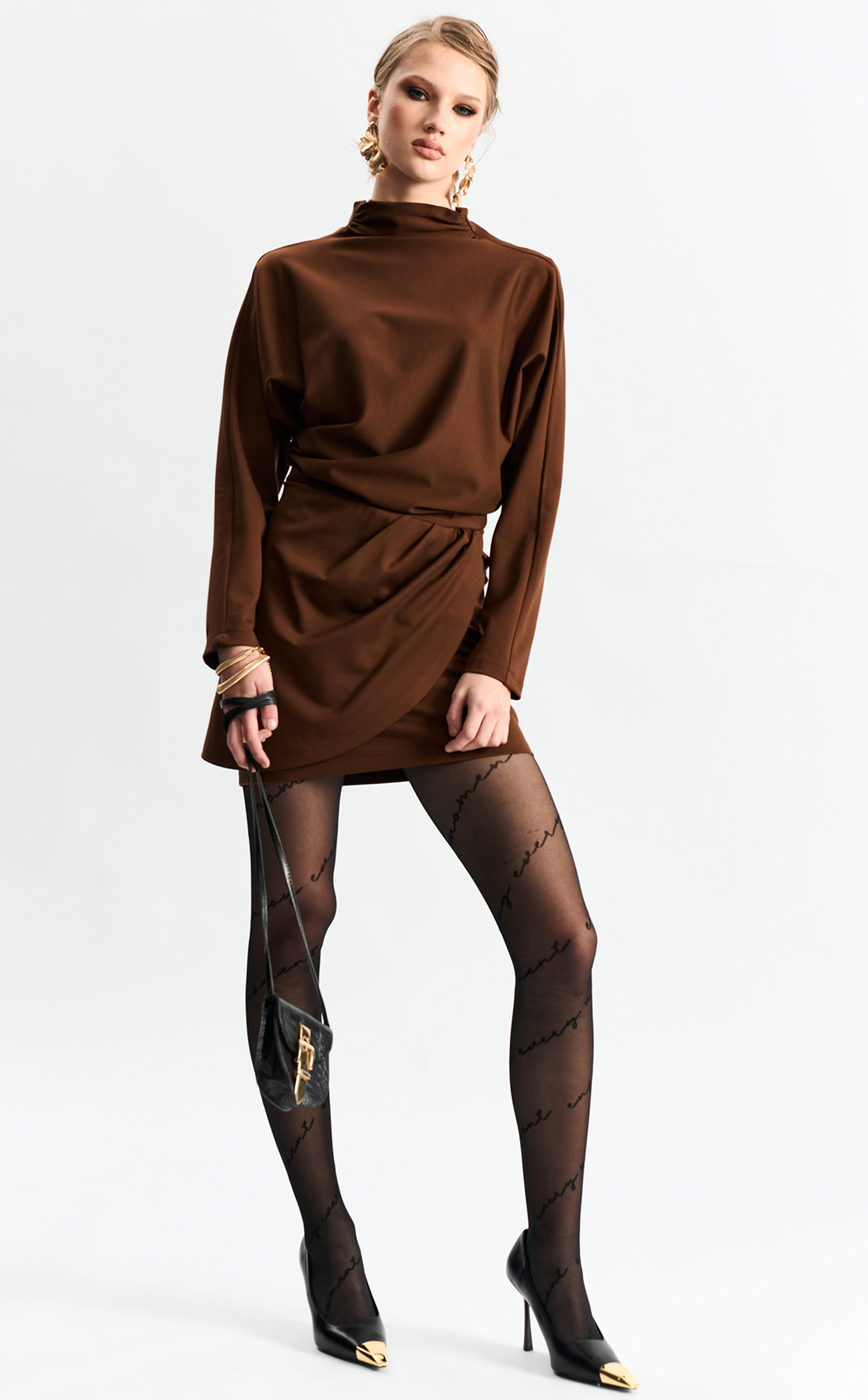 Платье длиной мини, отрезное по линии талии, с цельнокроеным рукавом.