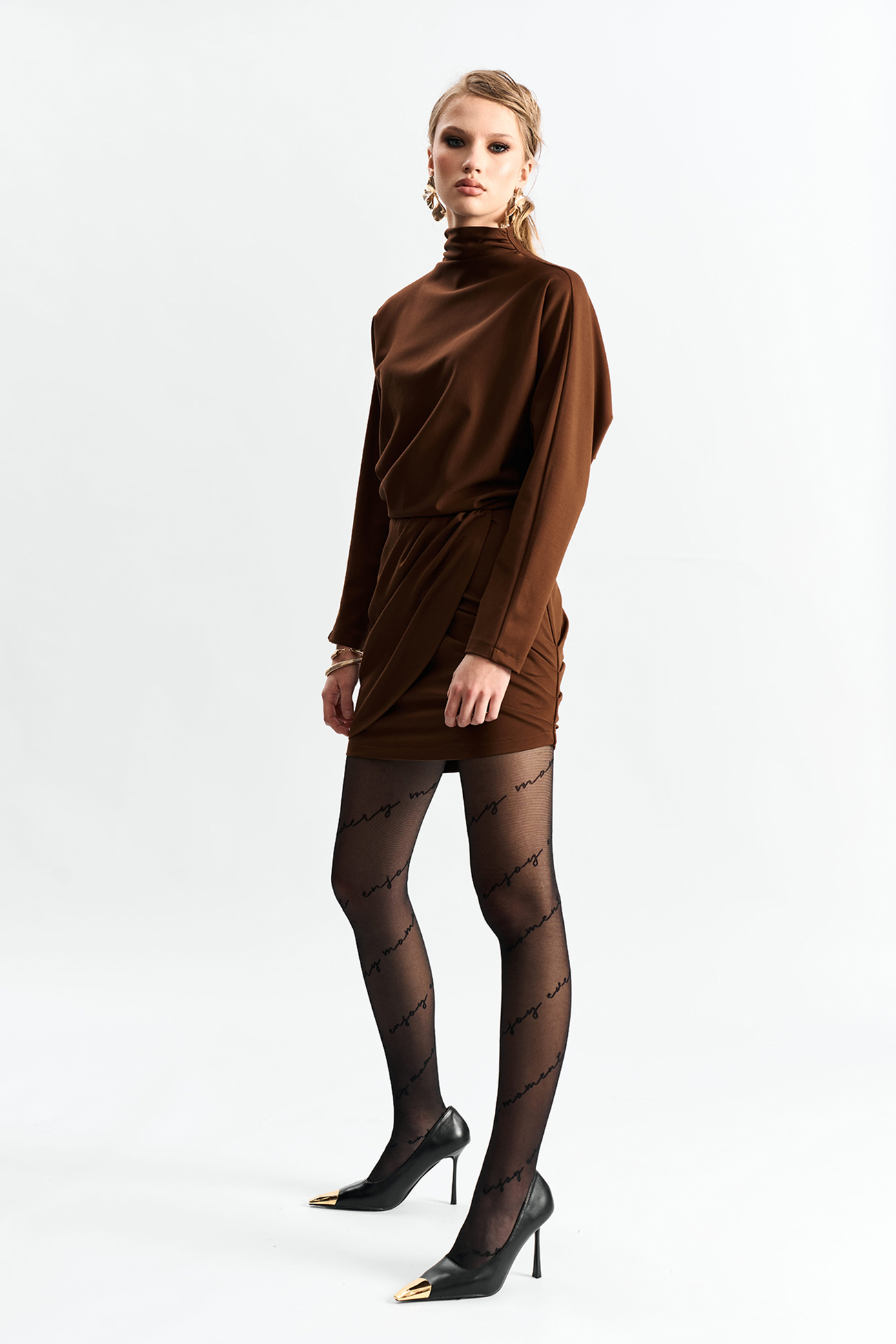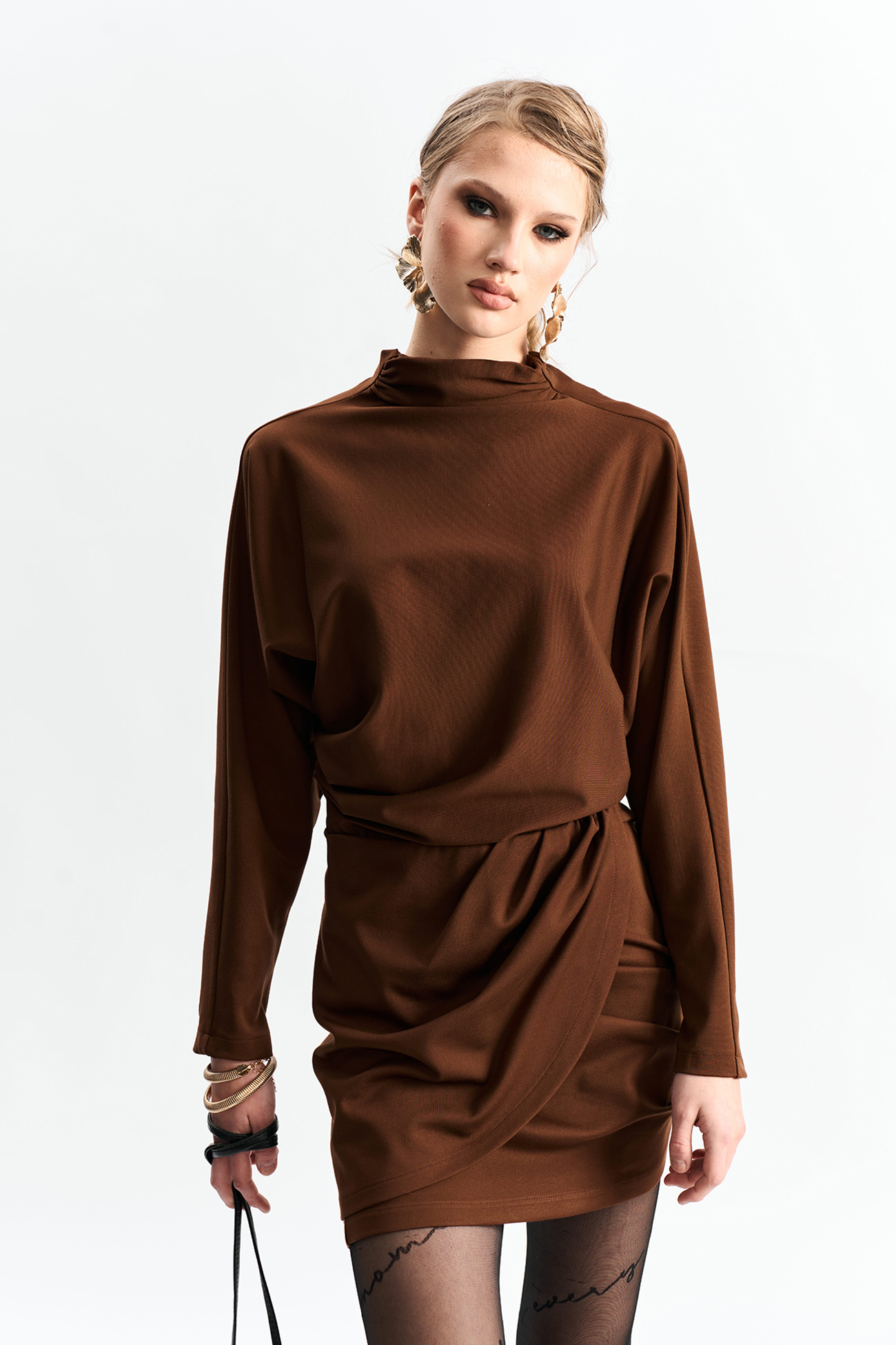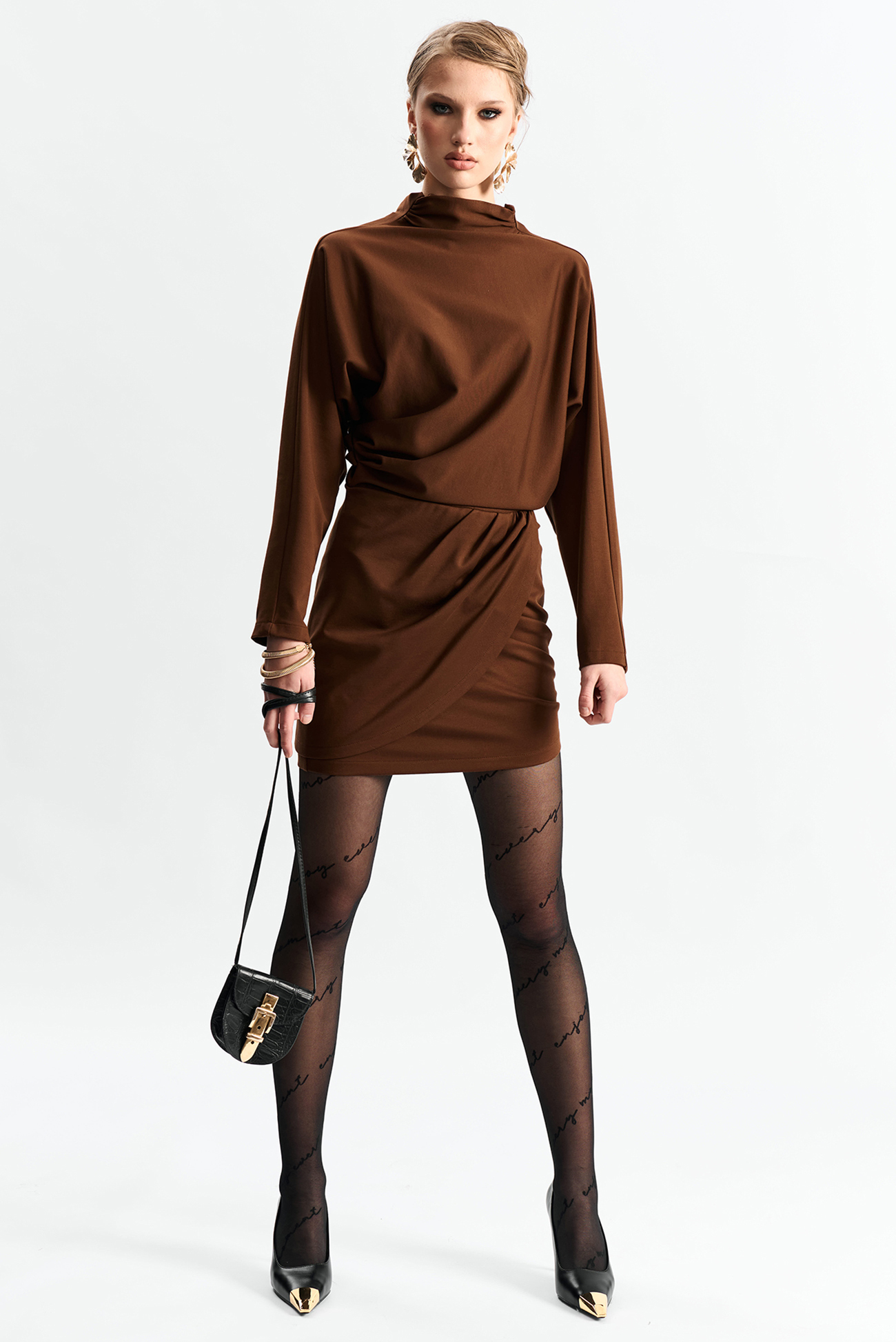 Платье длиной мини, отрезное по линии талии, с цельнокроеным рукавом.