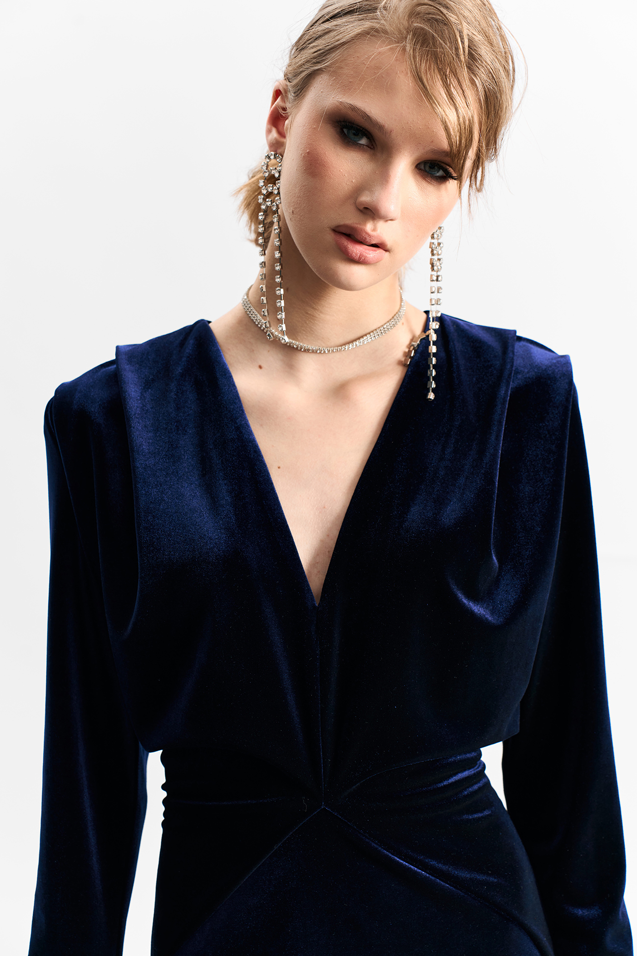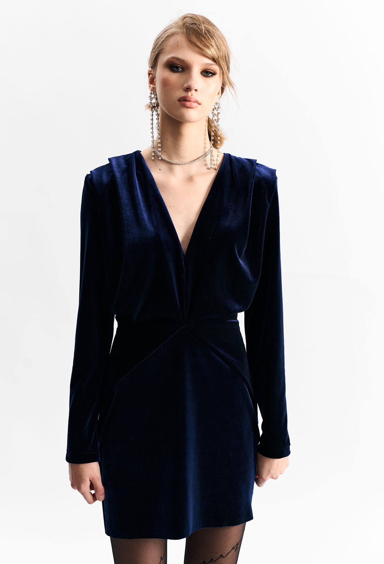 Платье из плотного бархата глубокого темно-синего цвета с акцентными складками на плечах и по талии.Состав: вискоза 60%, полиамид 35%, спандекс 5%