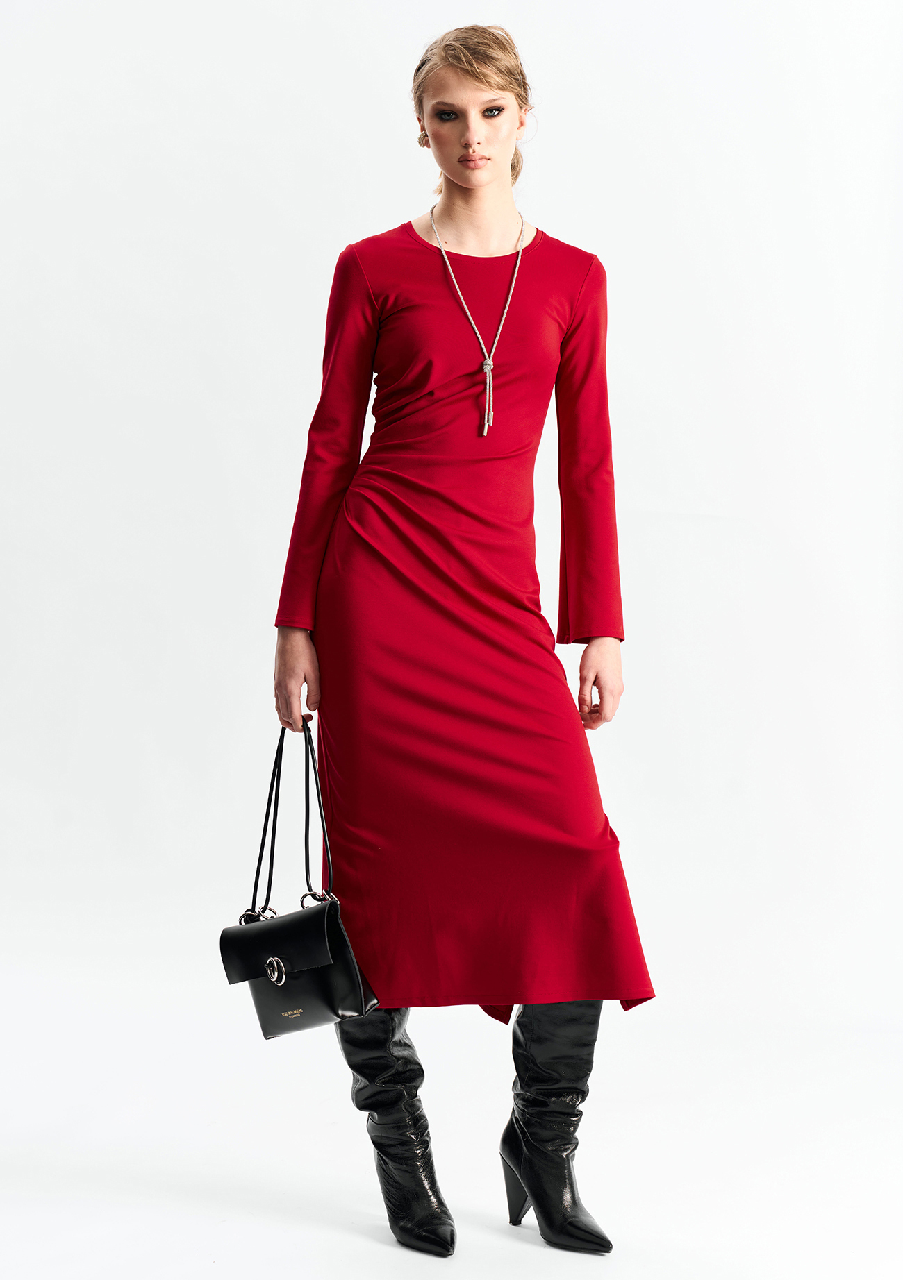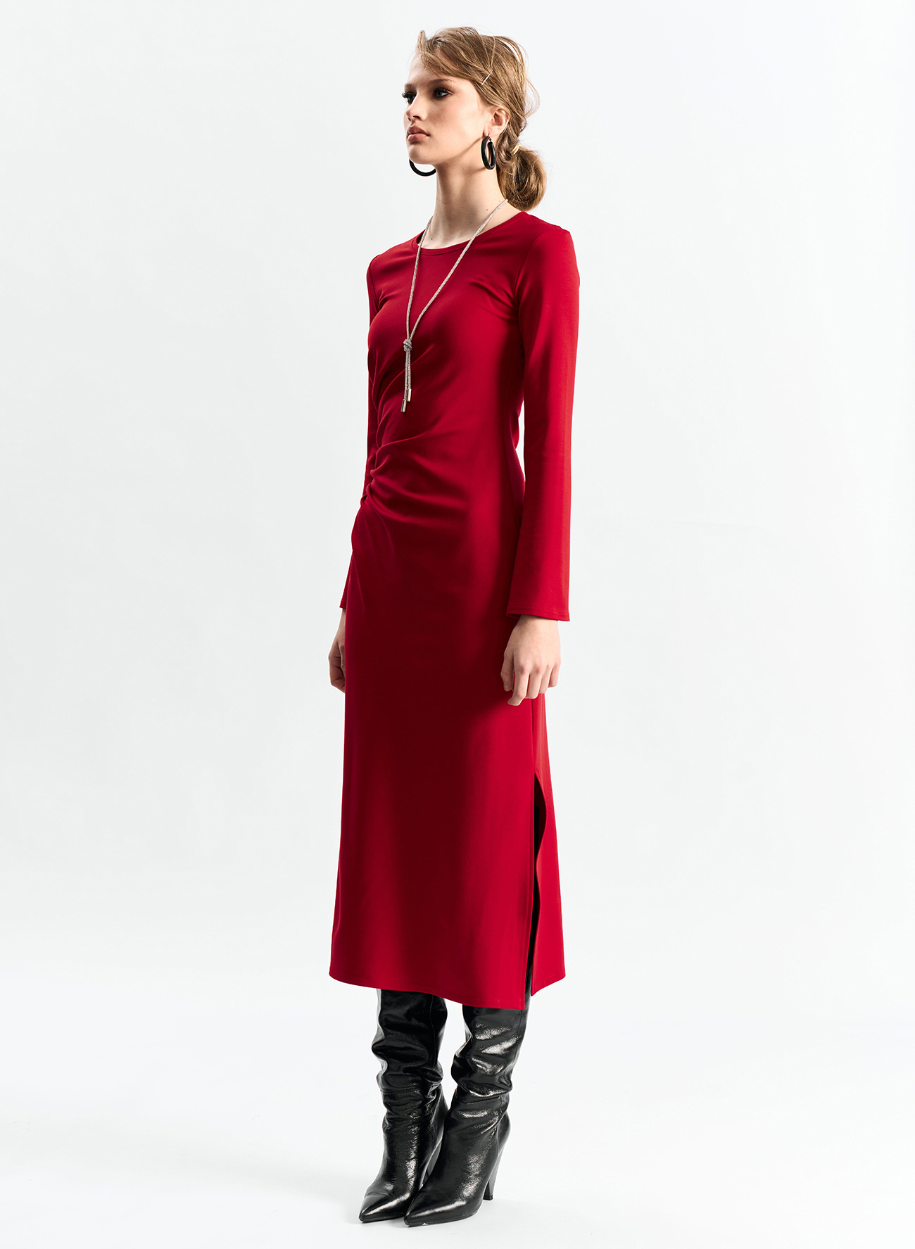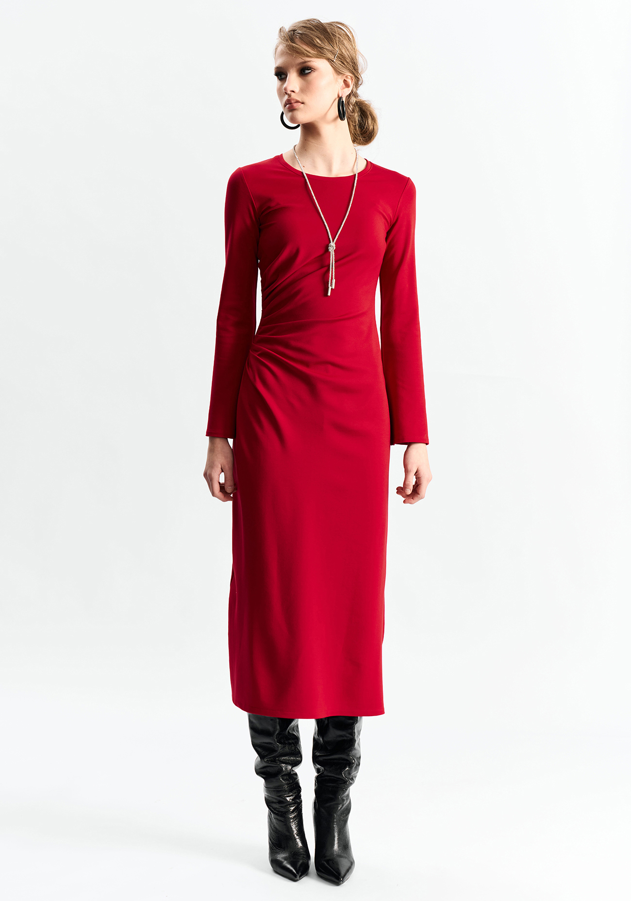 Платье из эластичного материала, прилегающего по талии силуэта, со сборкой в области талии. Юбка А-образного силуэта. Рукав расширяется книзу. Платье без застежкиСостав: вискоза 60%, полиамид 35%, спандекс 5%