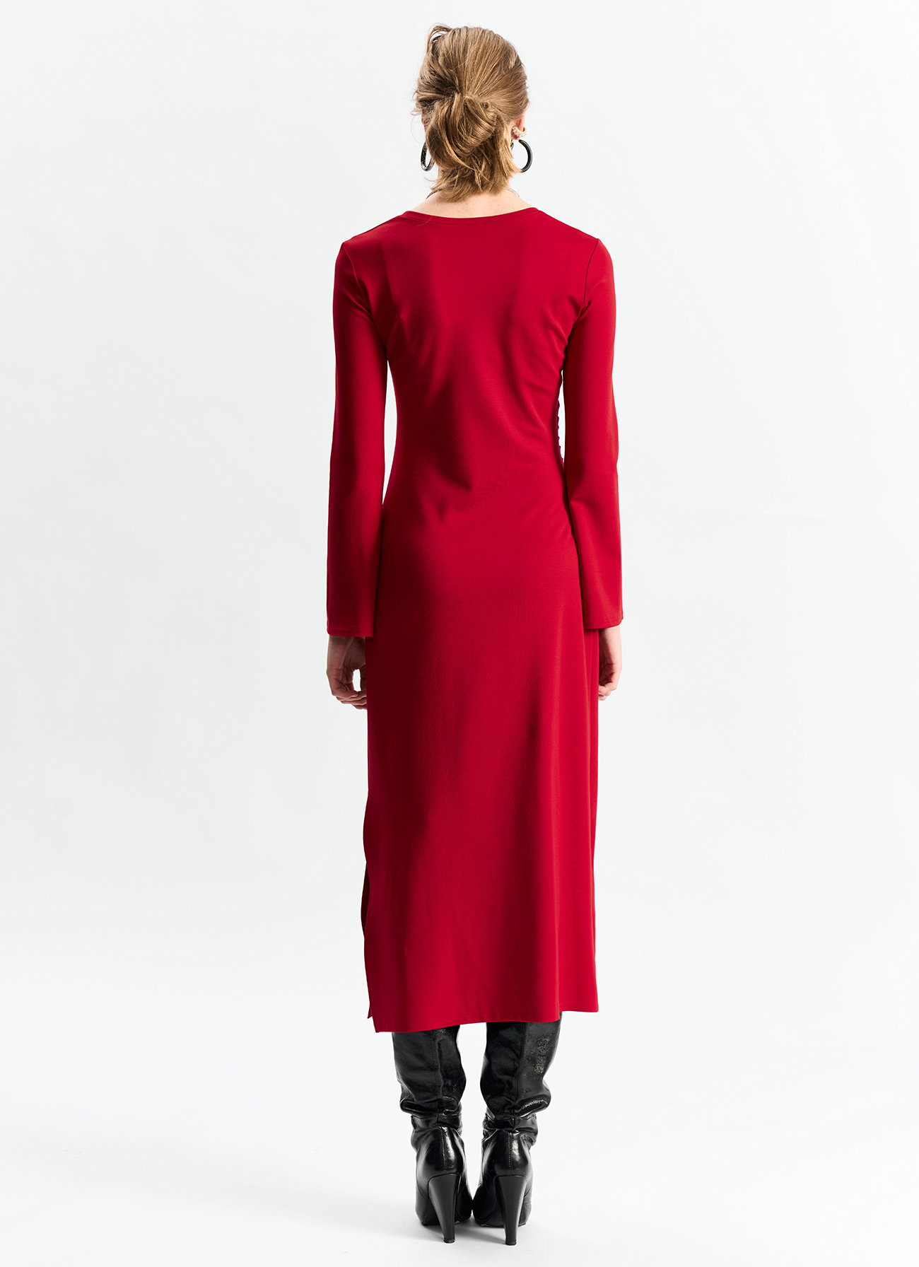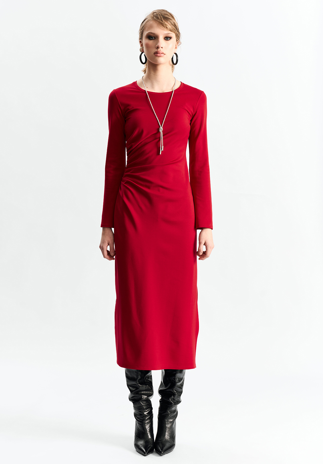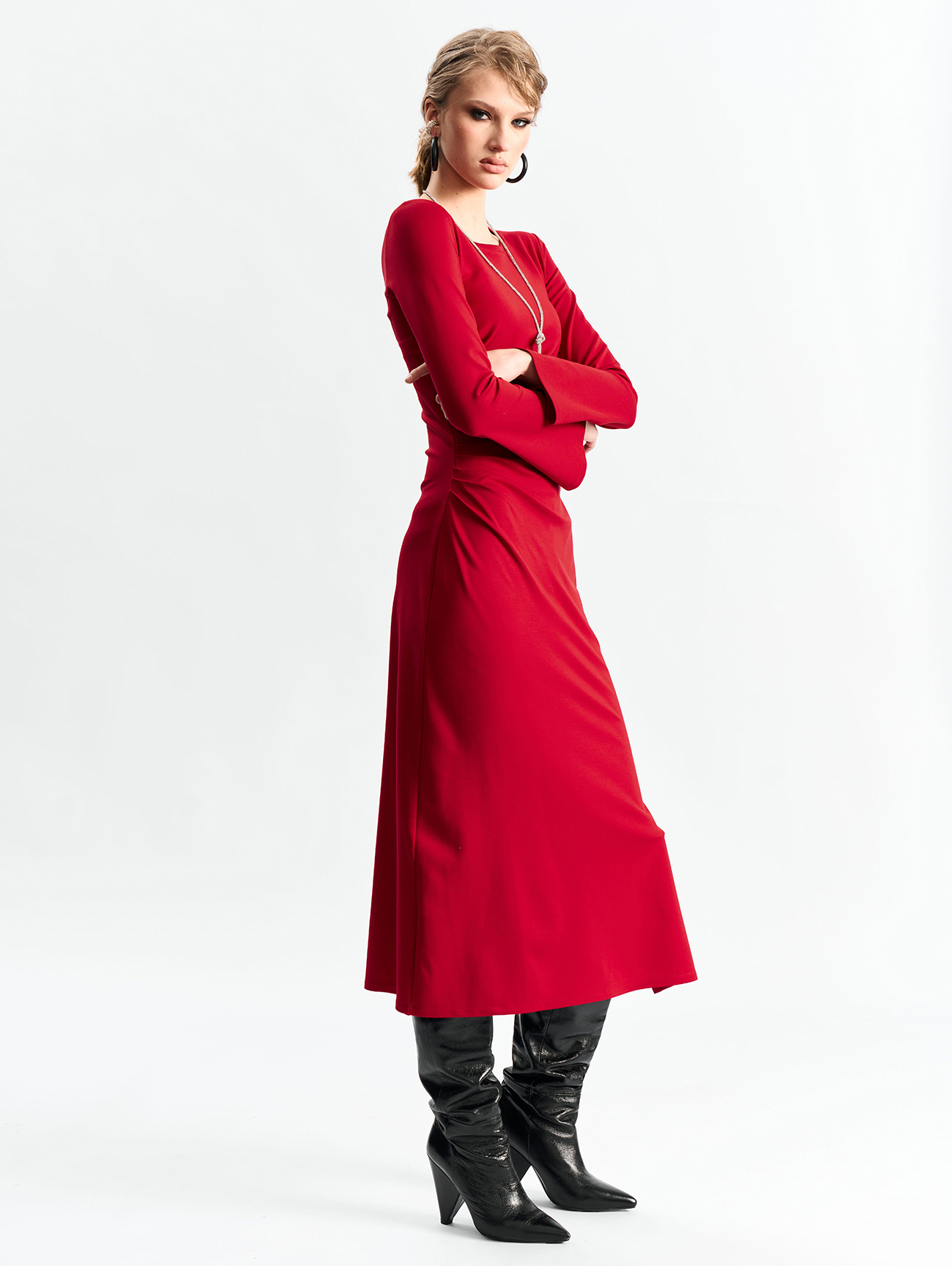 Платье из эластичного материала, прилегающего по талии силуэта, со сборкой в области талии. Юбка А-образного силуэта. Рукав расширяется книзу. Платье без застежкиСостав: вискоза 60%, полиамид 35%, спандекс 5%