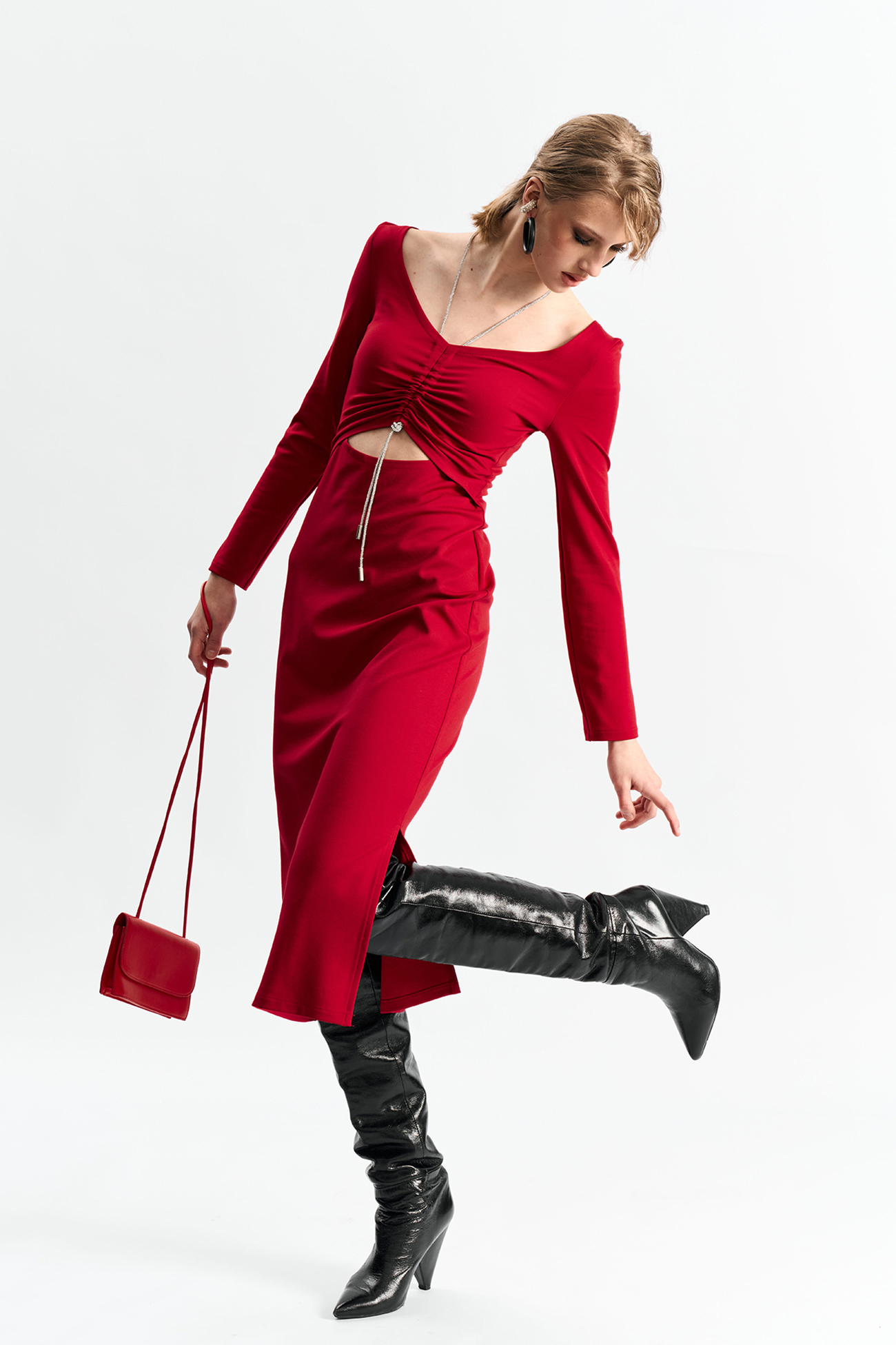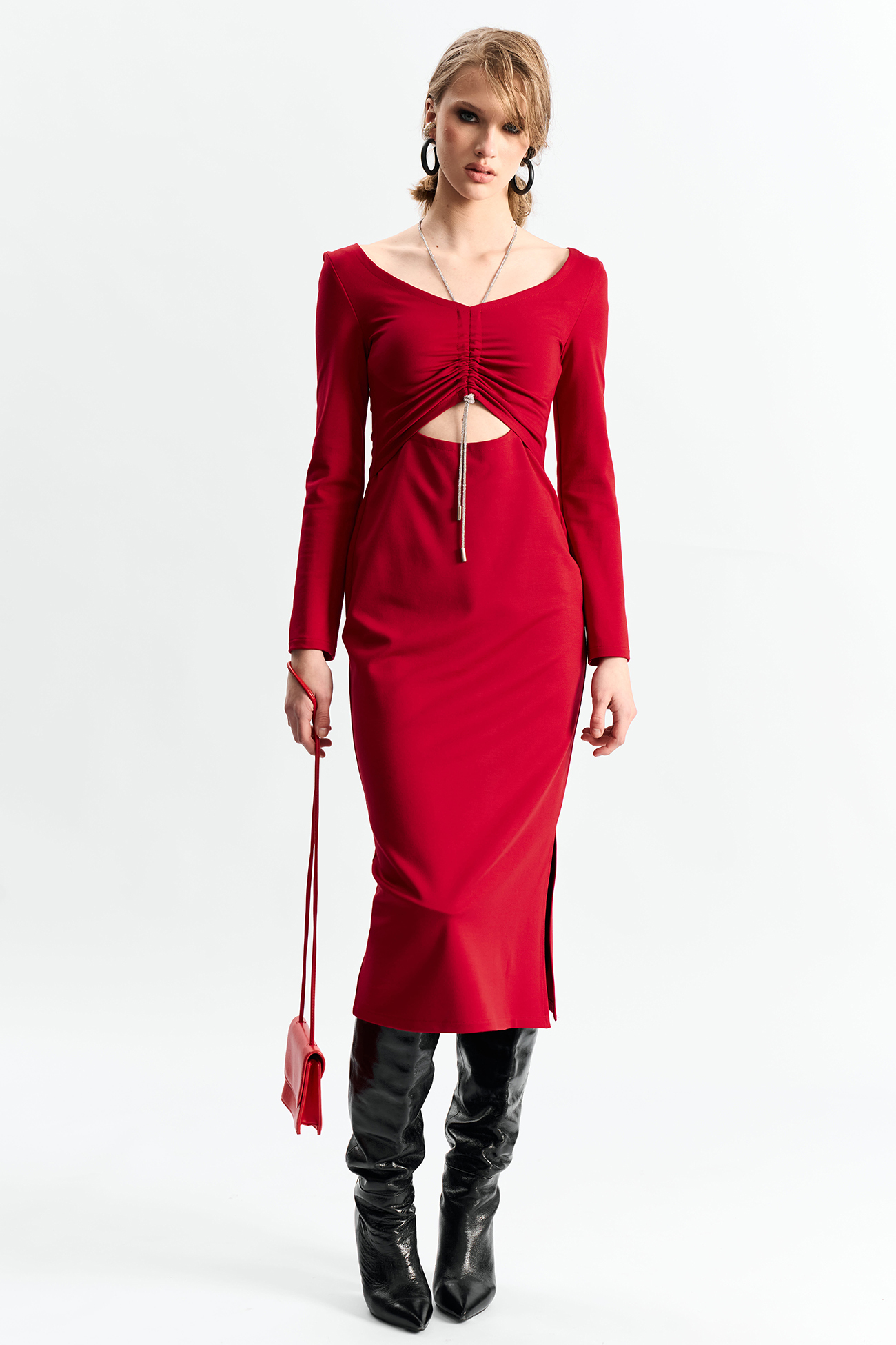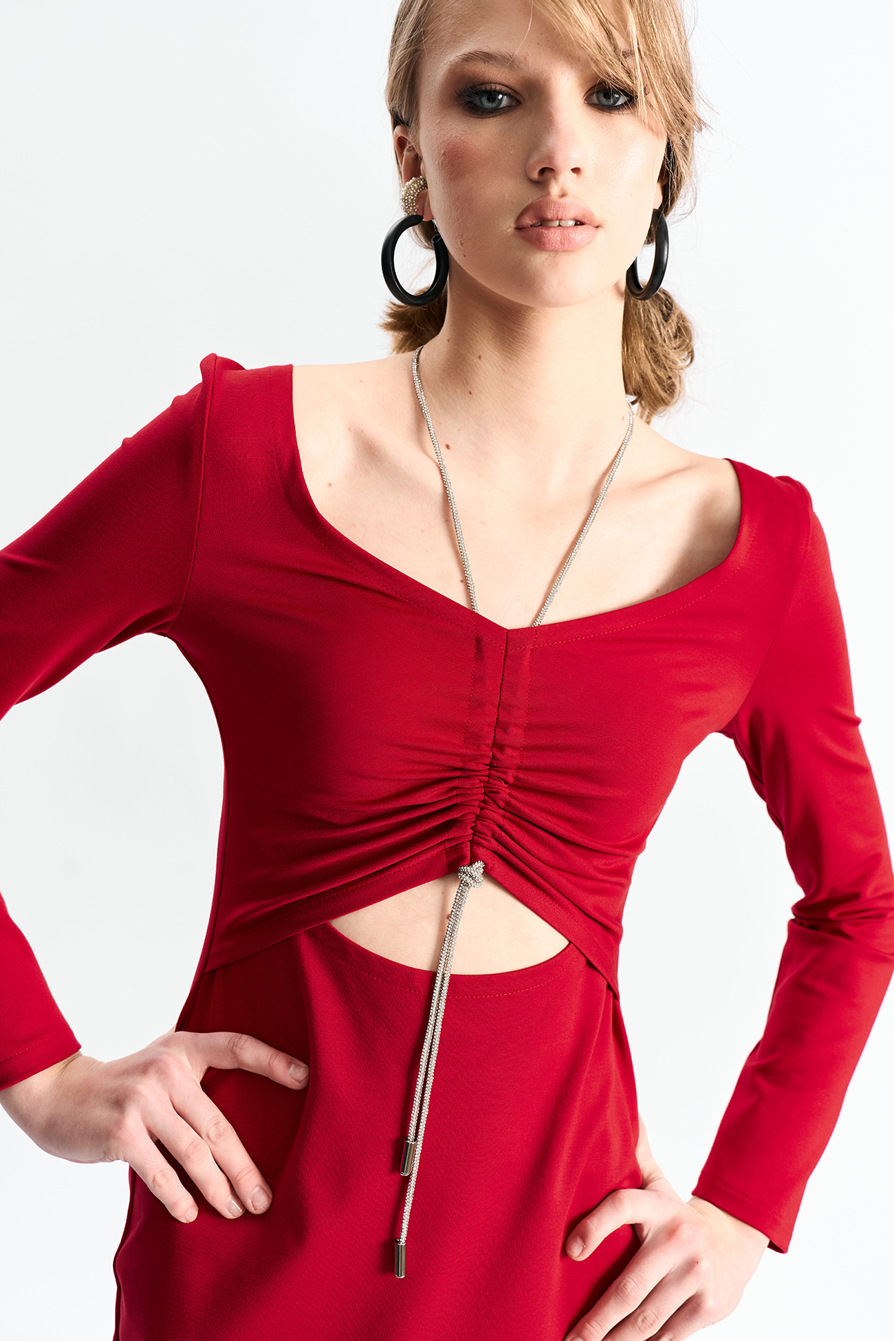 Платье прилегающего силуэта с подрезом в области талии и декоративным шнуром со стразами с затяжкой по груди .Состав: вискоза 60%, полиамид 35%, спандекс 5%