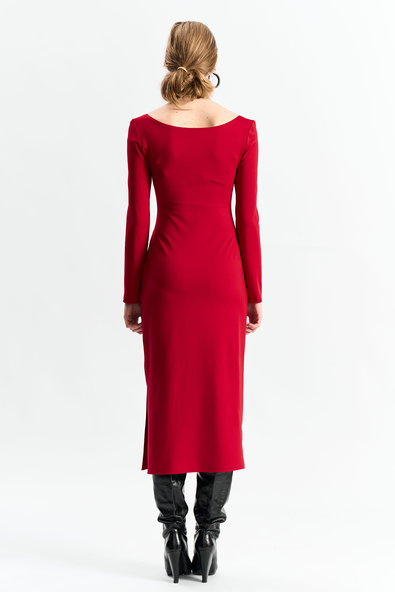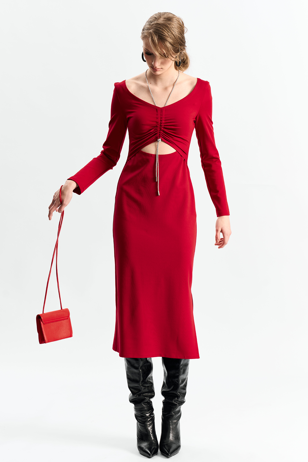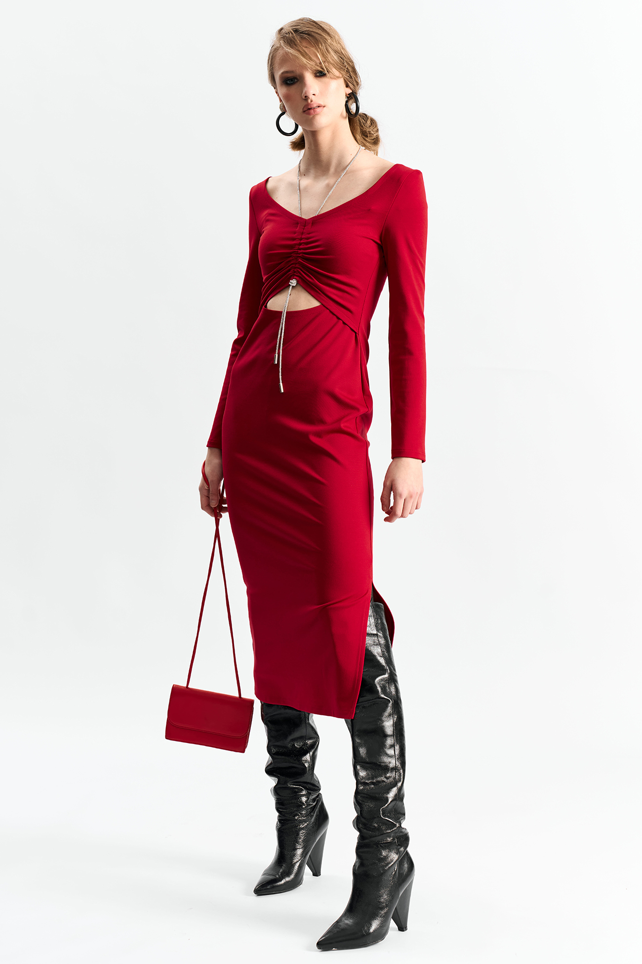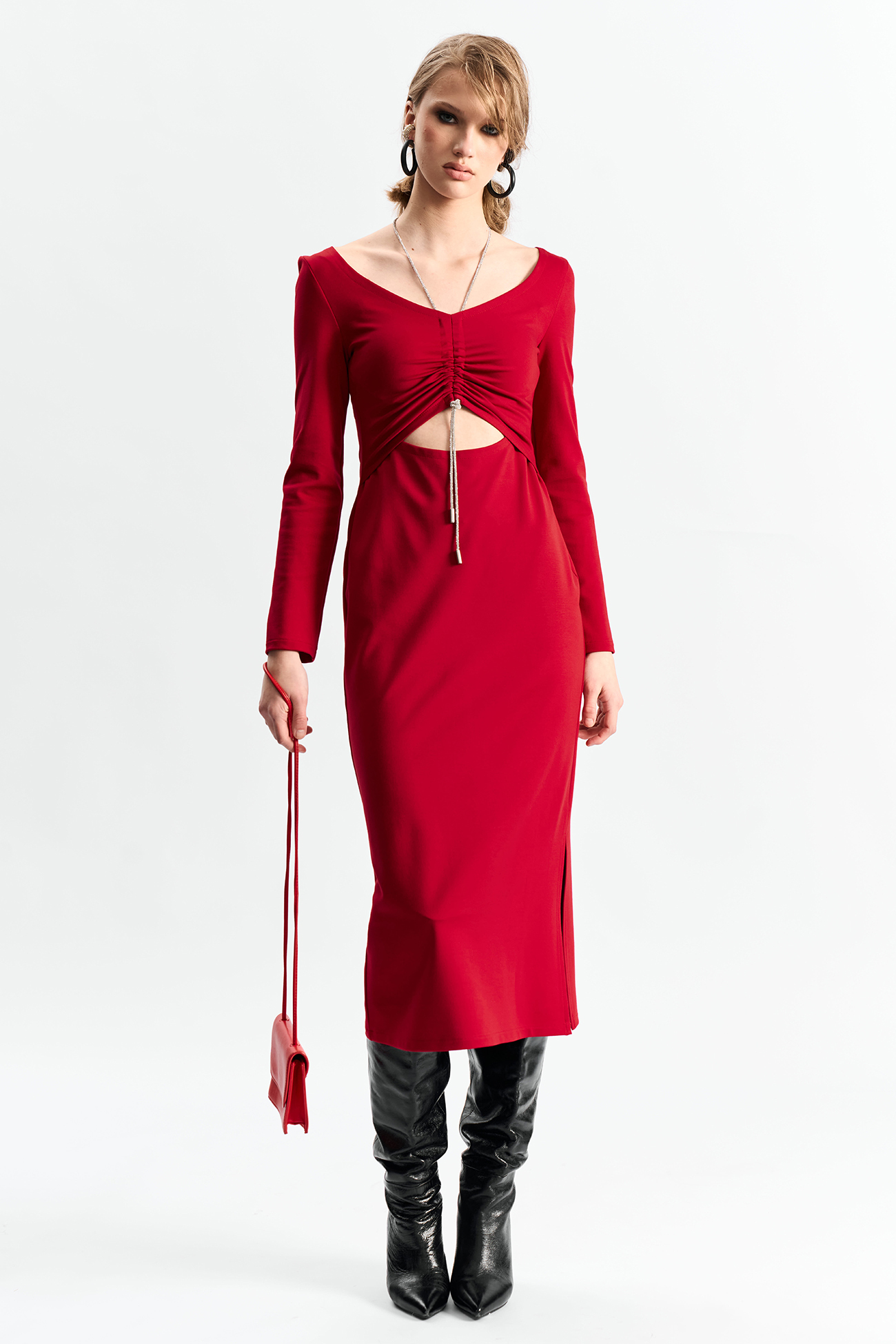 Платье прилегающего силуэта с подрезом в области талии и декоративным шнуром со стразами с затяжкой по груди .Состав: вискоза 60%, полиамид 35%, спандекс 5%