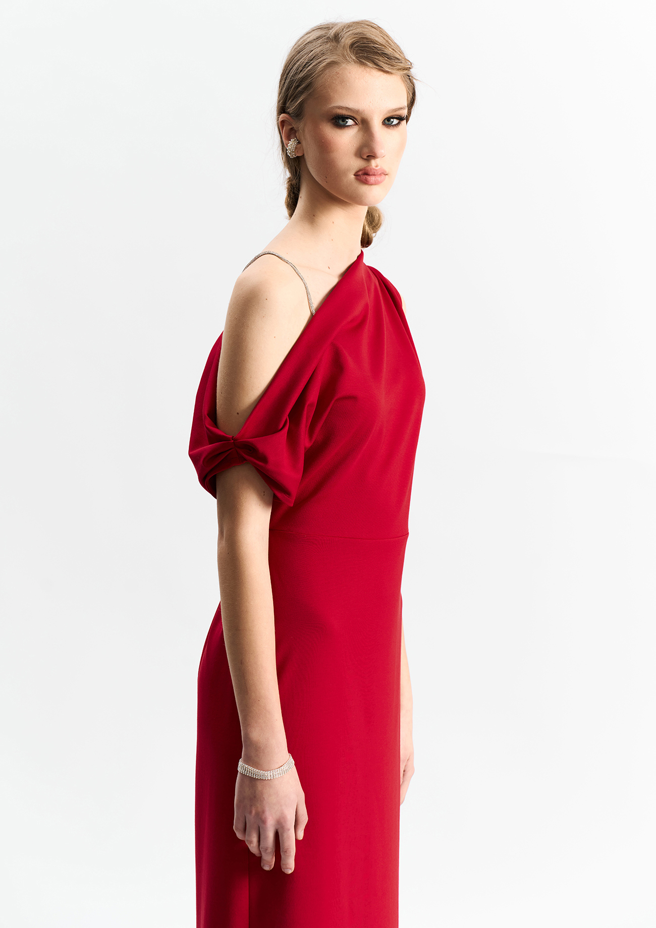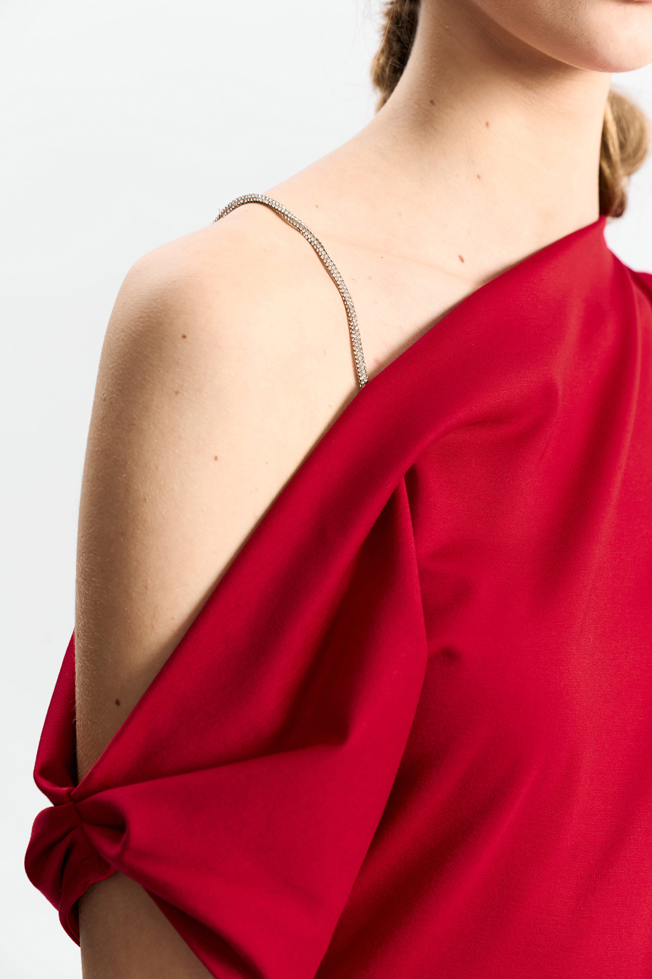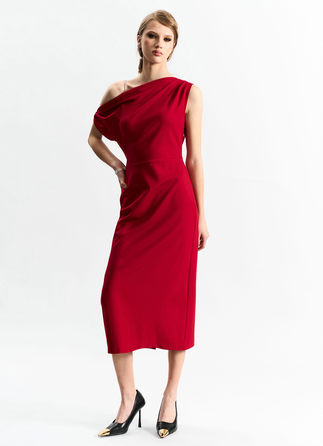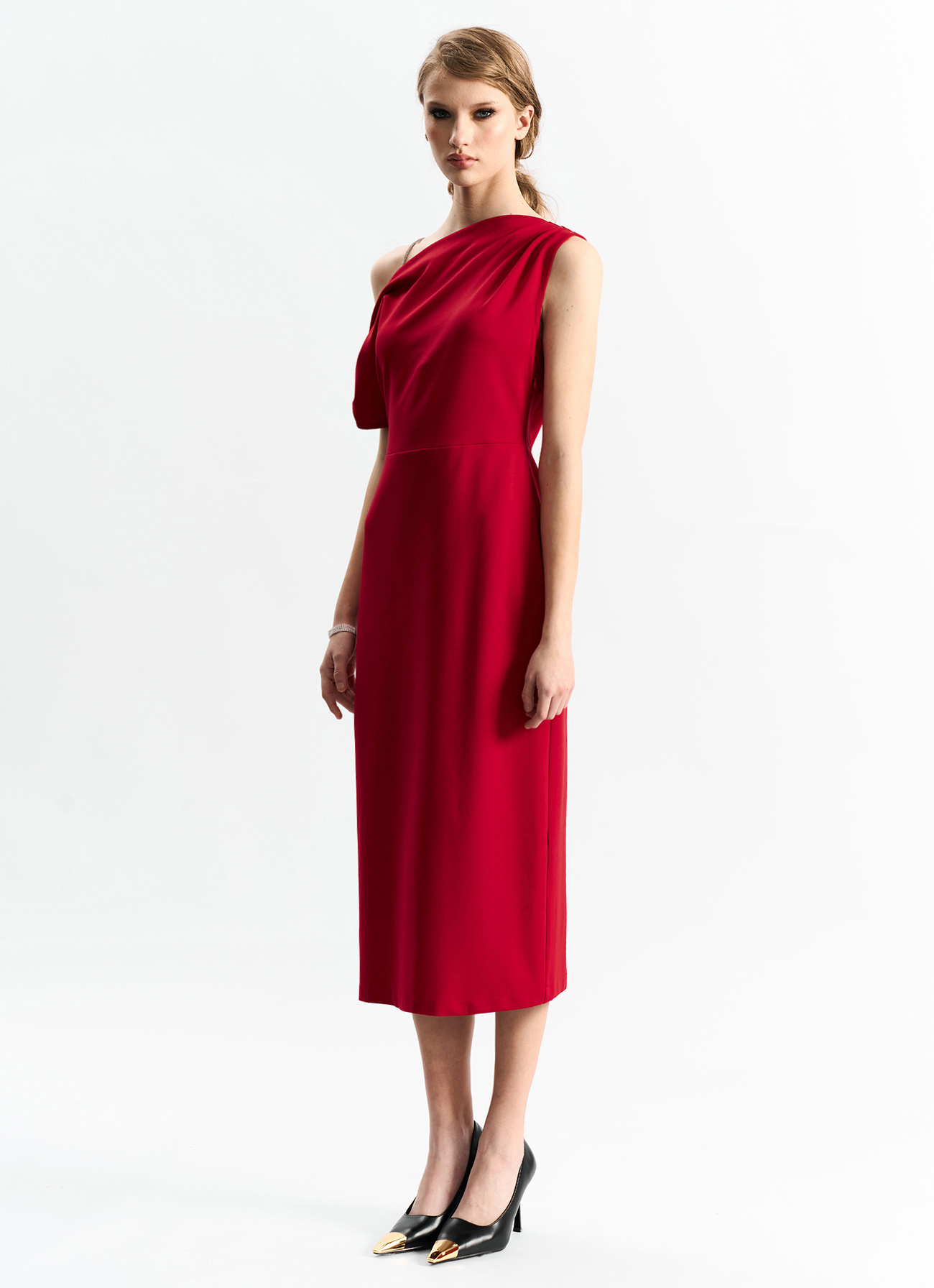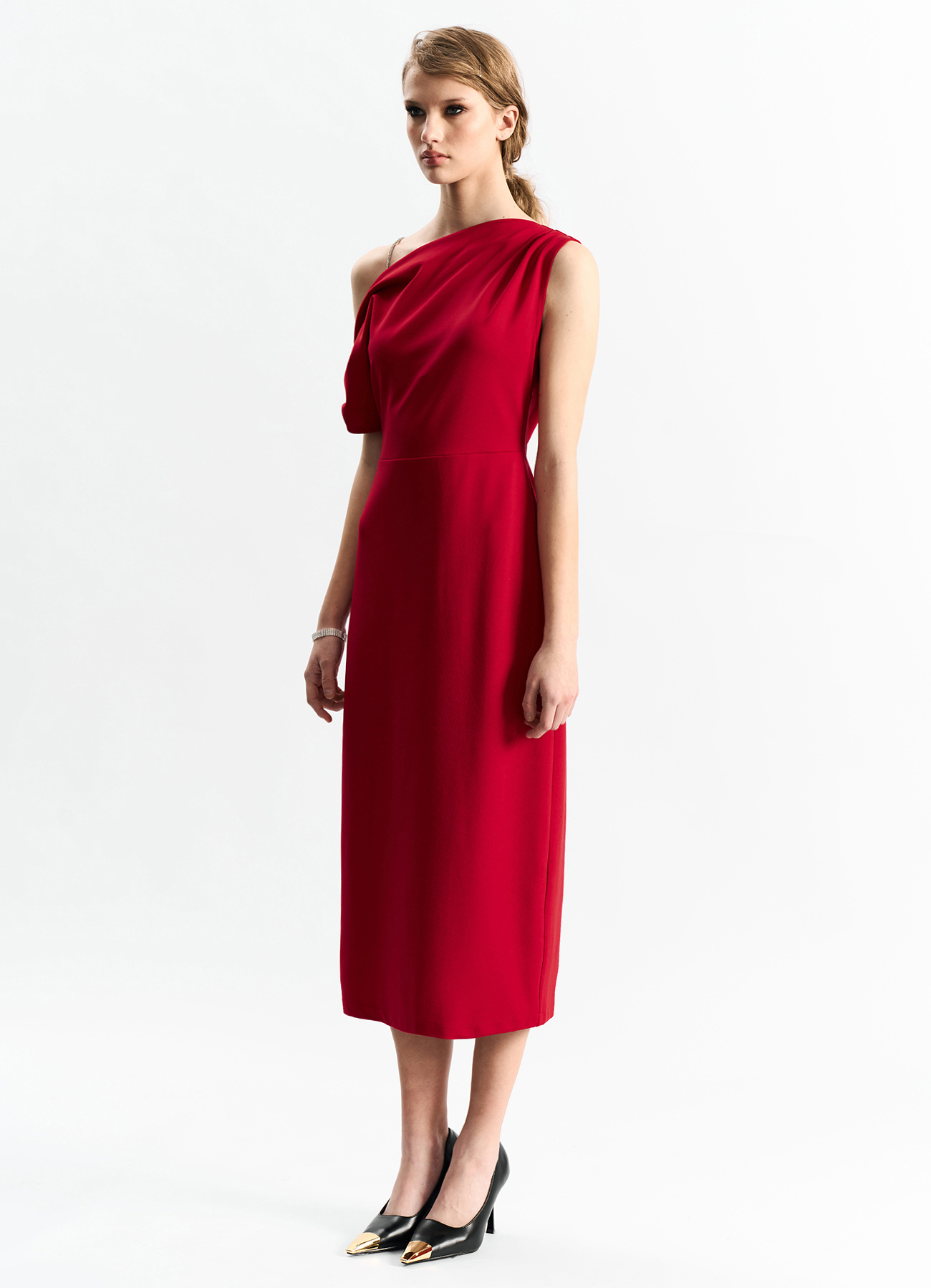 Платье прилегающего силуэта, с асимметричным вырезом горловины, длина "миди". Верхняя часть платья - отрезная. По плечевым срезам оформлены декоративные складки. Юбка с разрезом сзадиСостав: 60% вискоза 35% полиамид 5% спандекс
