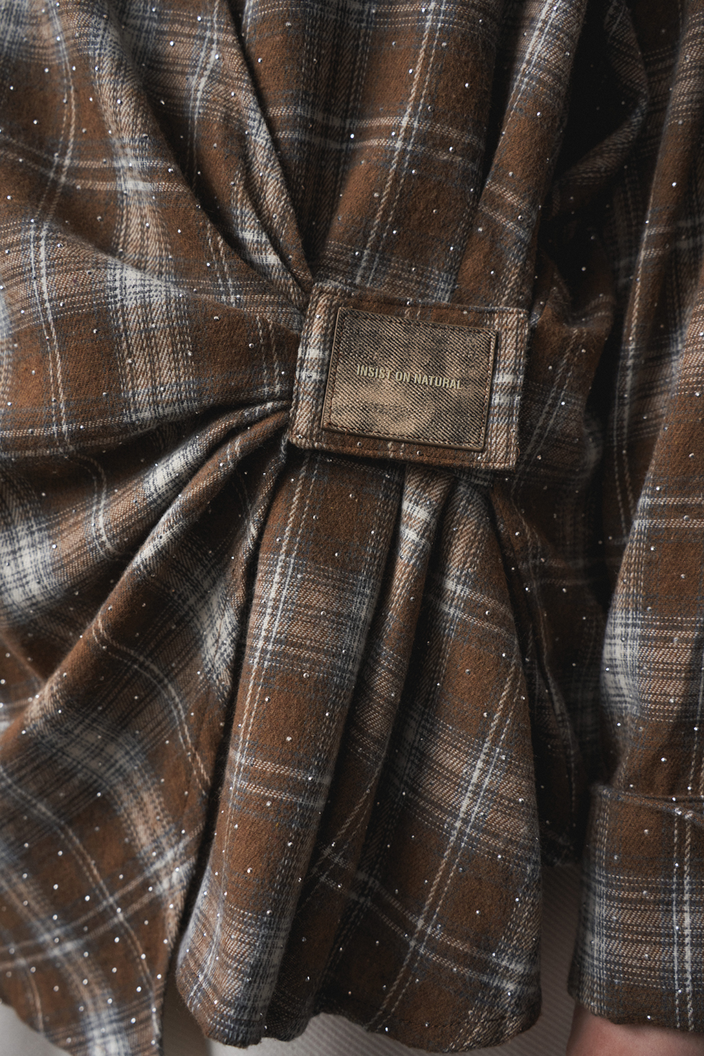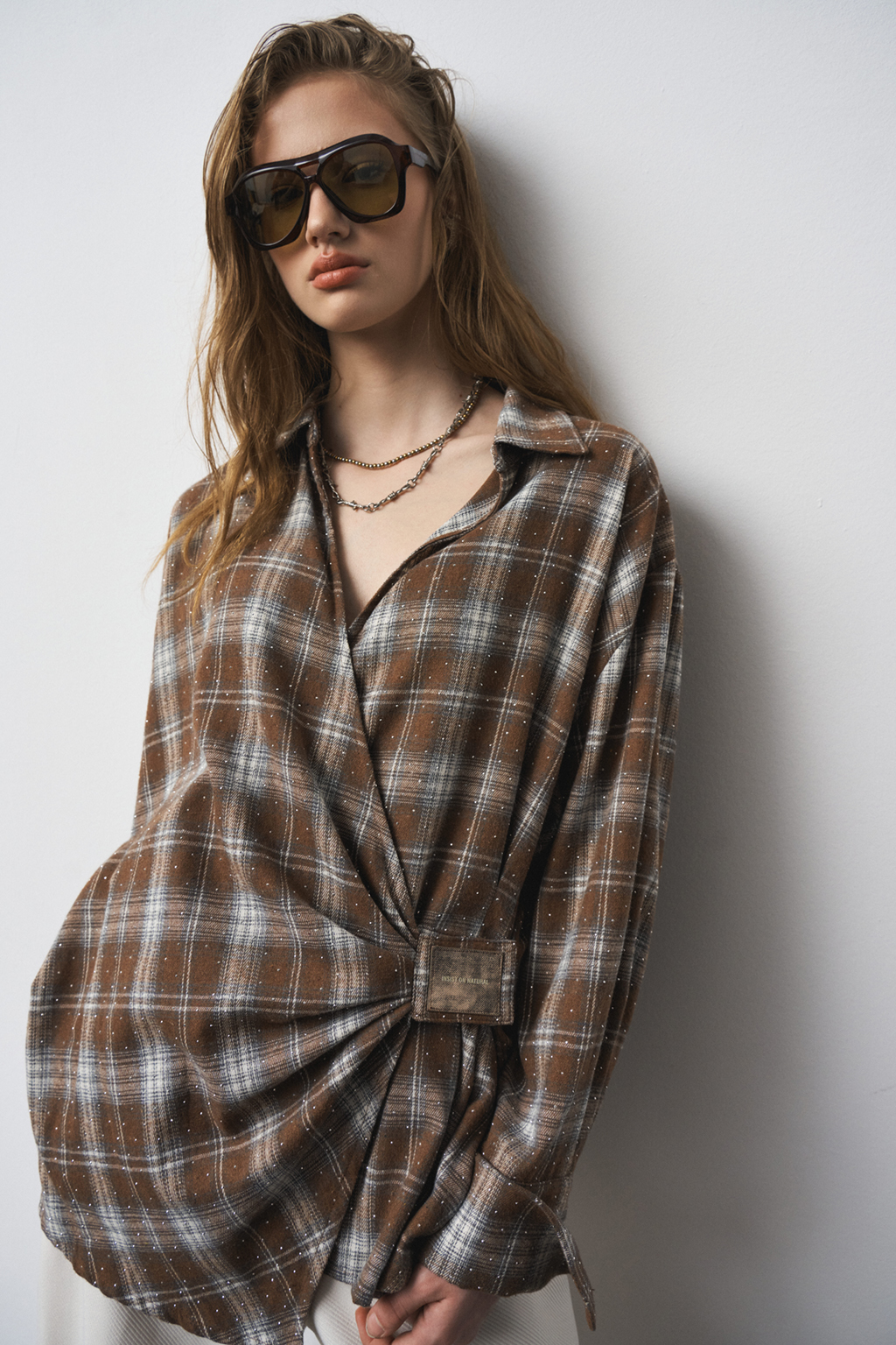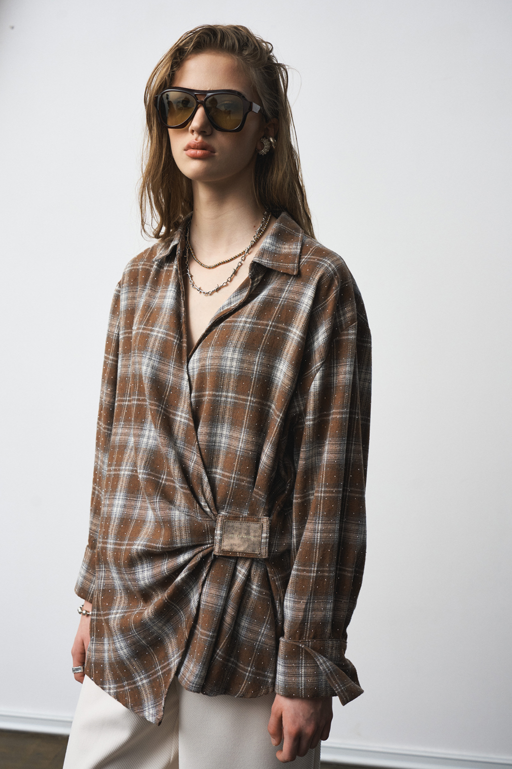 Рубашка из мягкой хлопковой фланели со стразами, асимметричной застежкой на "липучке", и декоративными складками. Свободный силуэт.