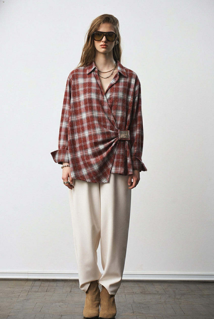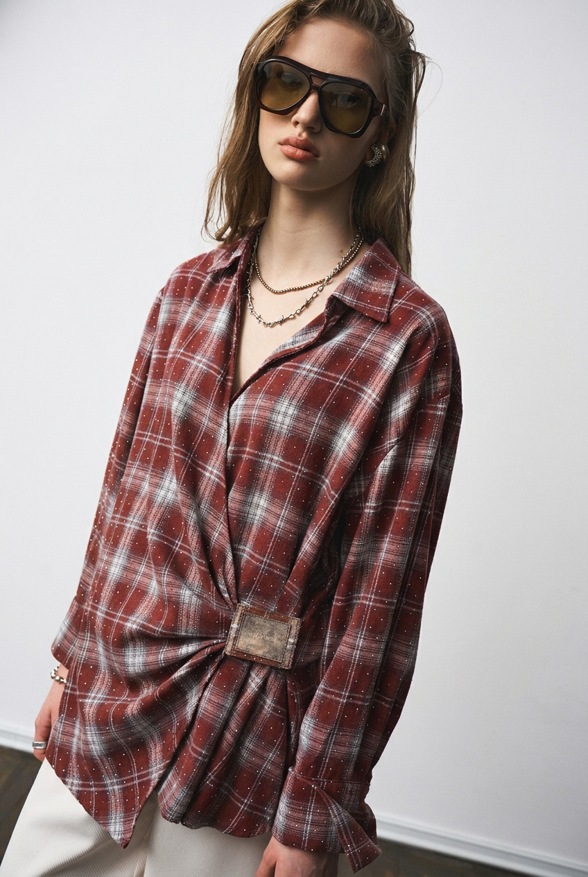 Рубашка из мягкой хлопковой фланели со стразами, асимметричной застежкой на "липучке", и декоративными складками. Свободный силуэт.