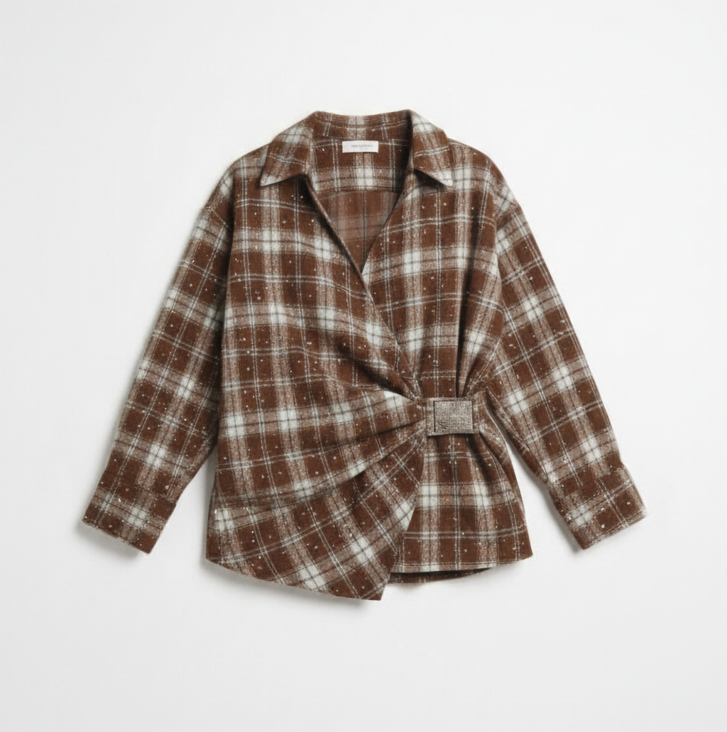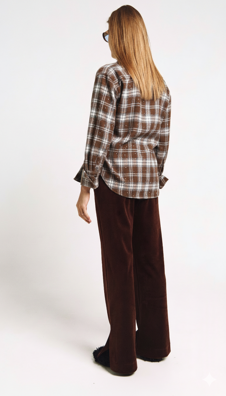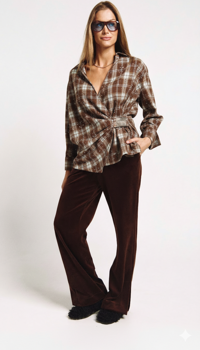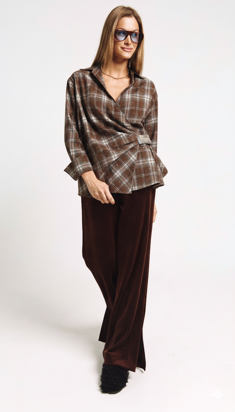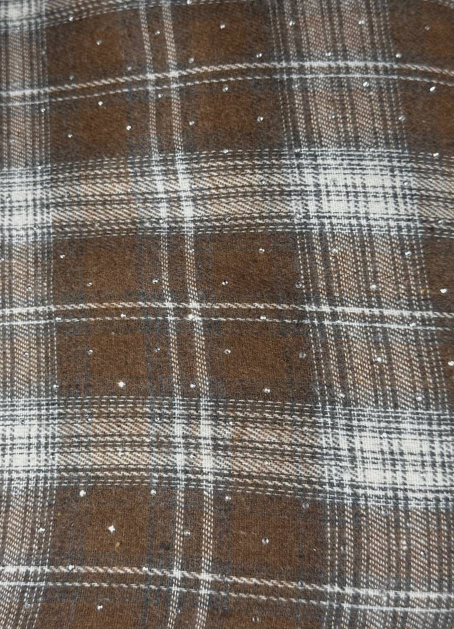Рубашка из мягкой хлопковой фланели со стразами с асимметричной застежкой на "липучке", и декоративными складками. Свободный силуэт.