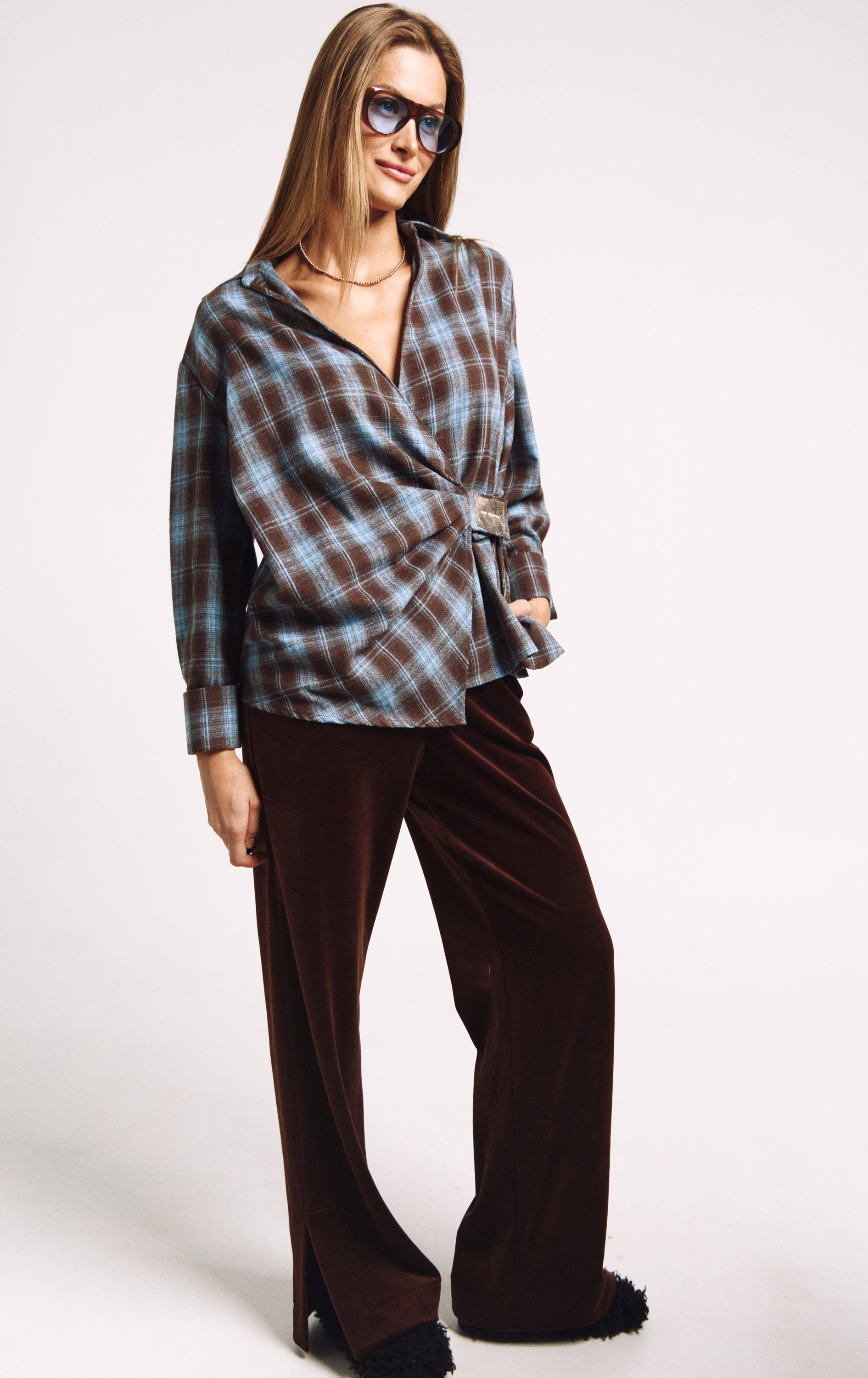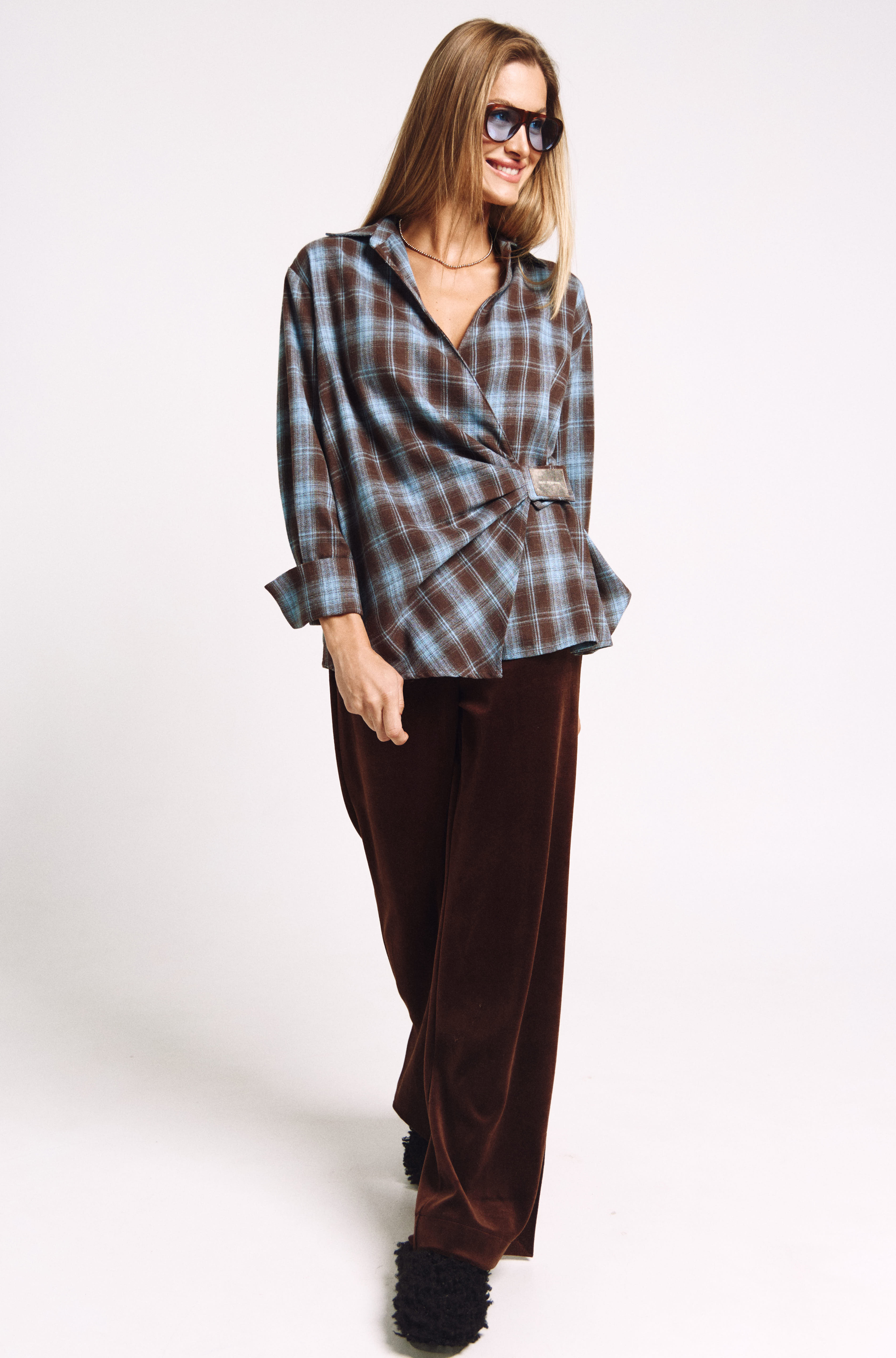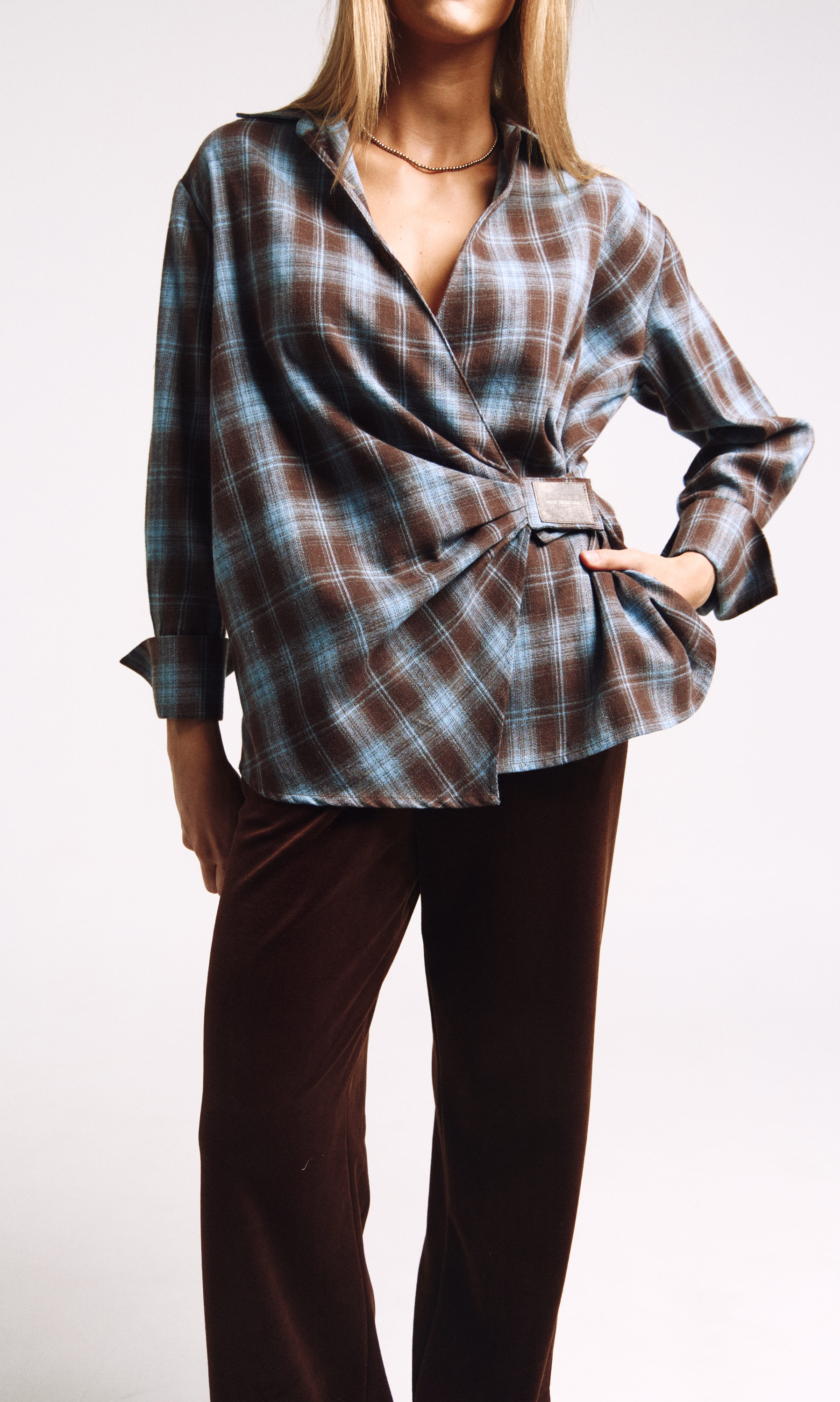 Рубашка из мягкой хлопковой фланели с асимметричной застежкой на "липучке", и декоративными складками. Свободный силуэт.