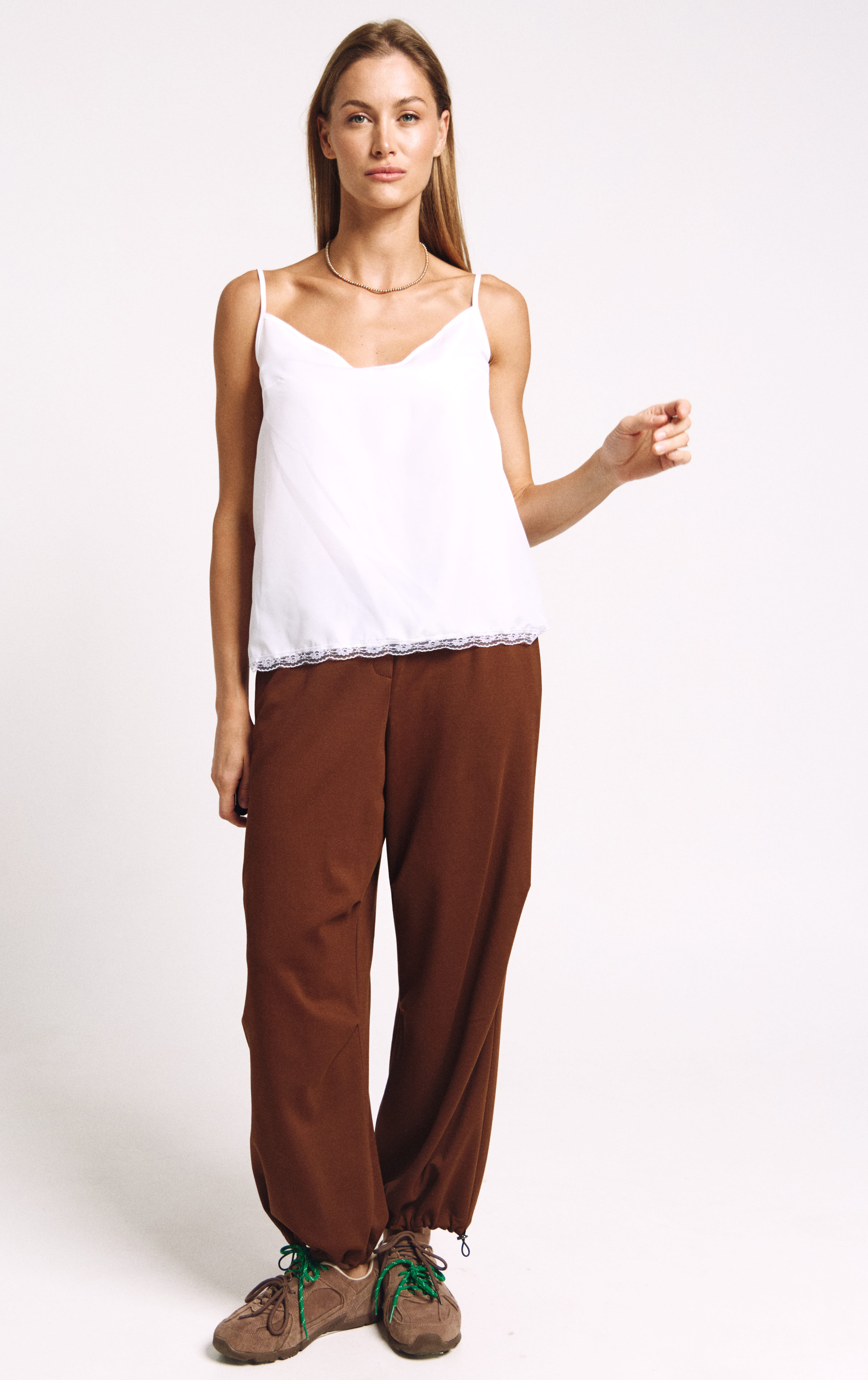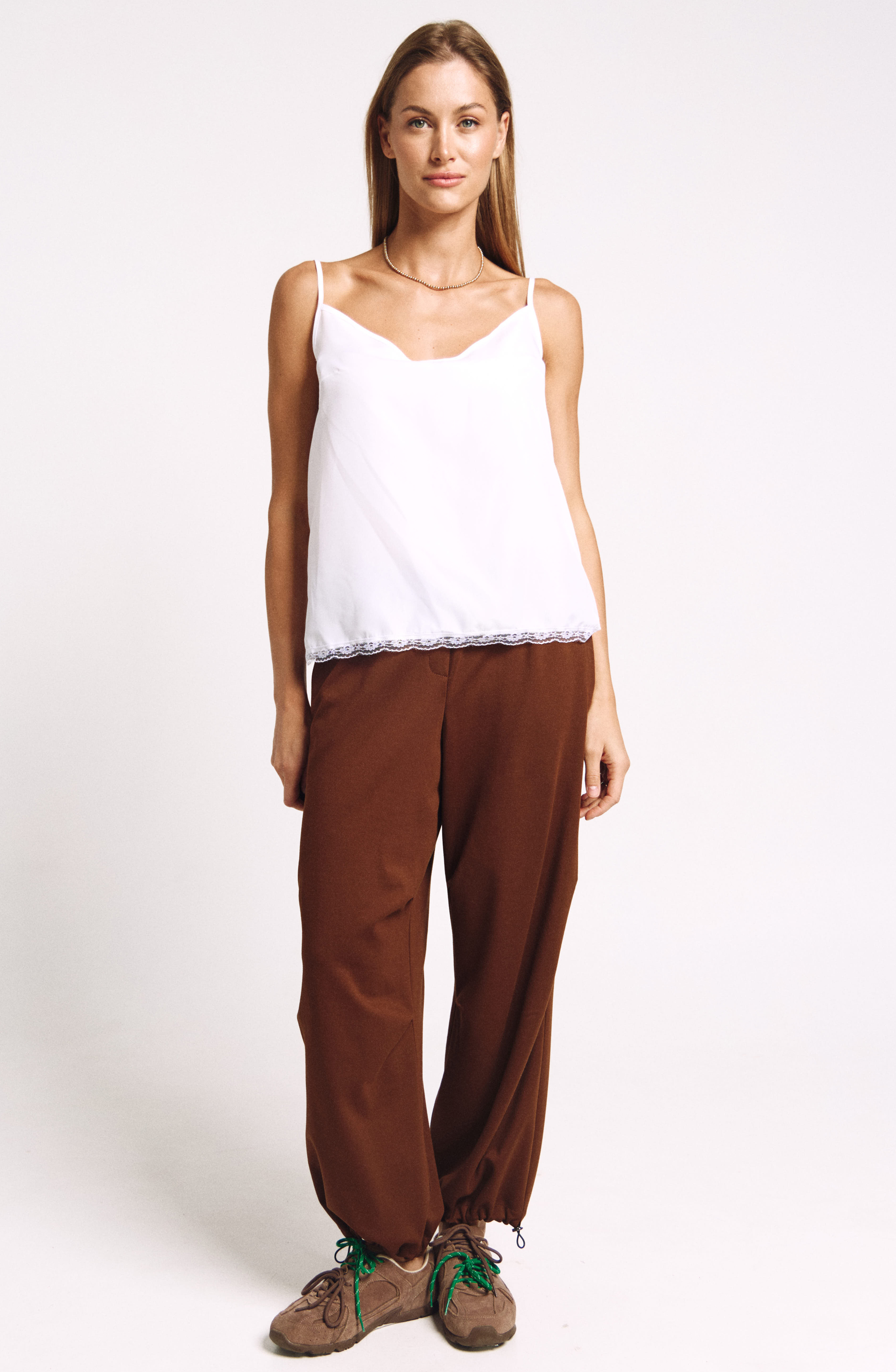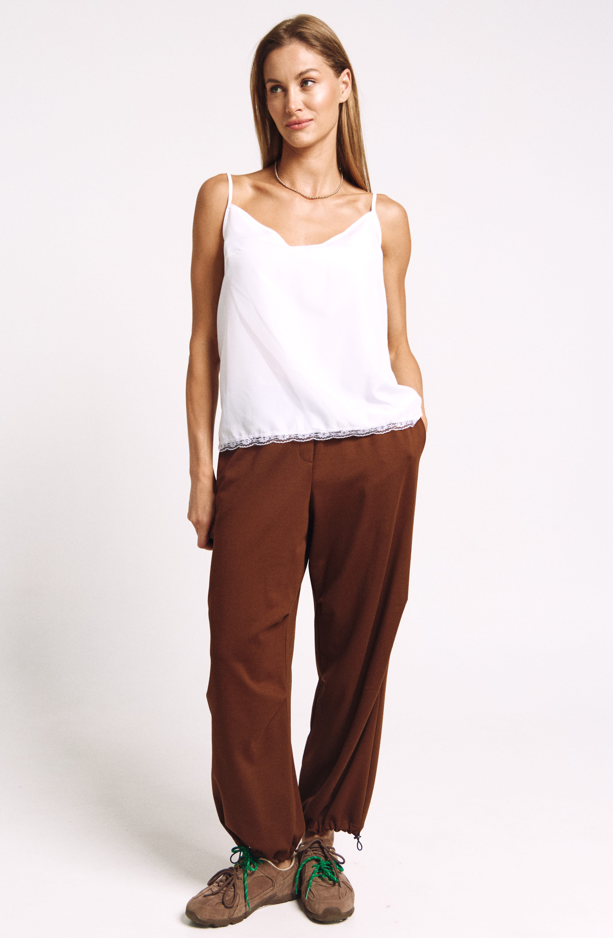 Комбинация с регулируемыми бретелями и тонким коужевом по низу. Прямой силуэт.