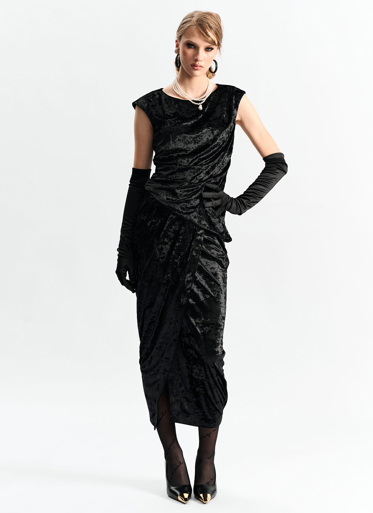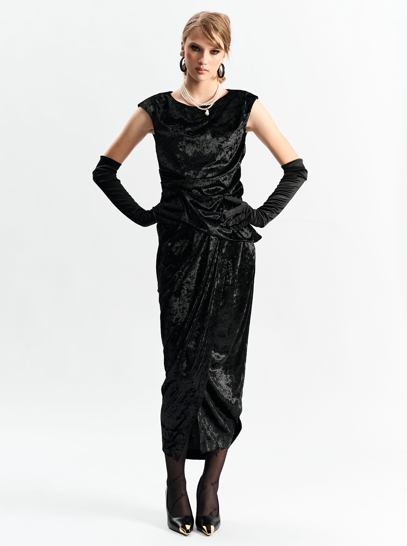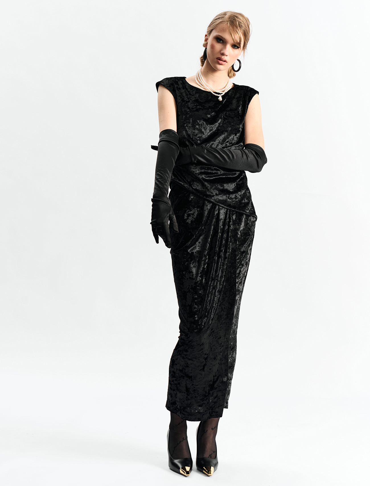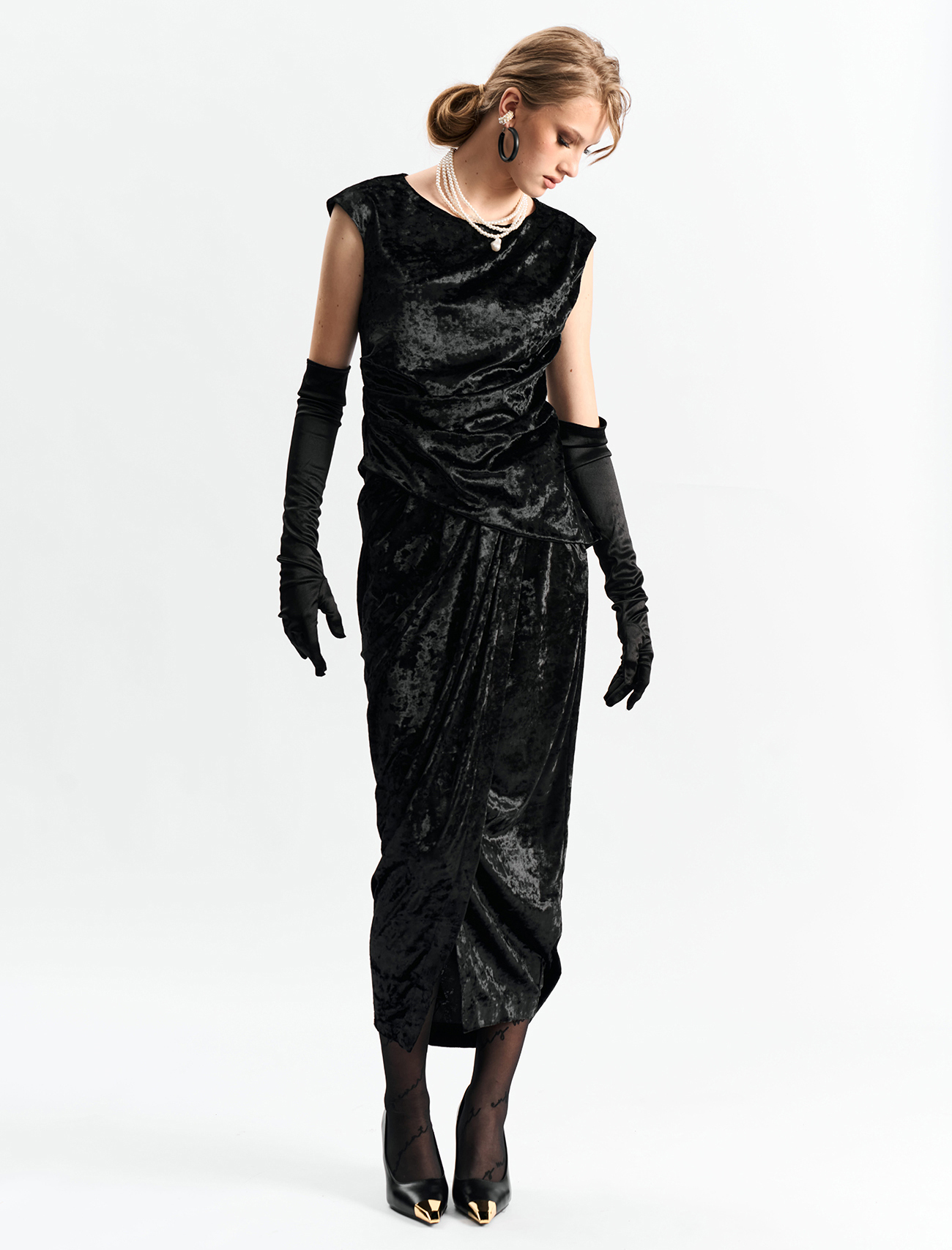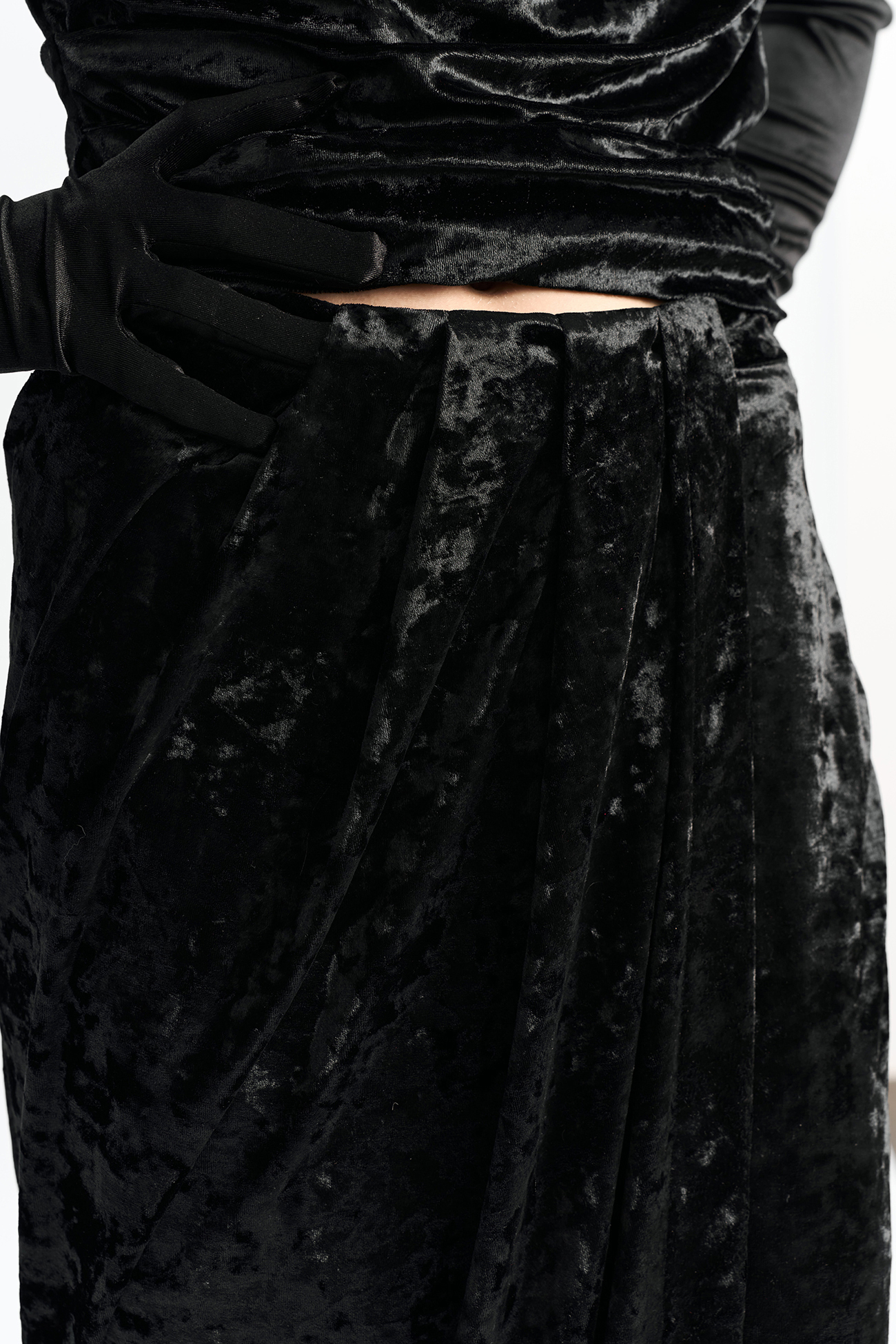 Юбка длины "миди" из фактурного бархата на запАх. По переду в поясе заложены конструктивные складки.Состав: 100% полиэстер