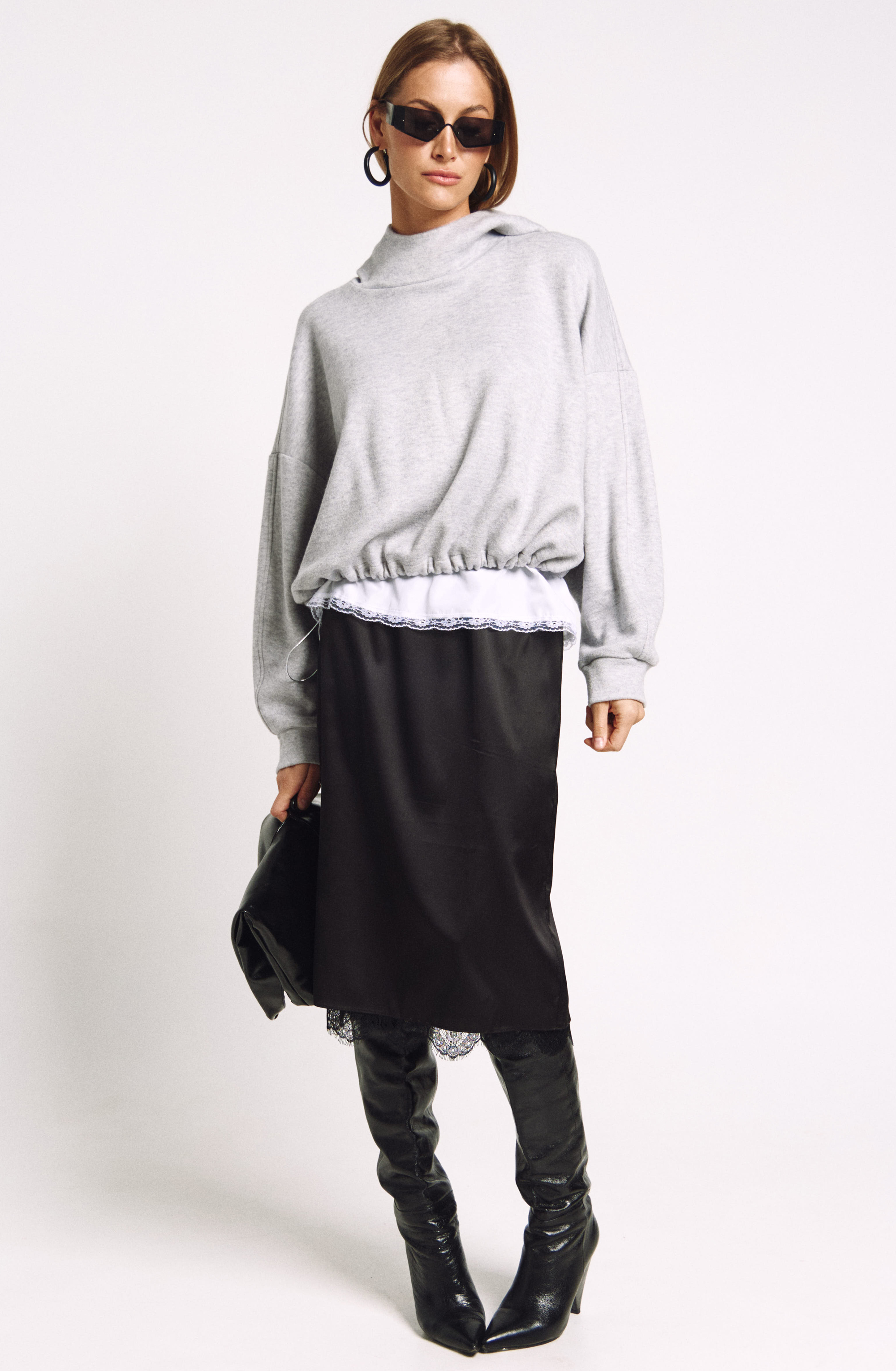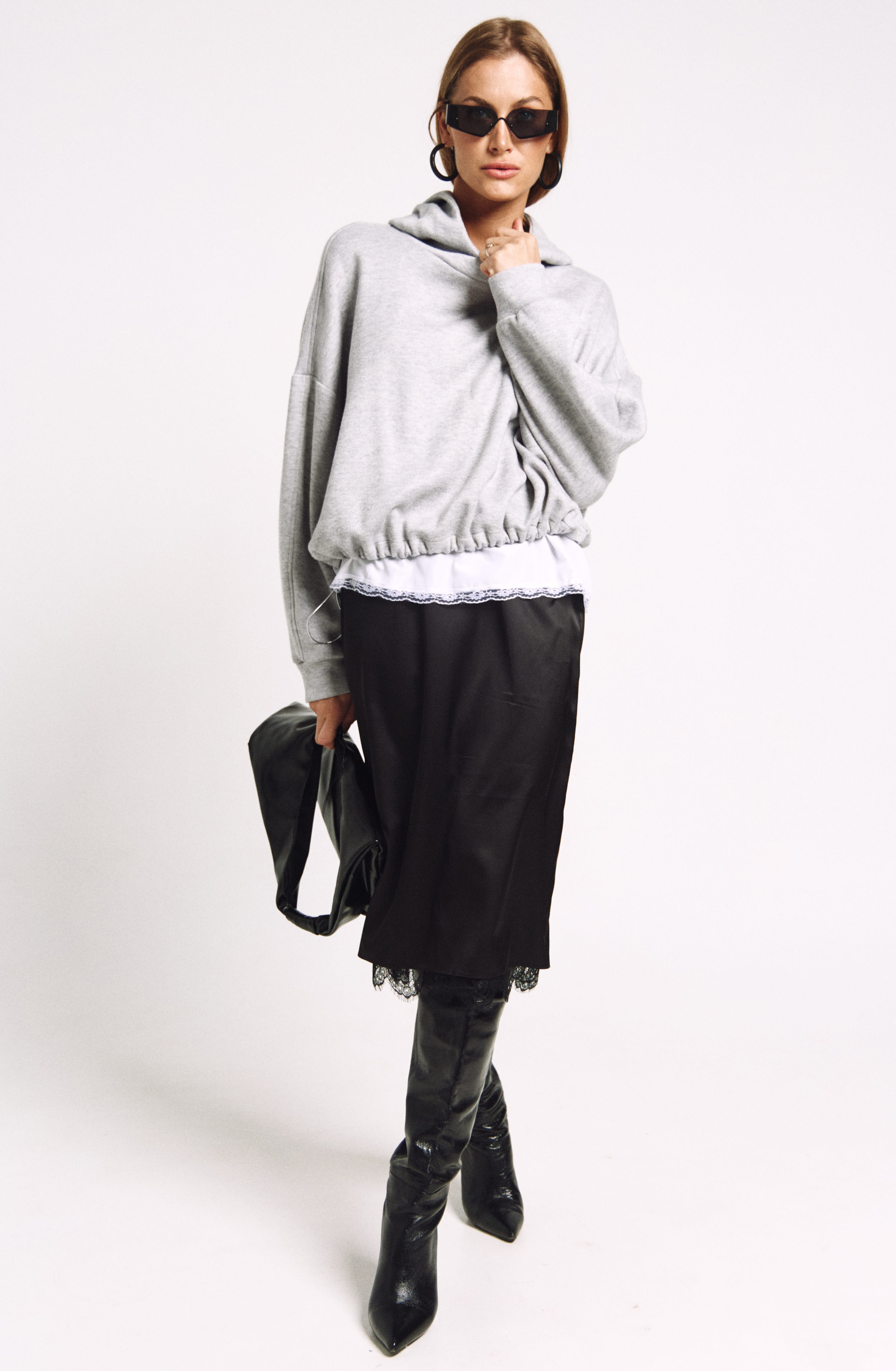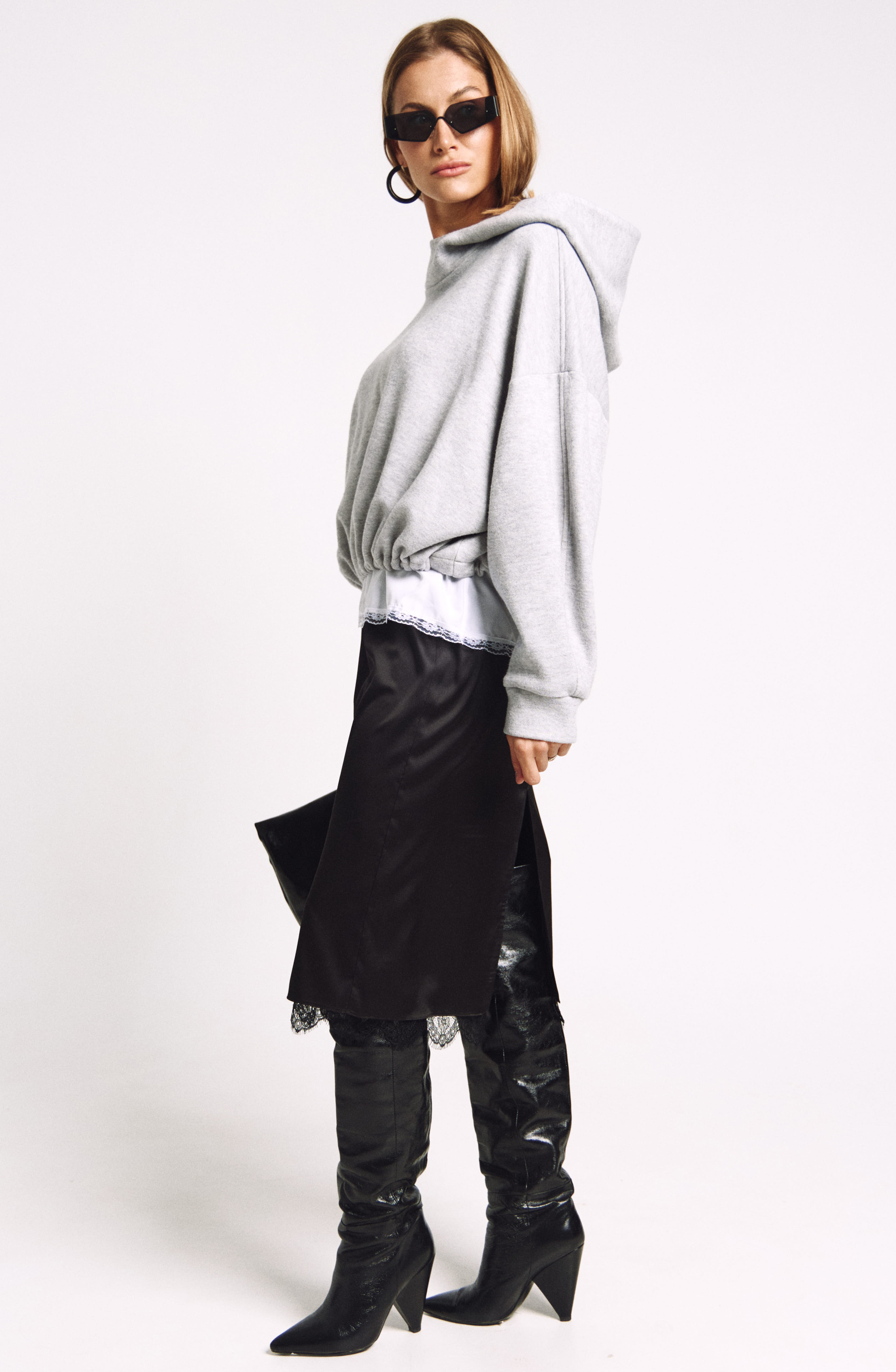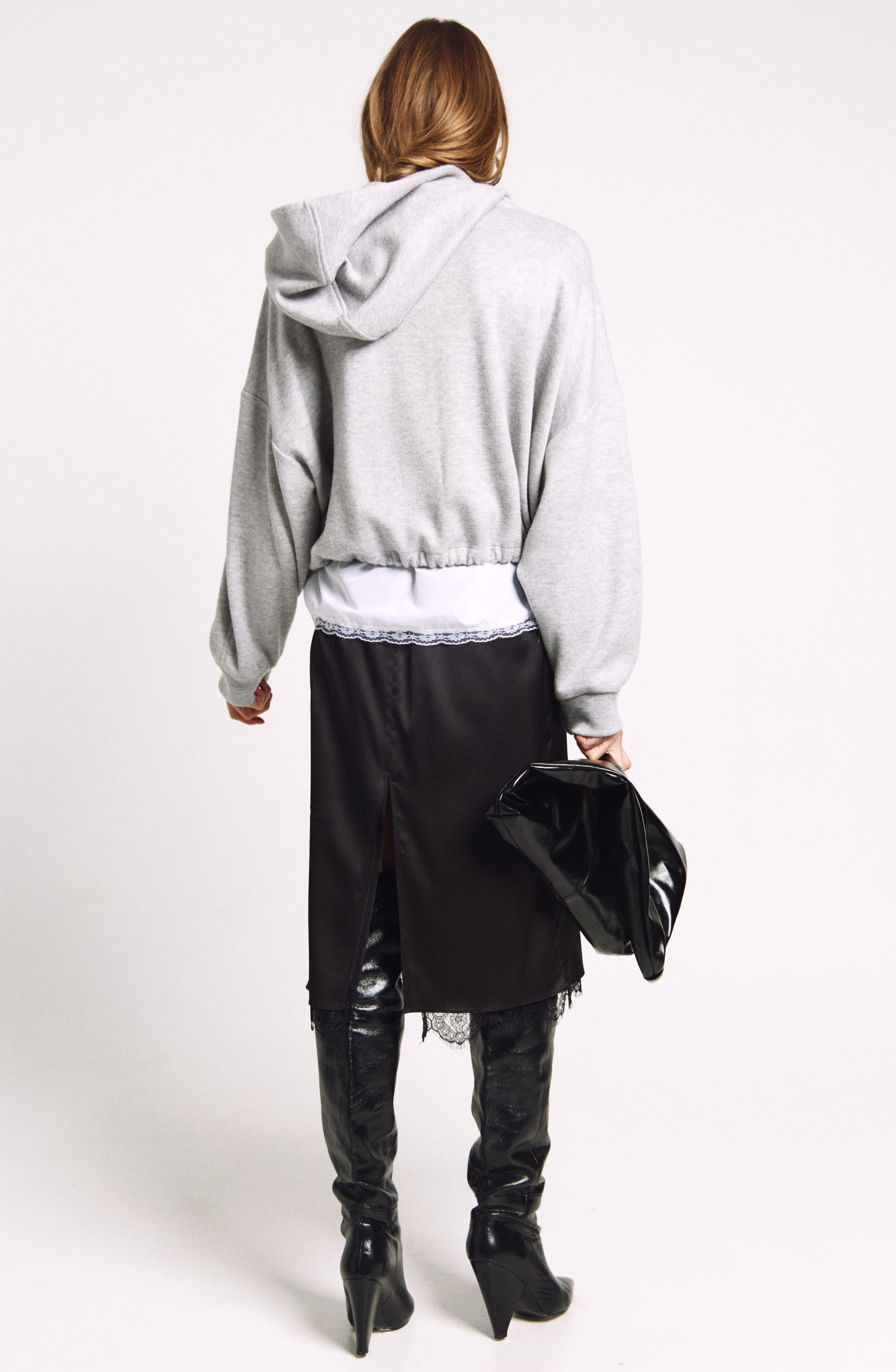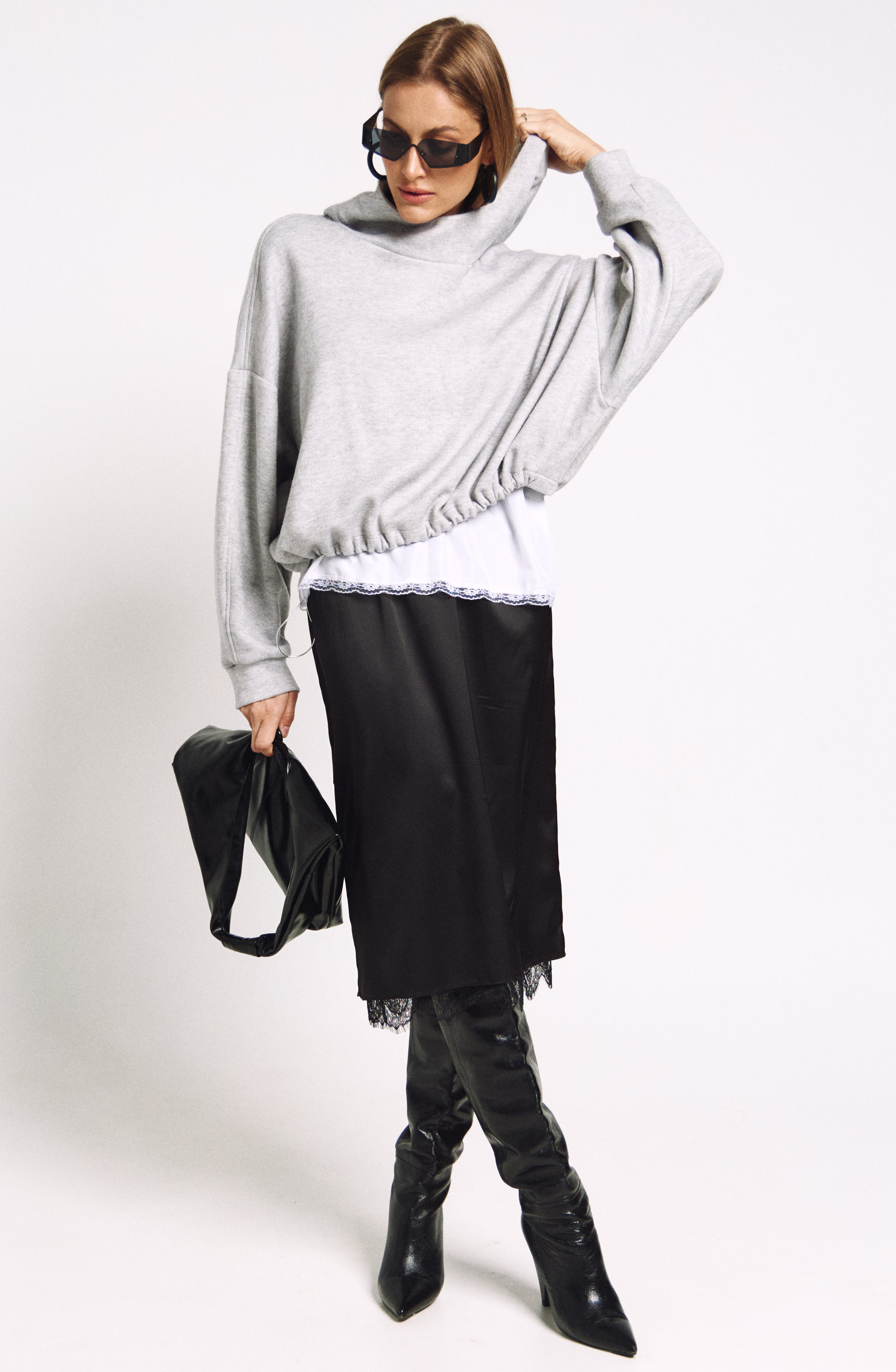 Юбка прямого силуэта на подкладке, к низу подкладки притачано французское кружево черного цвета. Сзади юбки - высокий разрез.