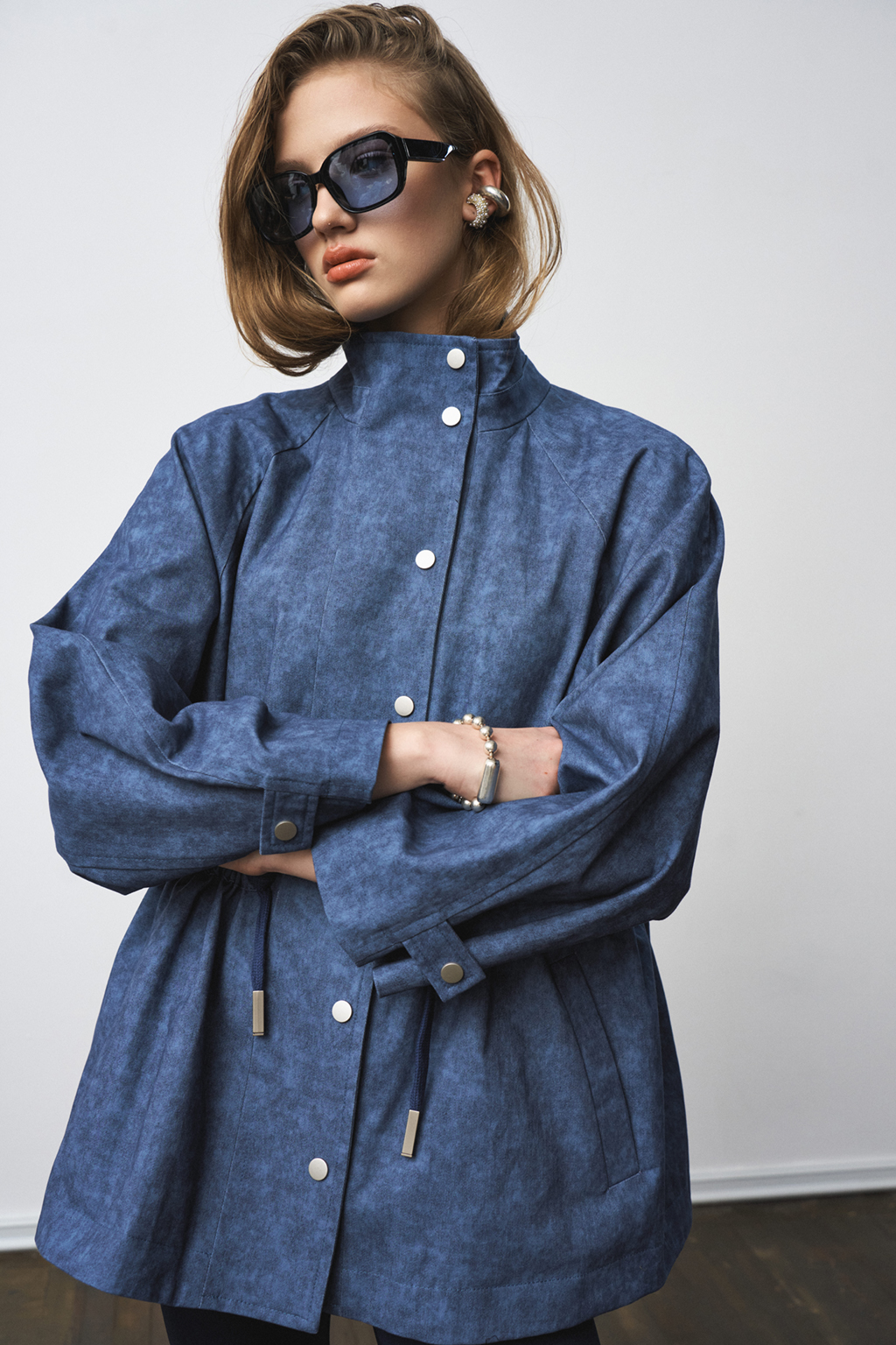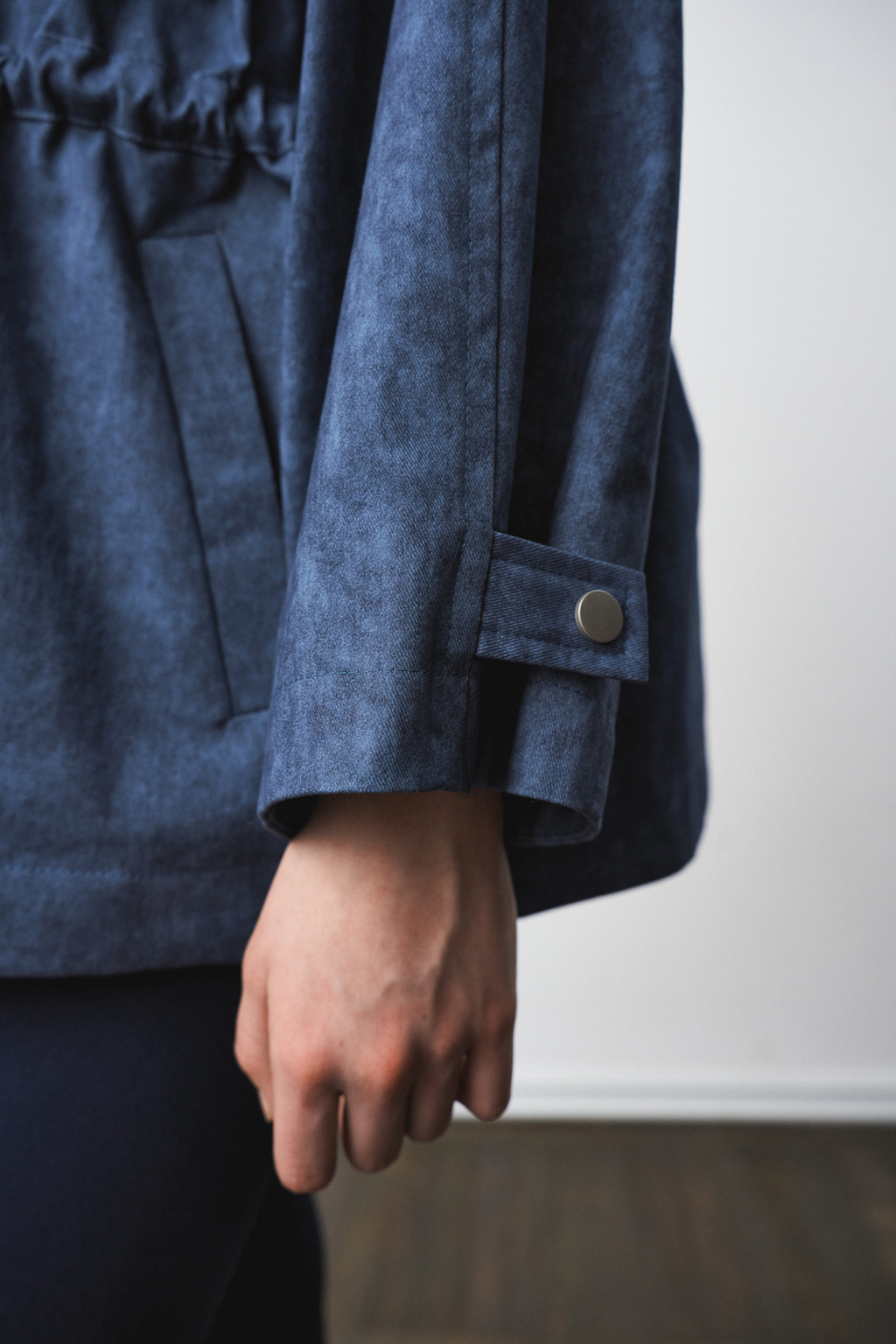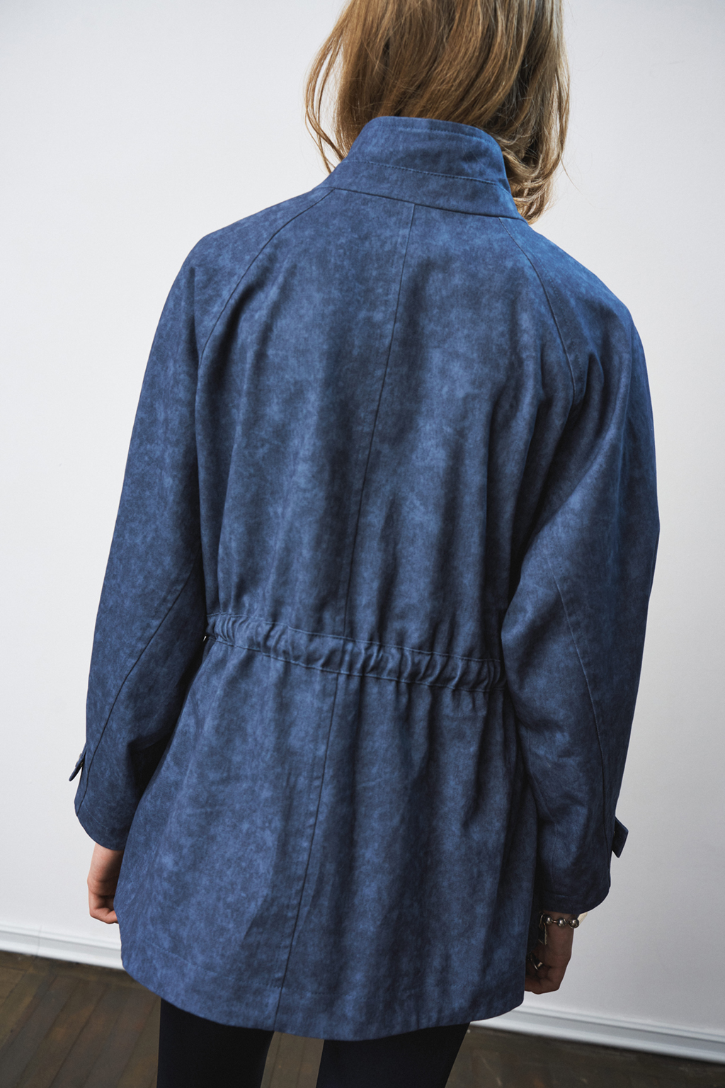 Жакет-парка из фактурного джинса с эффектом замши. Воротник-стойка. Широкий рукав, ширина которого регулируется кнопками. Свободный силуэт, ширина талии регулируется кулиской.