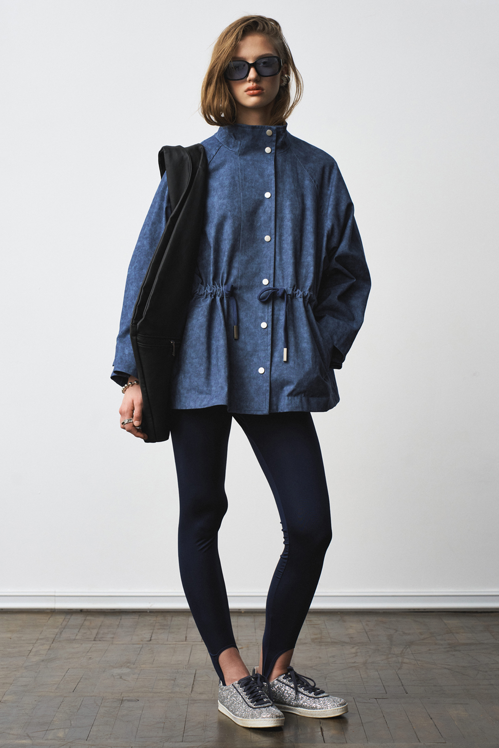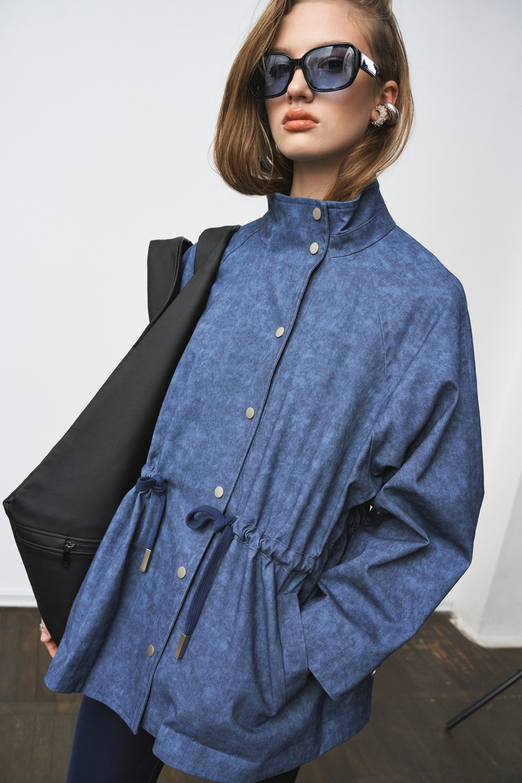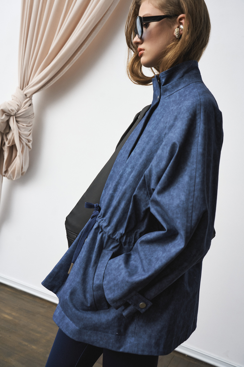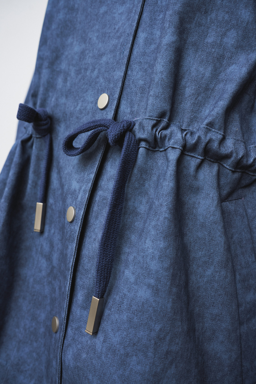 Жакет-парка из фактурного джинса с эффектом замши. Воротник-стойка. Широкий рукав, ширина которого регулируется кнопками. Свободный силуэт, ширина талии регулируется кулиской.